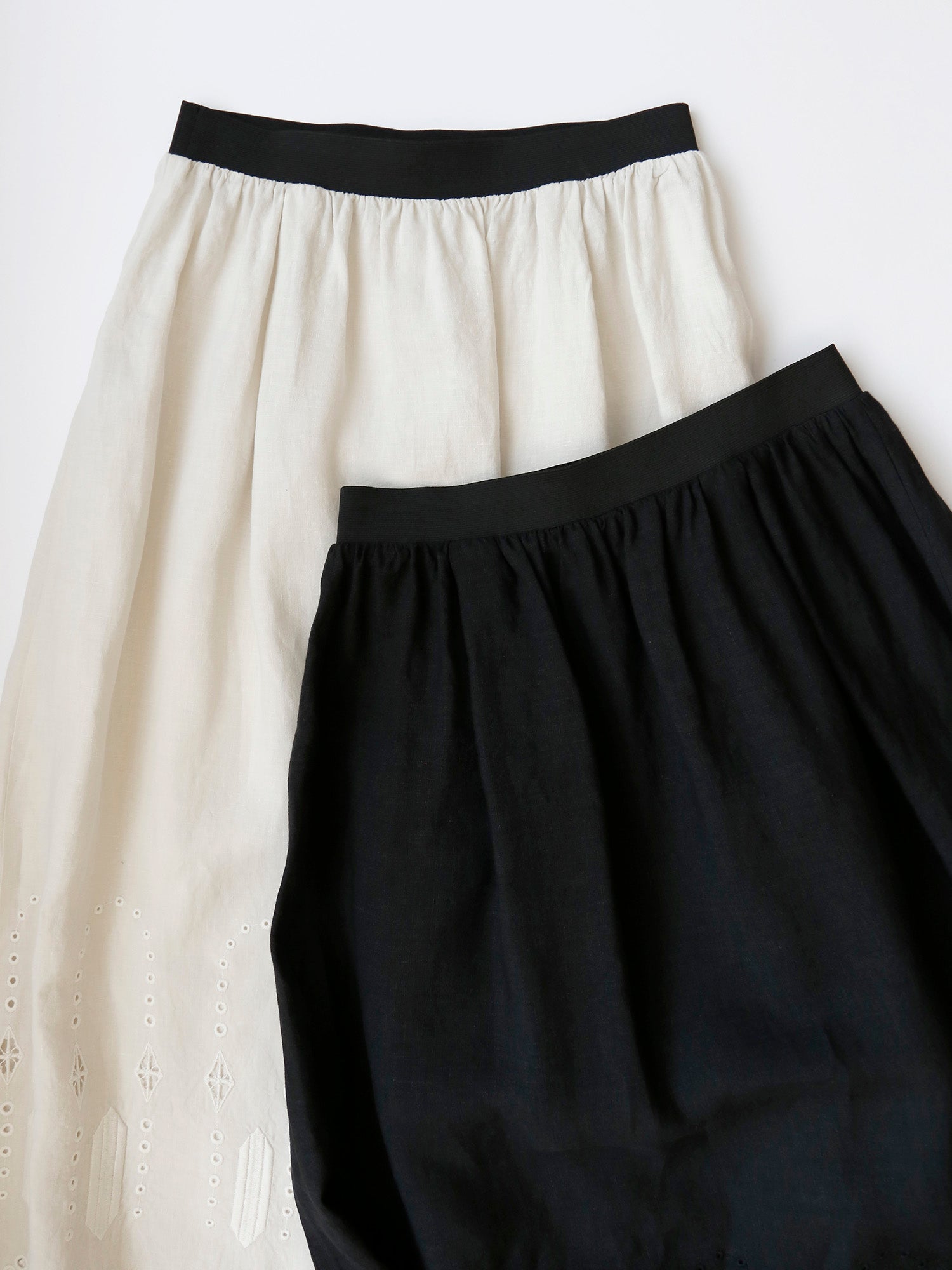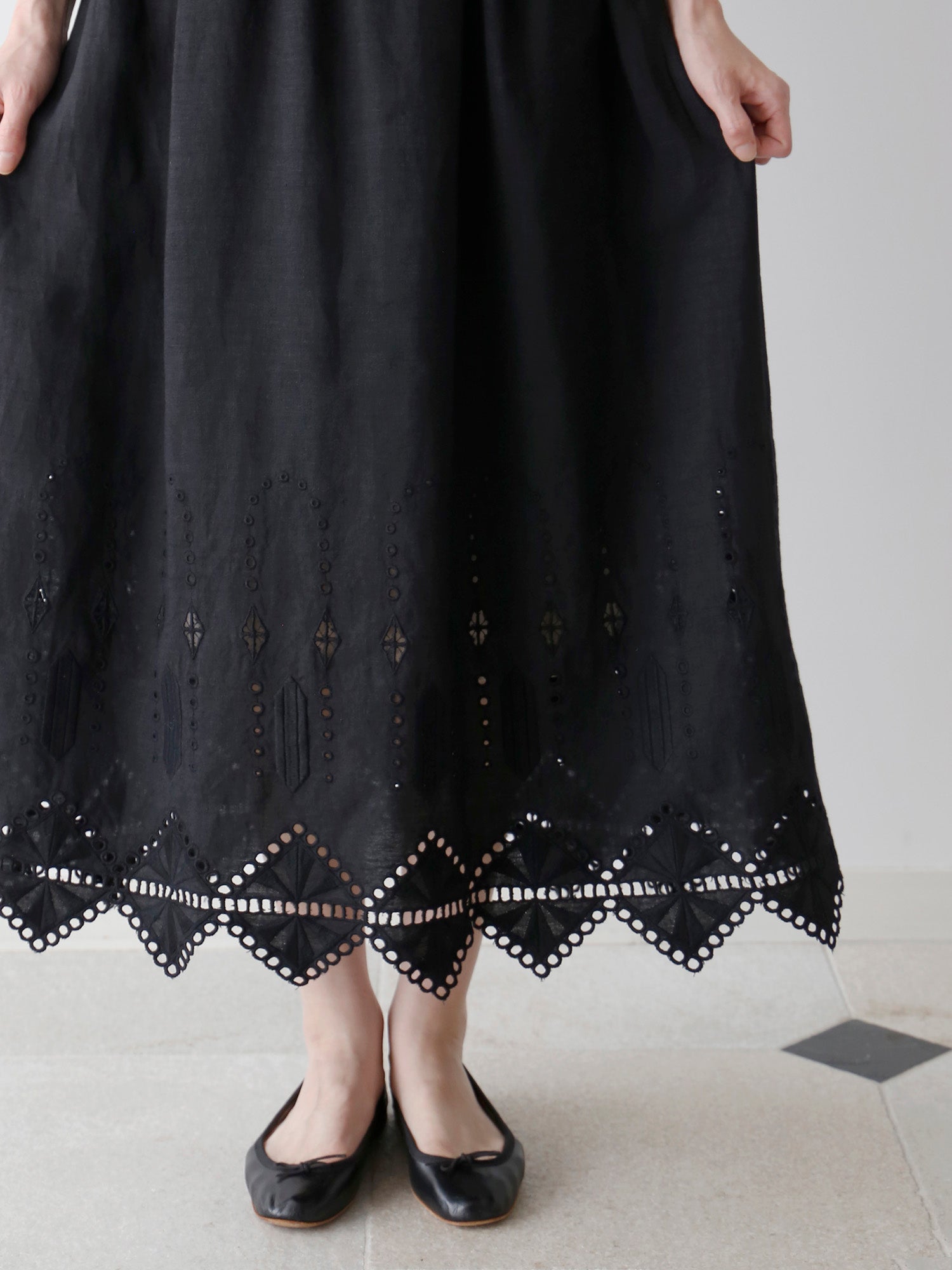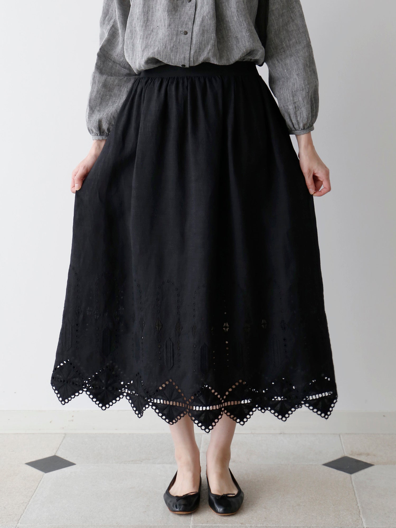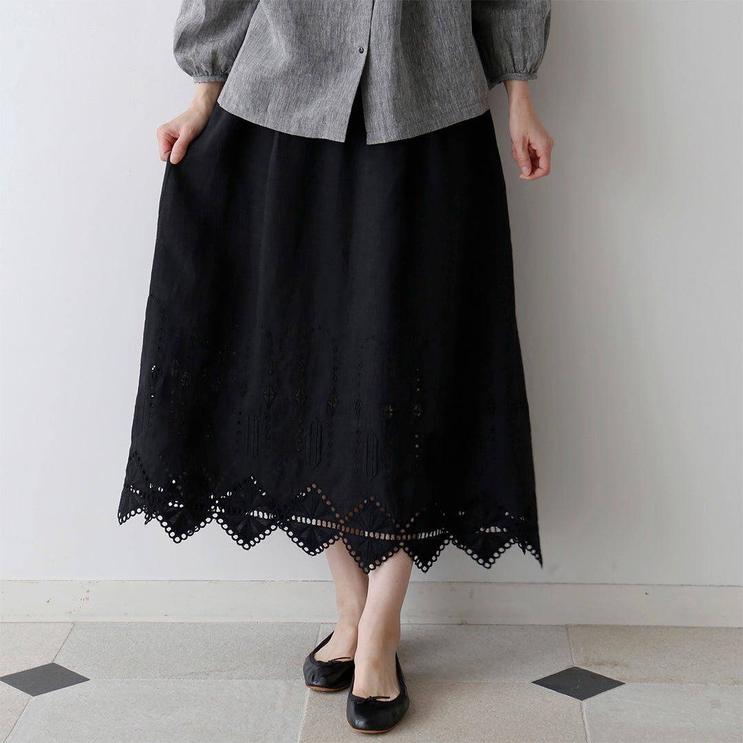ノアール(黒)は、裾の刺繍とレースの透け感が際立ち、涼しげで軽やかな印象に。そのため、トップスに黒を合わせたワントーンコーディネートでも重たくなりません。