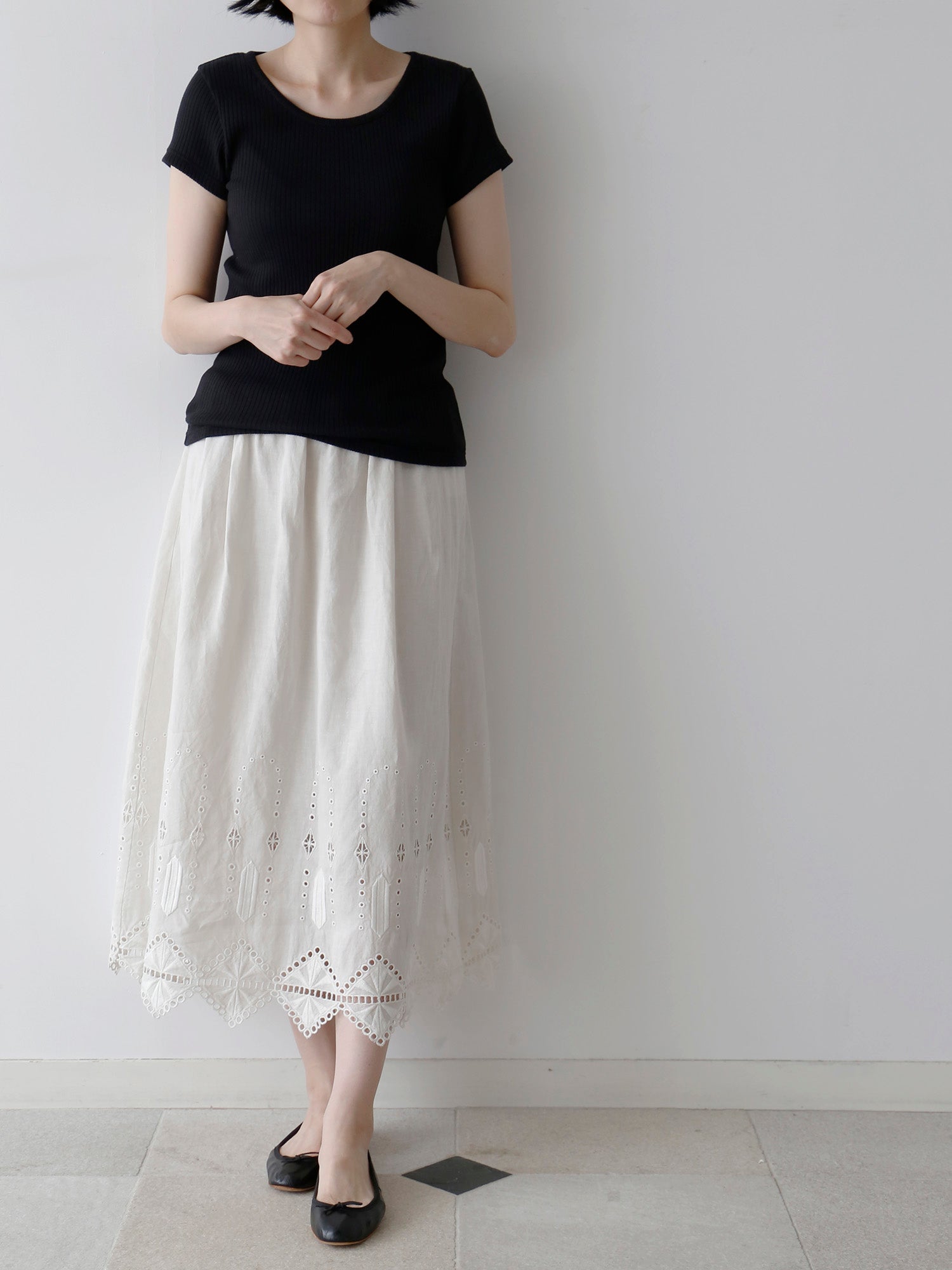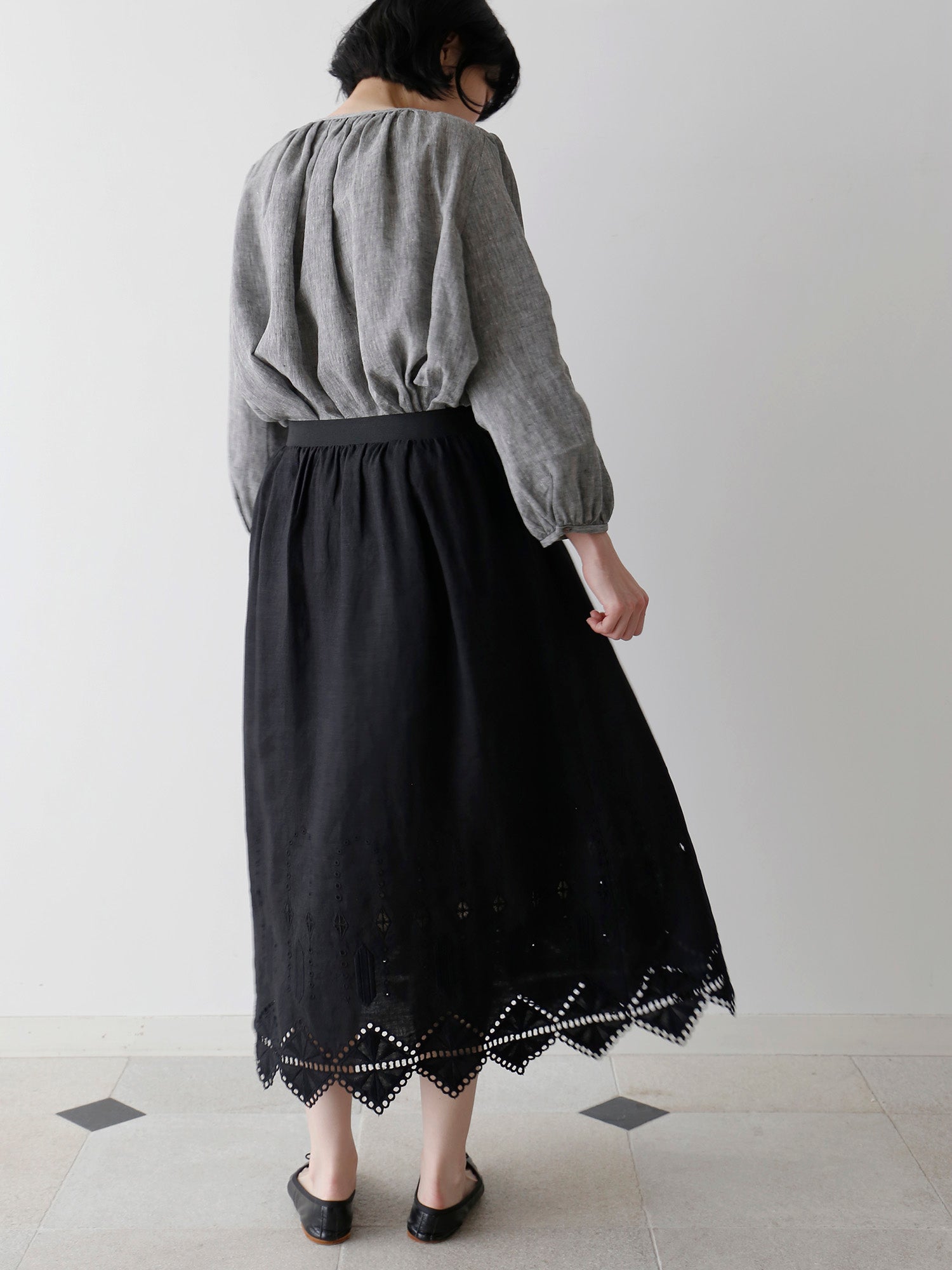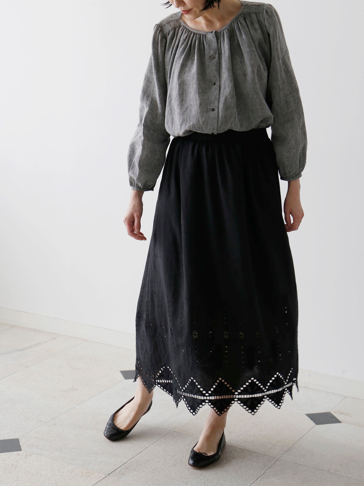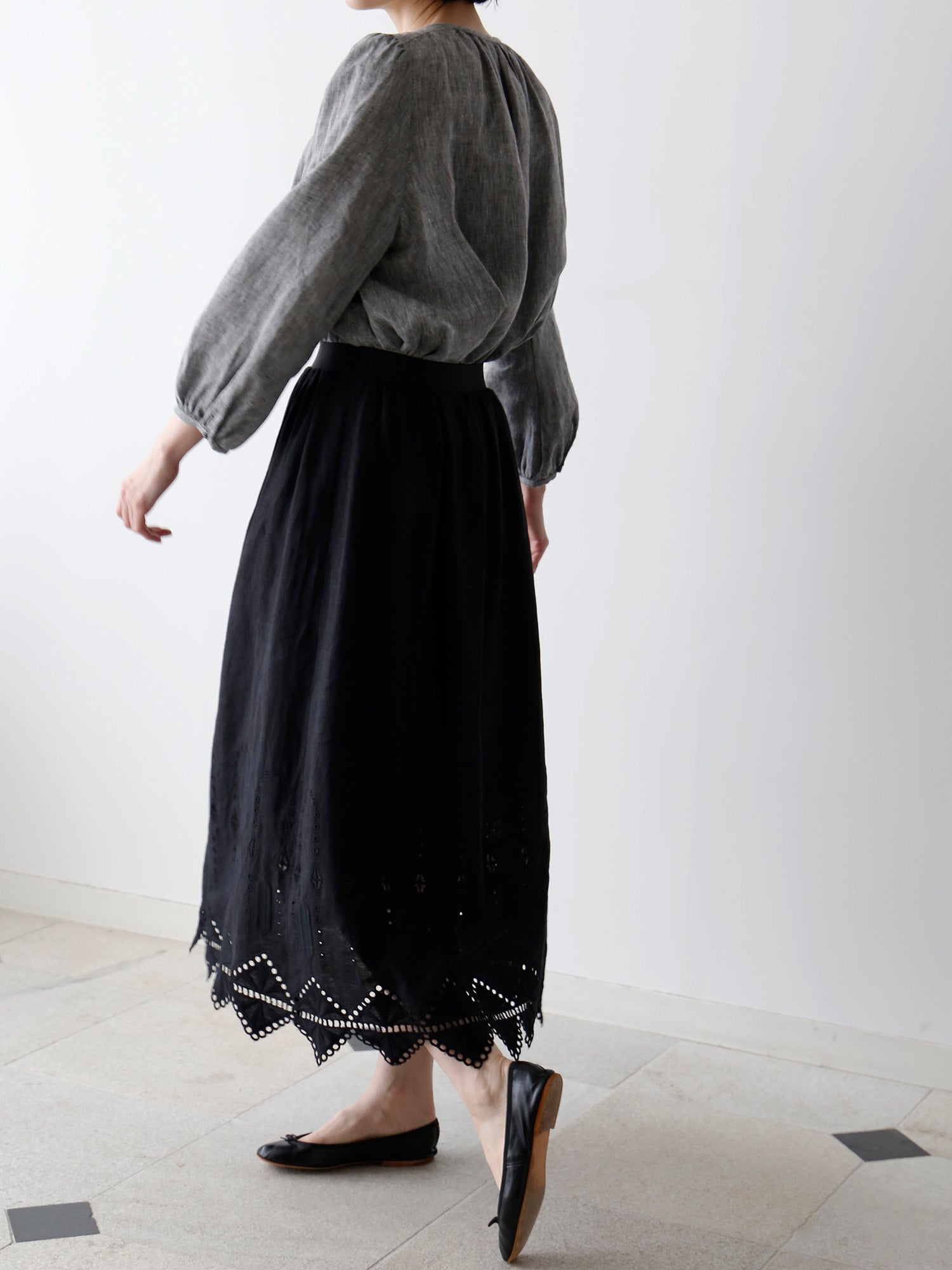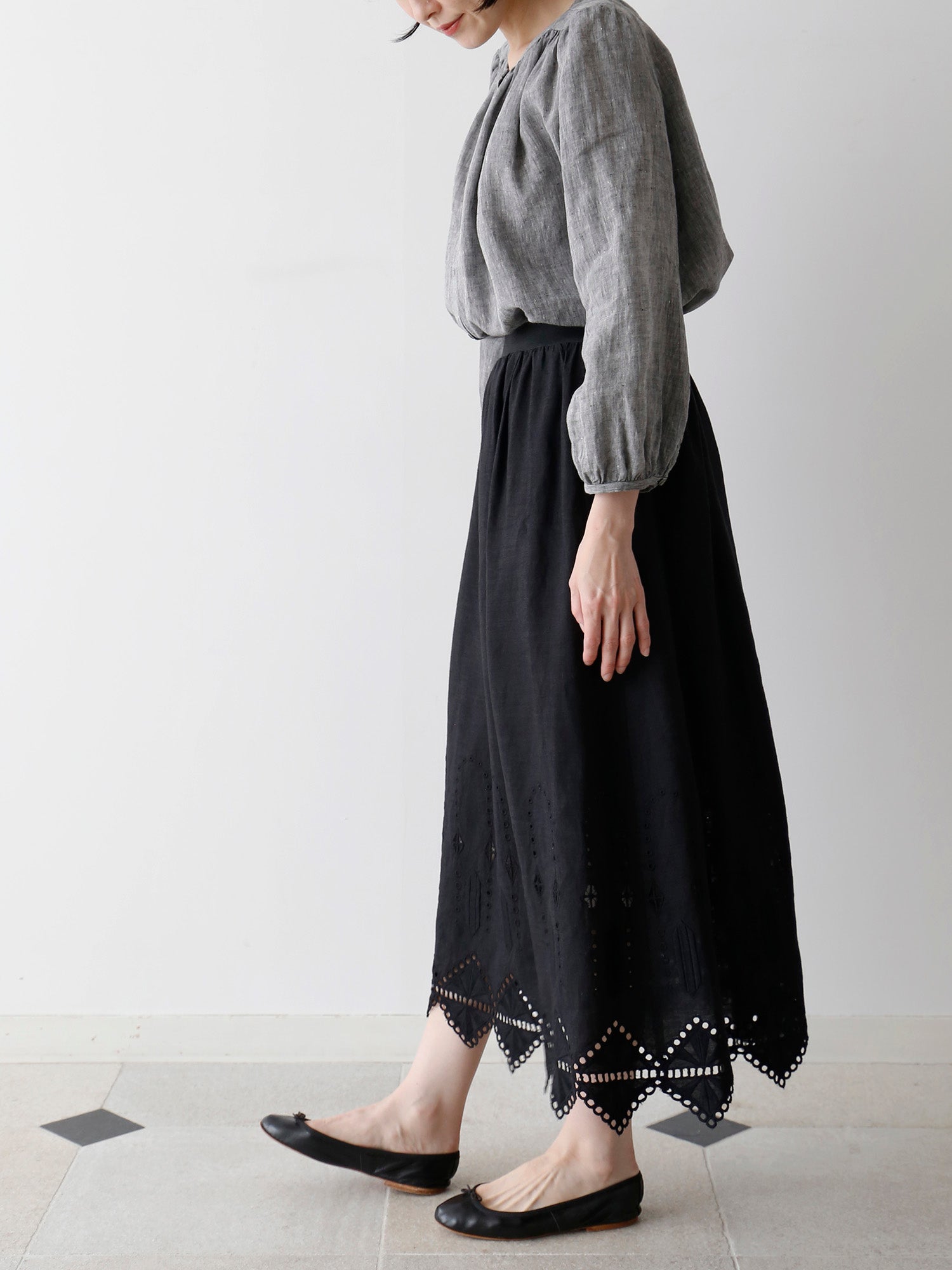 ノアール(黒)は、裾の刺繍とレースの透け感が際立ち、涼しげで軽やかな印象に。そのため、トップスに黒を合わせたワントーンコーディネートでも重たくなりません。