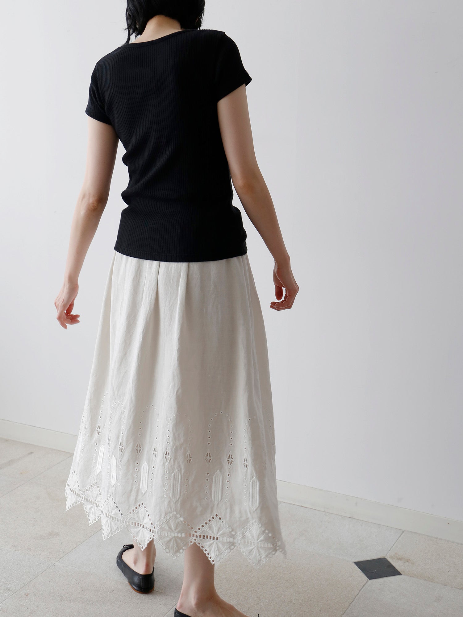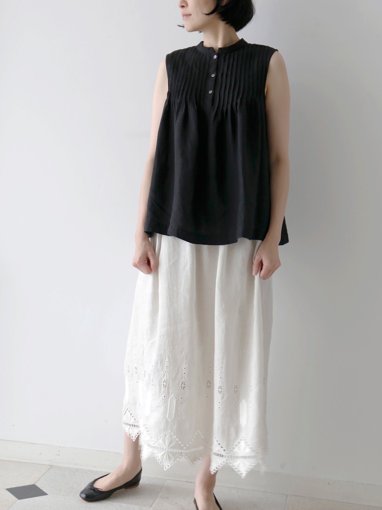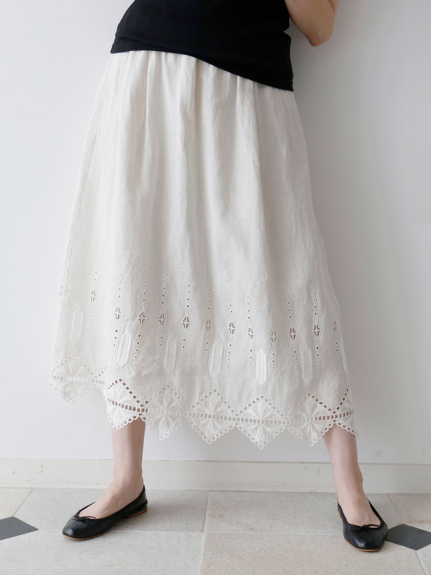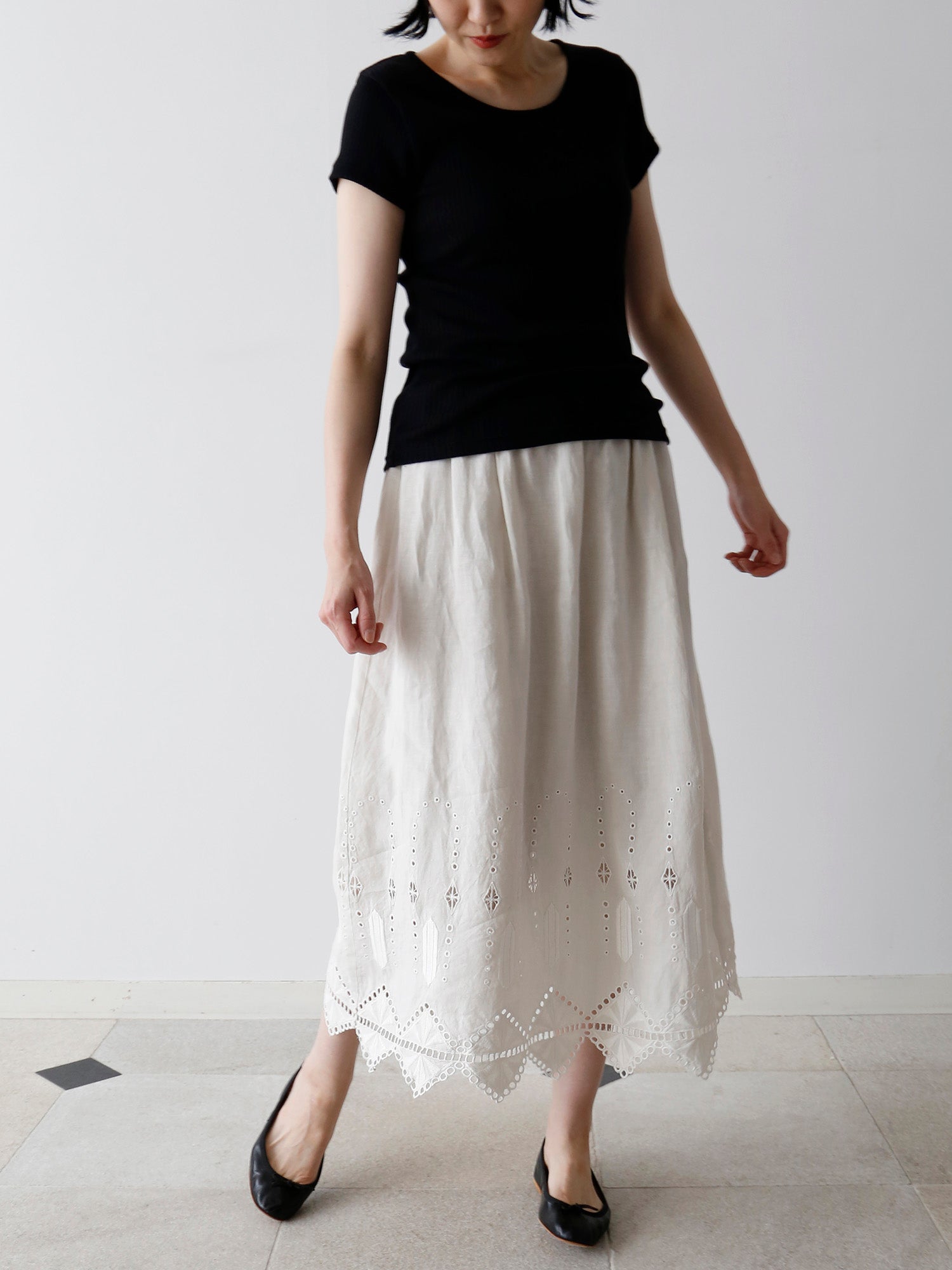 ノアール(黒)は、裾の刺繍とレースの透け感が際立ち、涼しげで軽やかな印象に。そのため、トップスに黒を合わせたワントーンコーディネートでも重たくなりません。