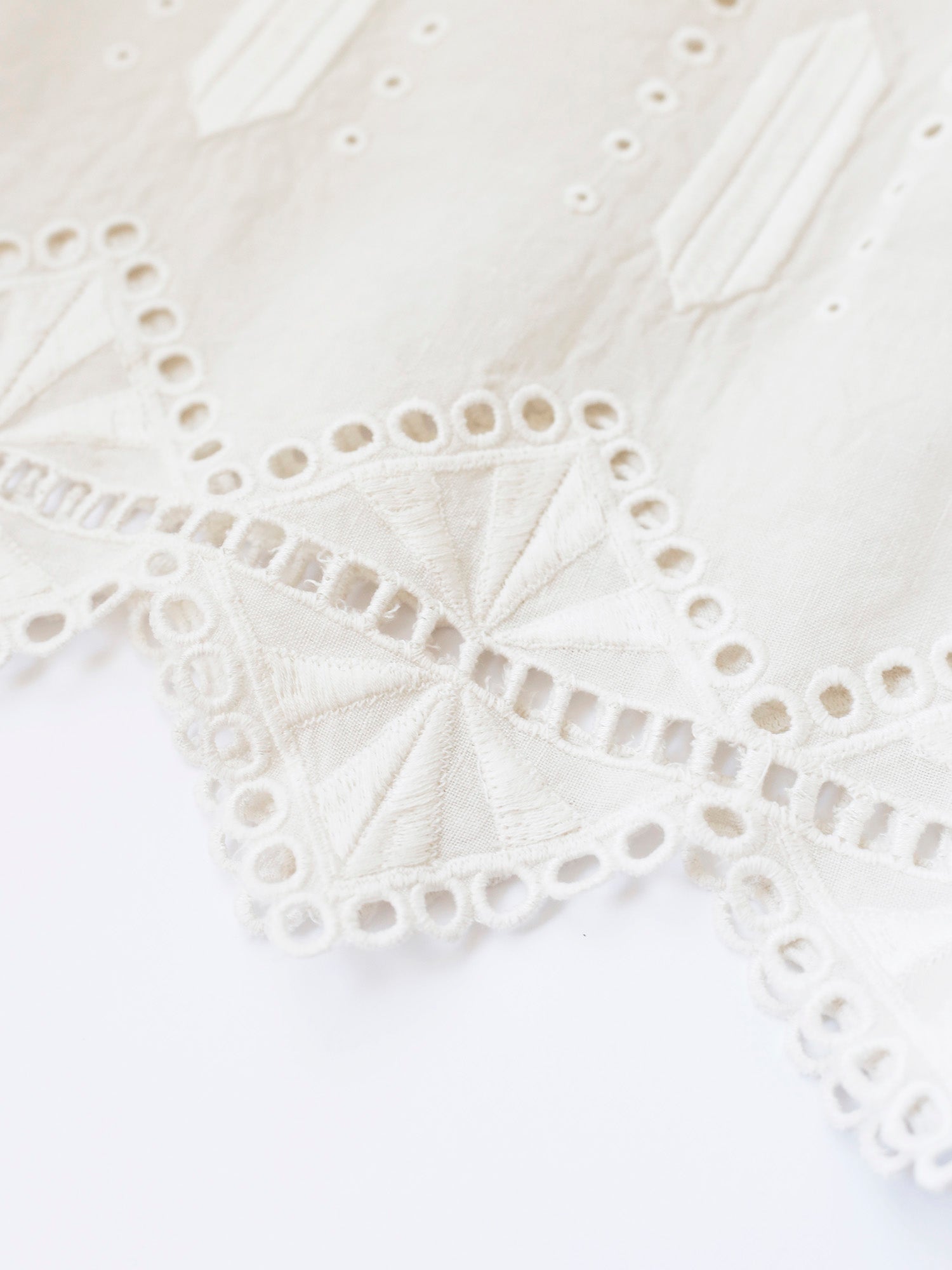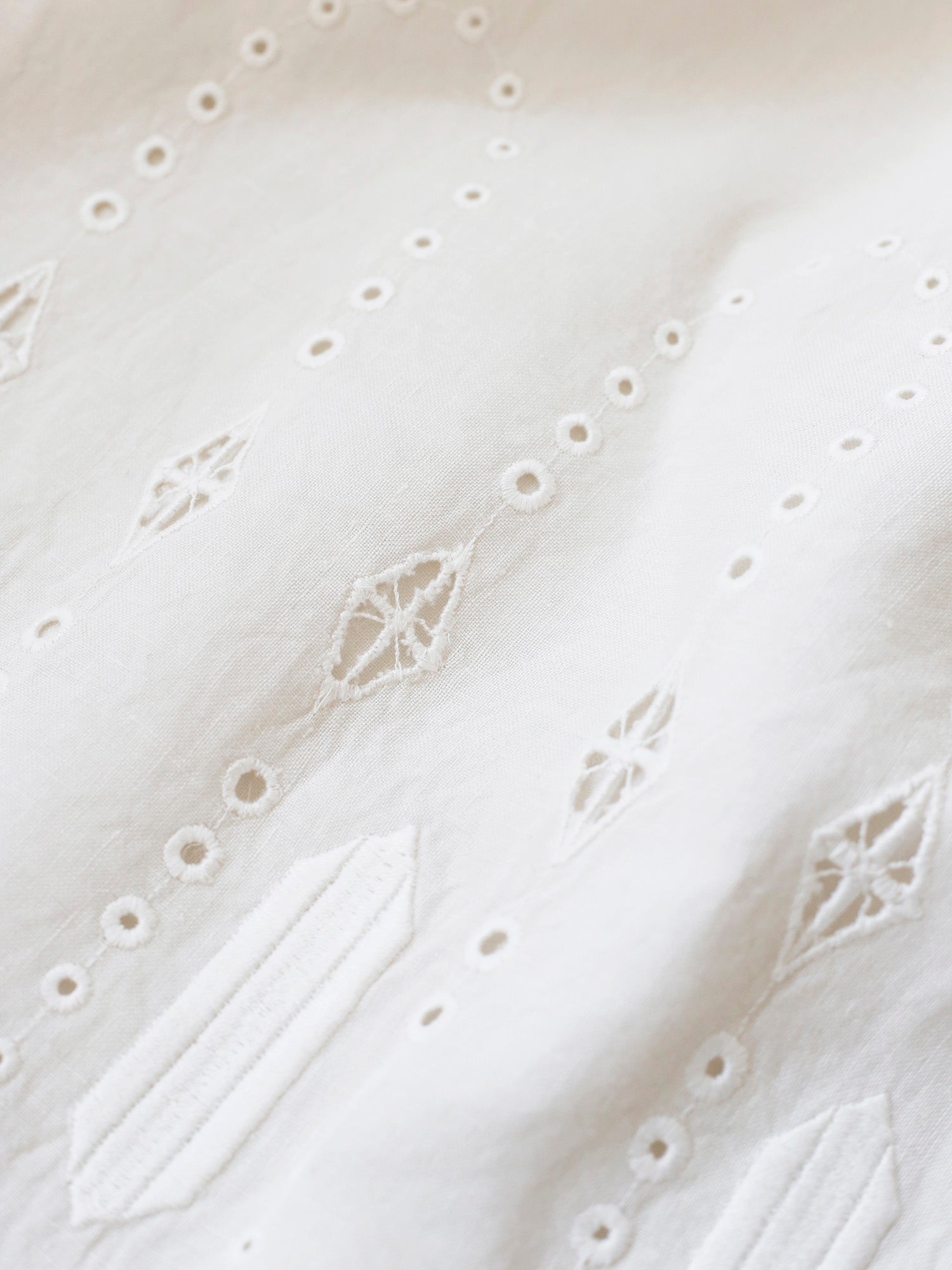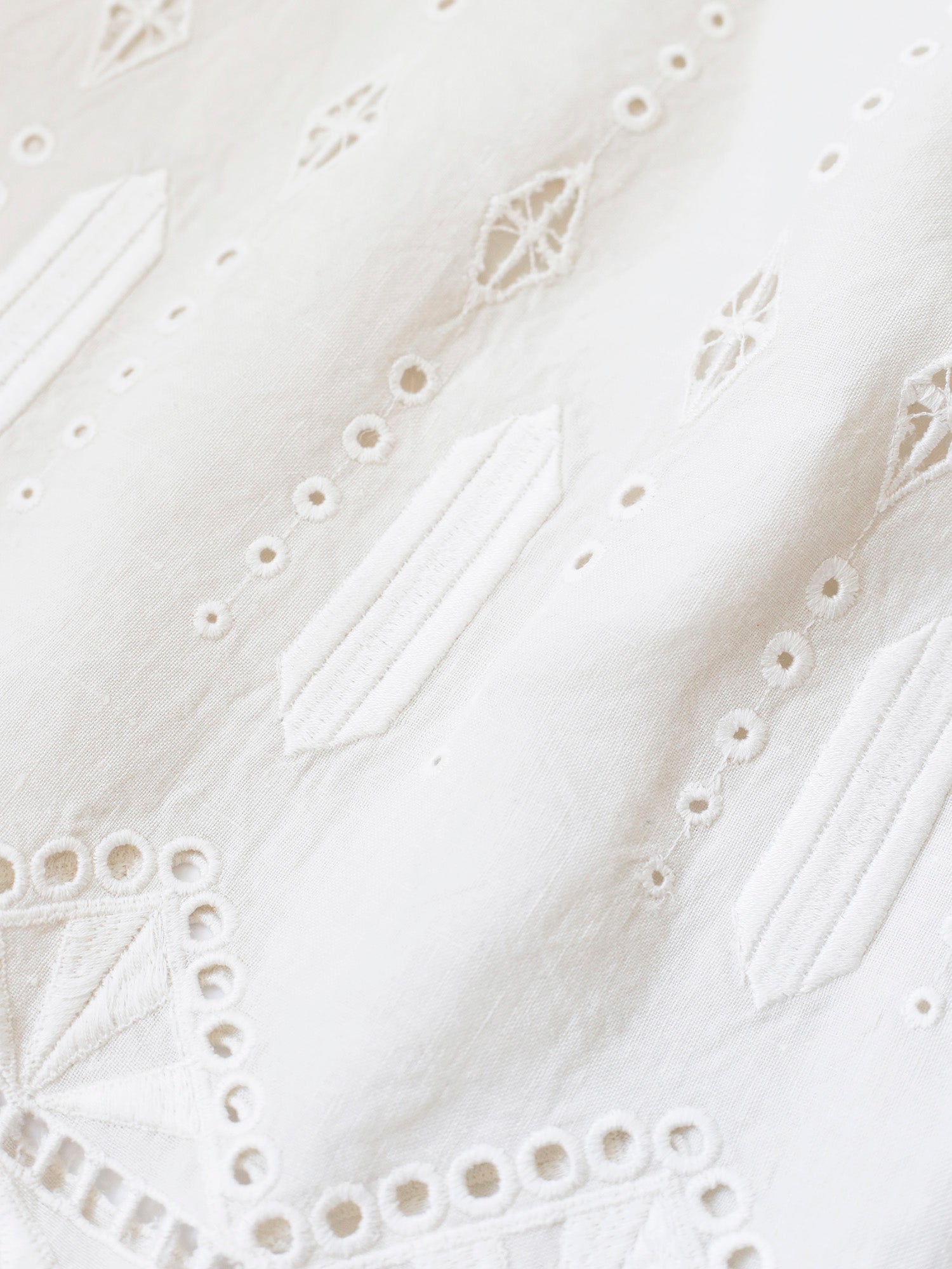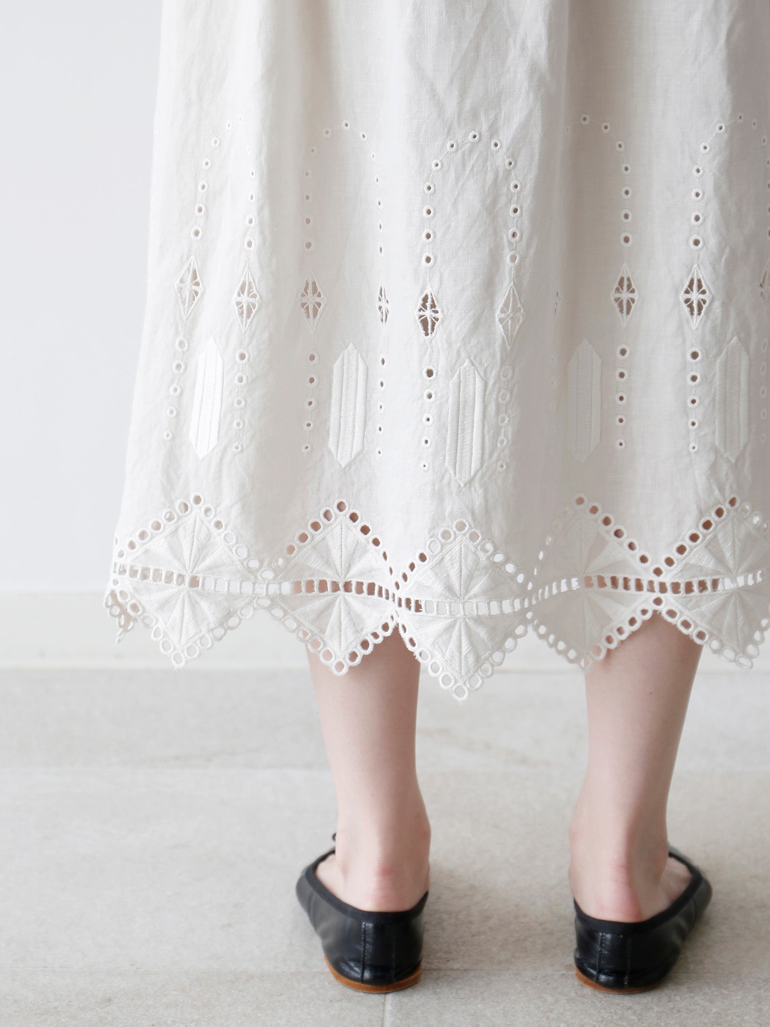 「No.16」では、裾周りにぐるりとハシゴレースがあしらわれ、丸いアイレットがスクエアの輪郭を描くように涼やかに施されています。大小様々な丸柄を組み合わせたアーチに、小窓のようなダイヤ型の刺繍。この部分は、刺繍を施した後に丁寧に穴を開けることで、繊細な図柄を忠実に表現。