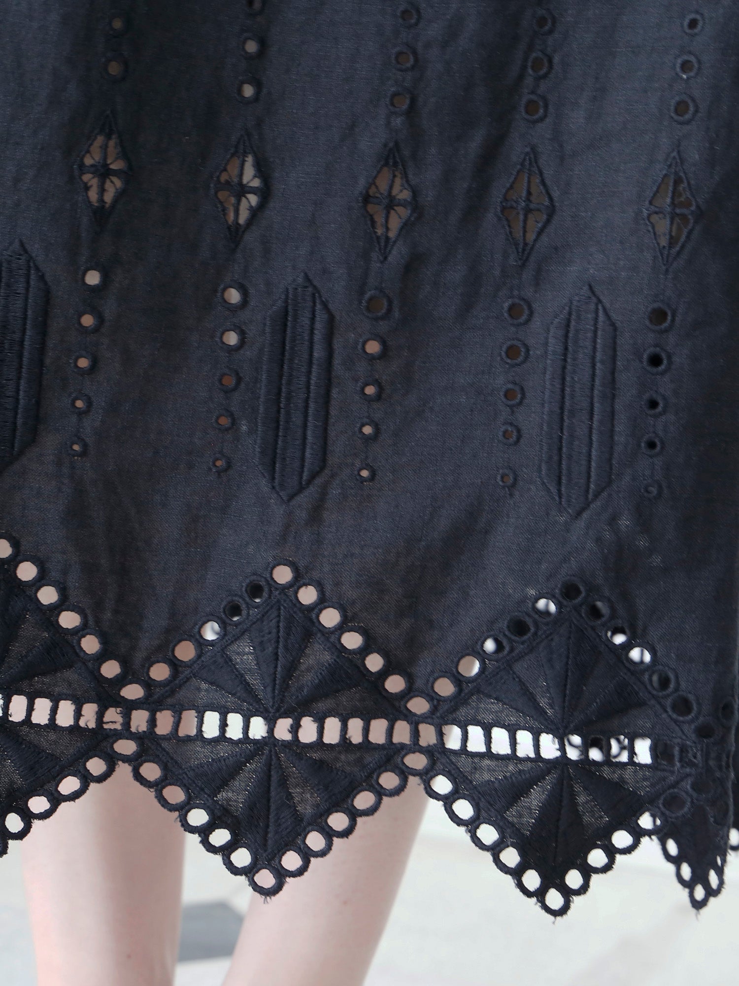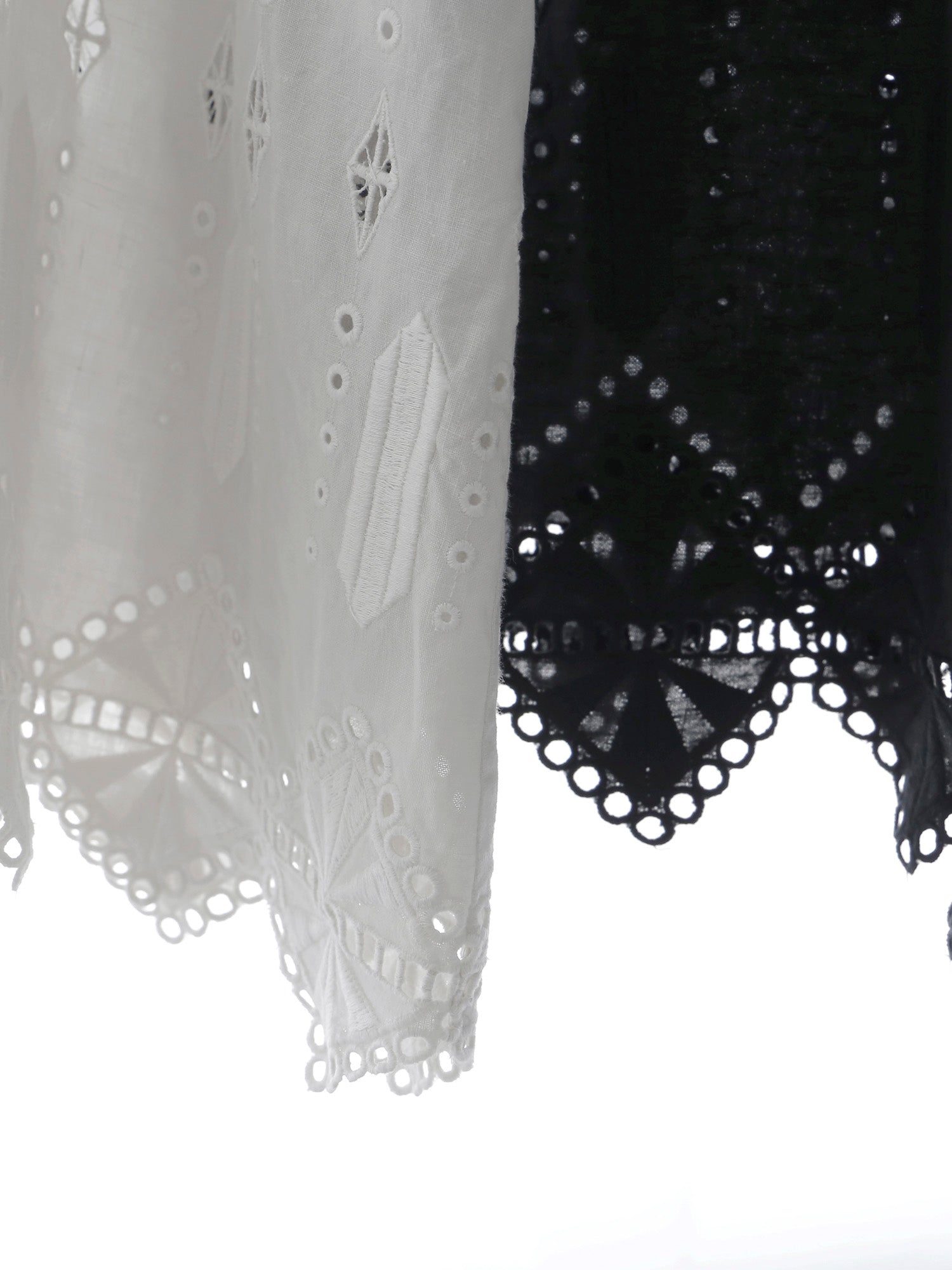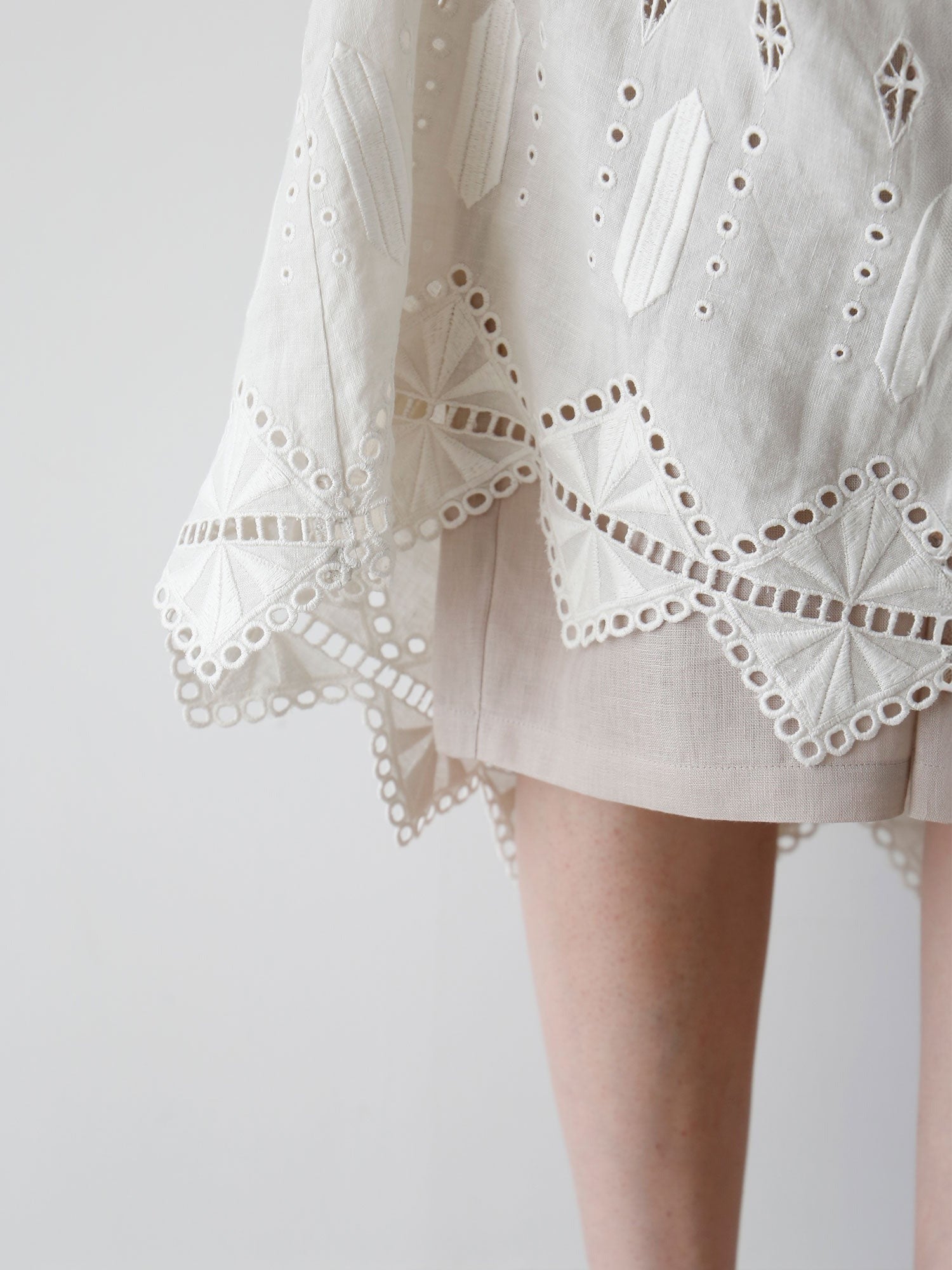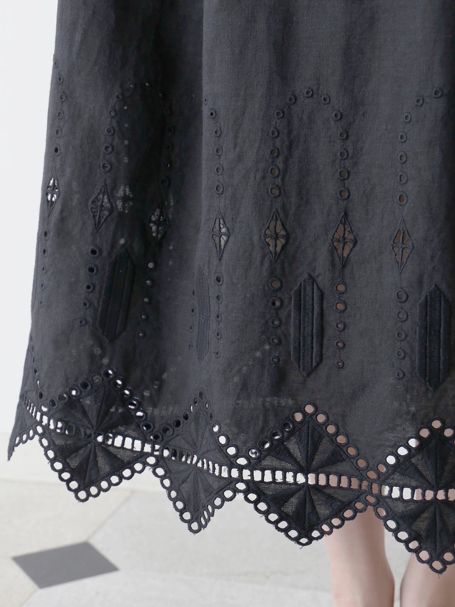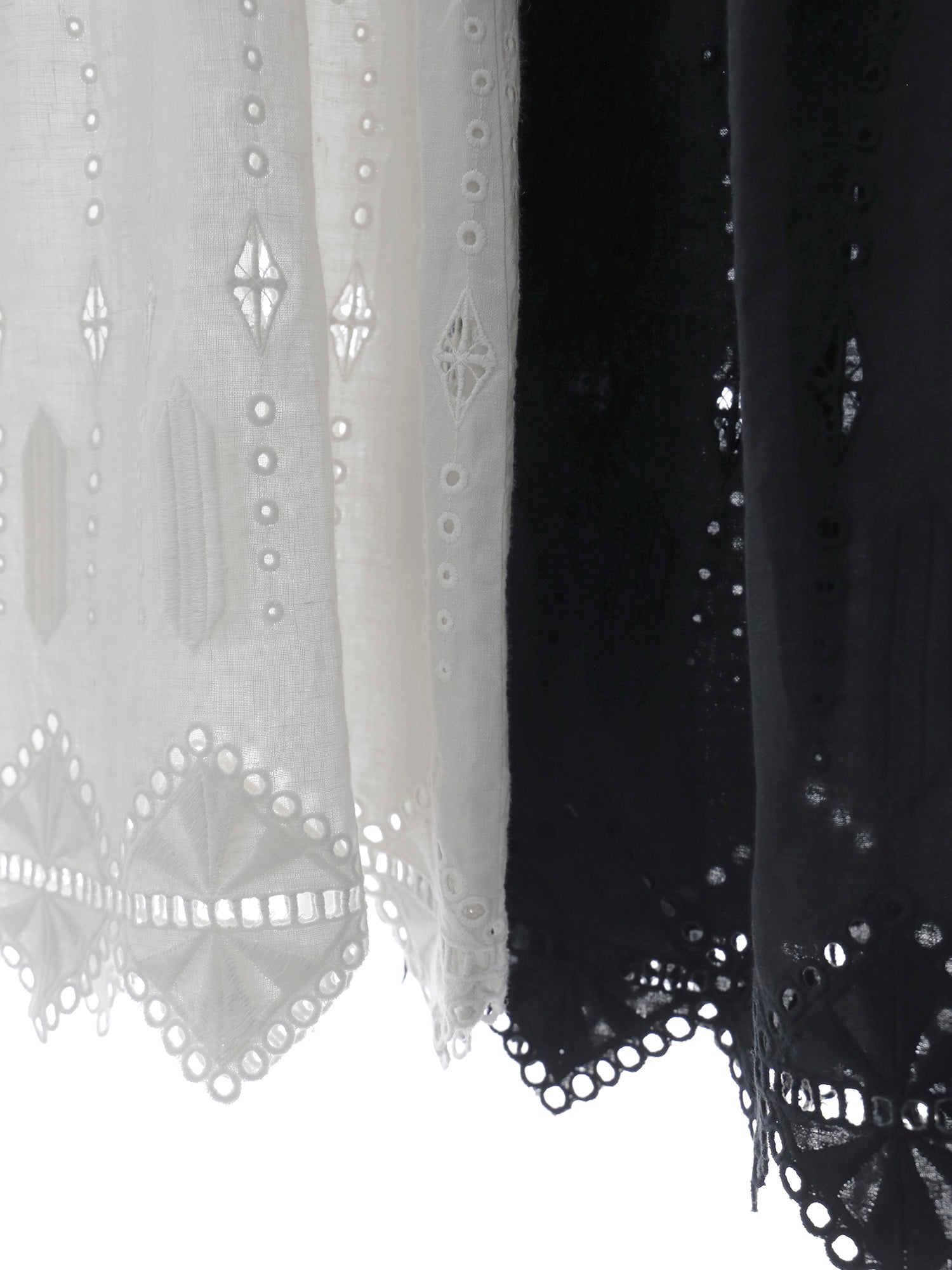 「No.16」では、裾周りにぐるりとハシゴレースがあしらわれ、丸いアイレットがスクエアの輪郭を描くように涼やかに施されています。大小様々な丸柄を組み合わせたアーチに、小窓のようなダイヤ型の刺繍。この部分は、刺繍を施した後に丁寧に穴を開けることで、繊細な図柄を忠実に表現。