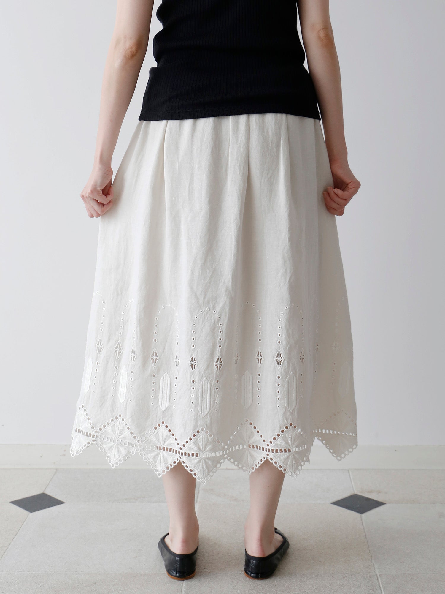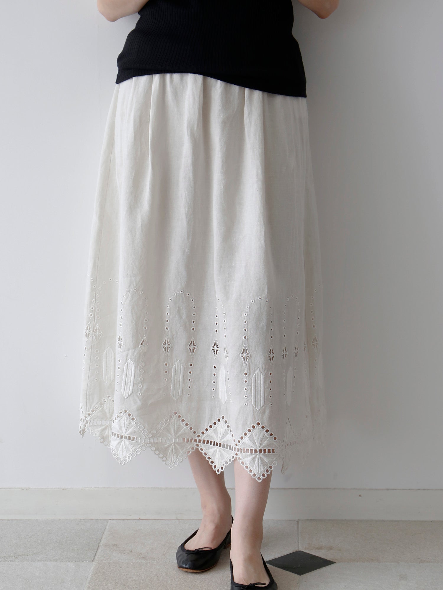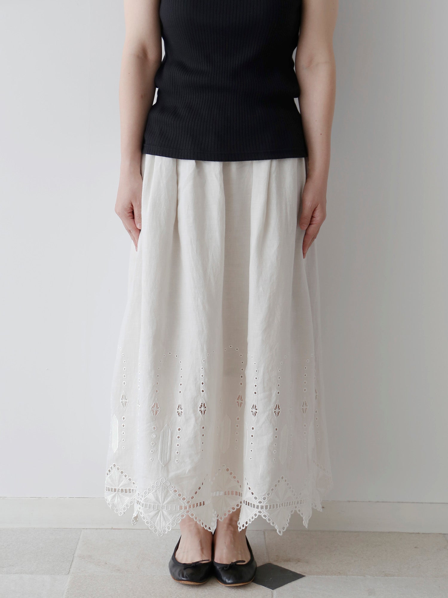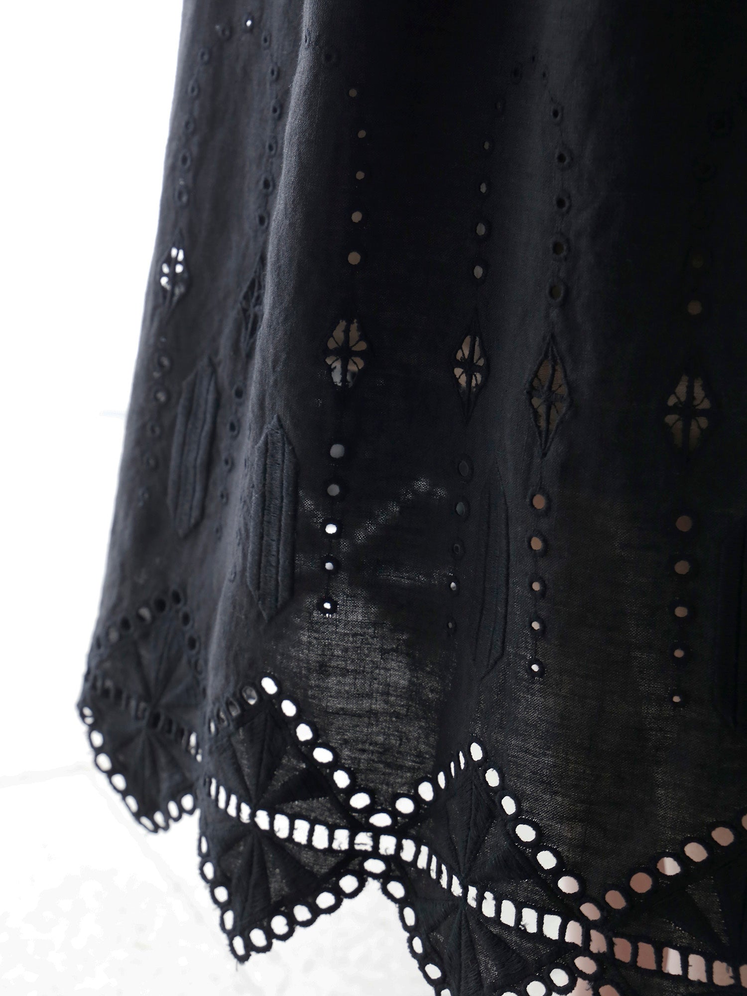 「No.16」では、裾周りにぐるりとハシゴレースがあしらわれ、丸いアイレットがスクエアの輪郭を描くように涼やかに施されています。大小様々な丸柄を組み合わせたアーチに、小窓のようなダイヤ型の刺繍。この部分は、刺繍を施した後に丁寧に穴を開けることで、繊細な図柄を忠実に表現。