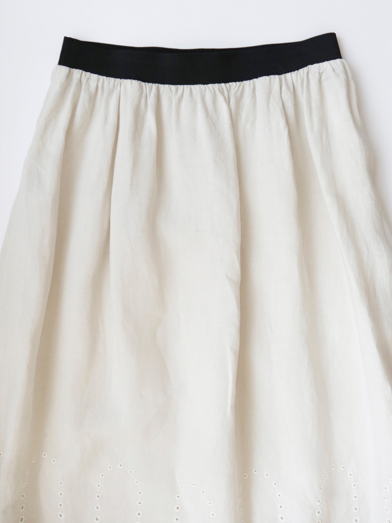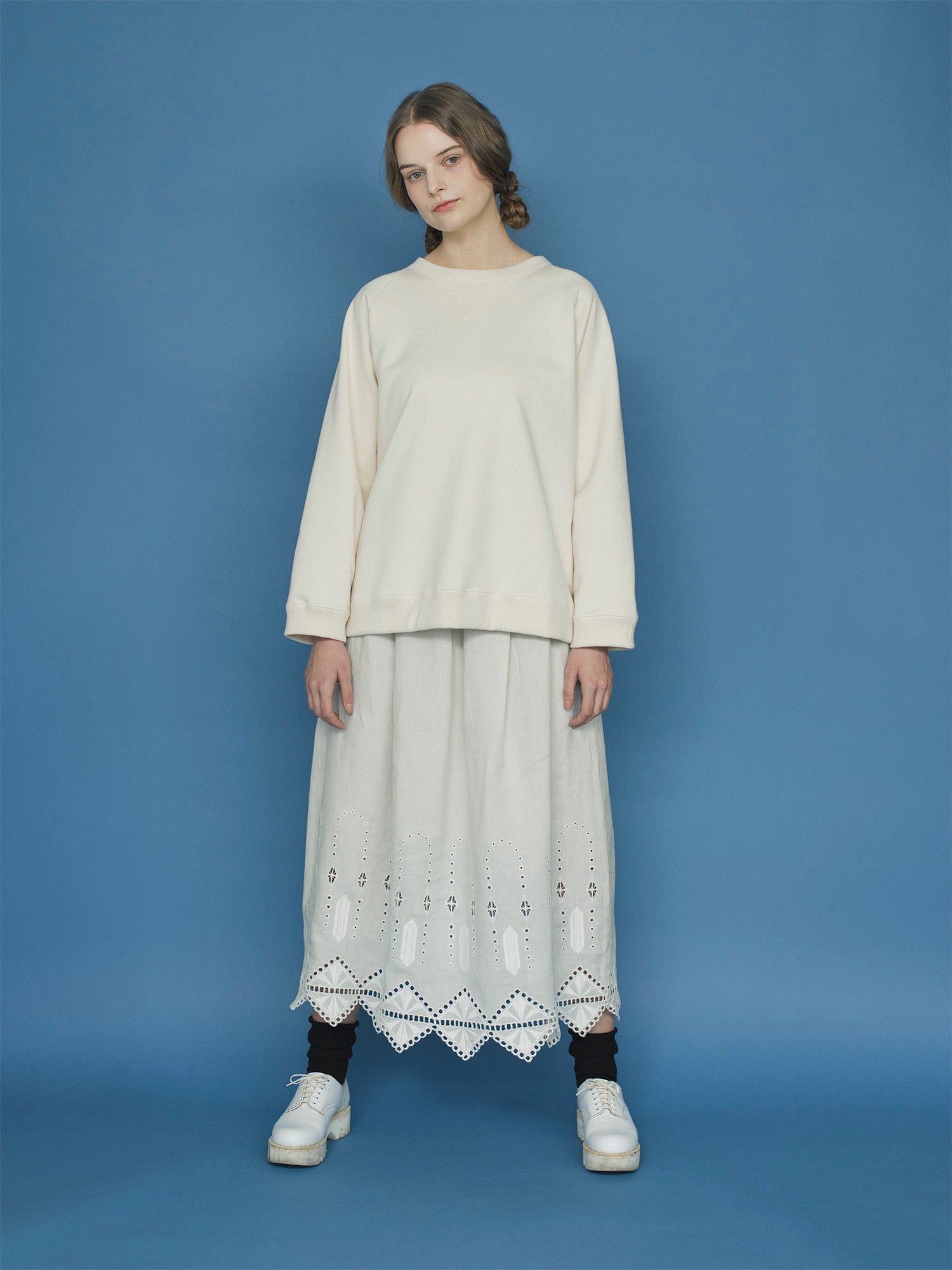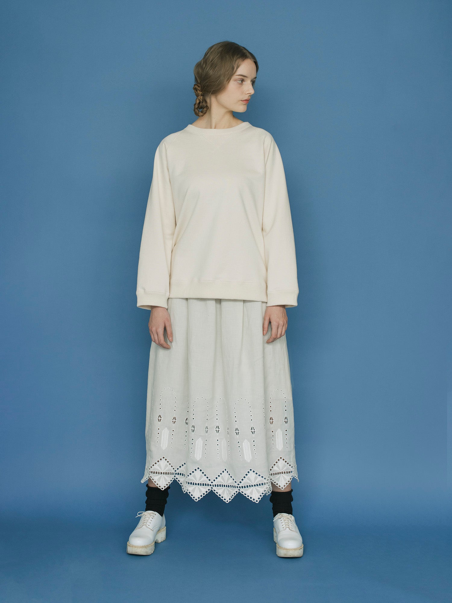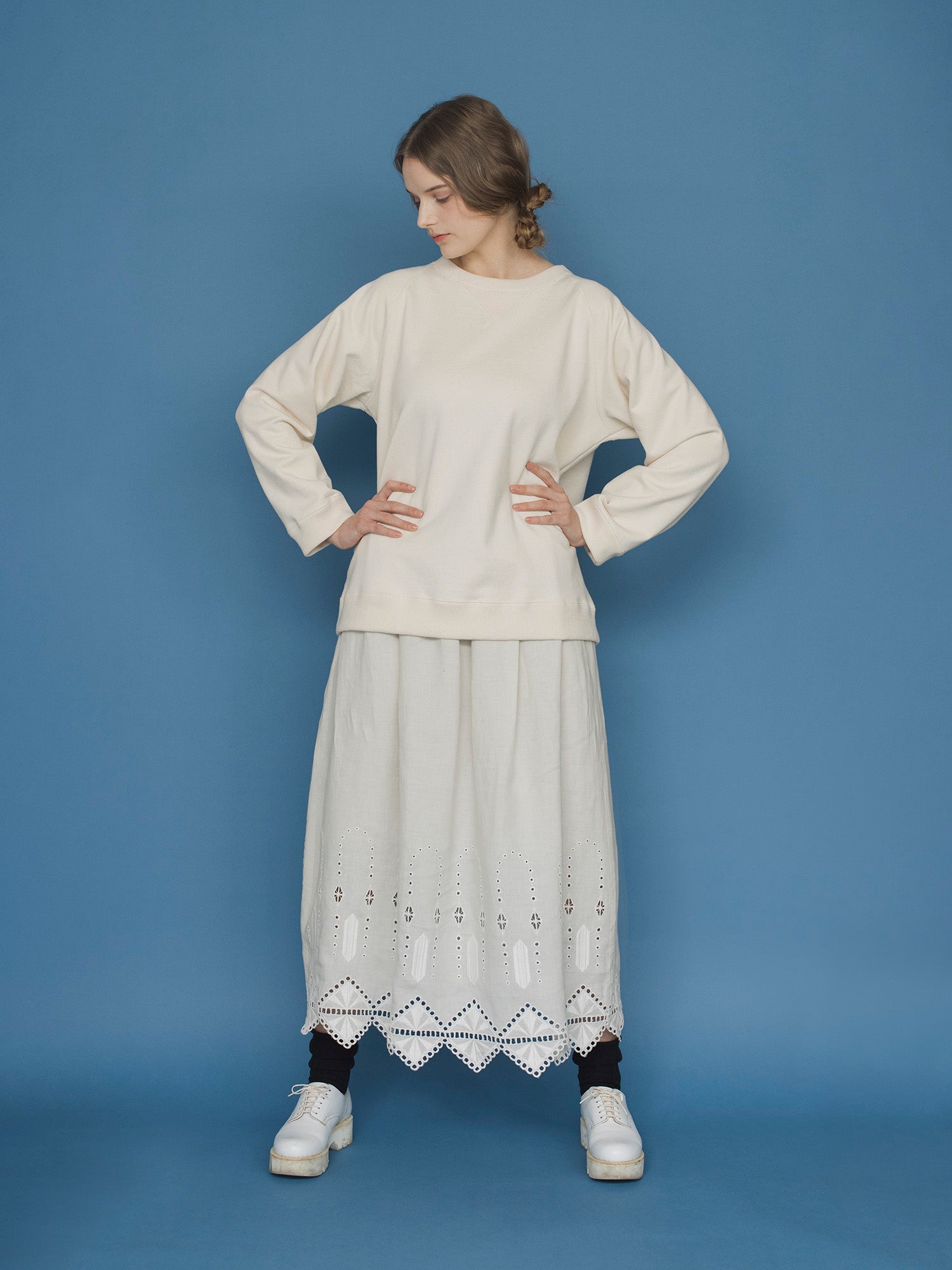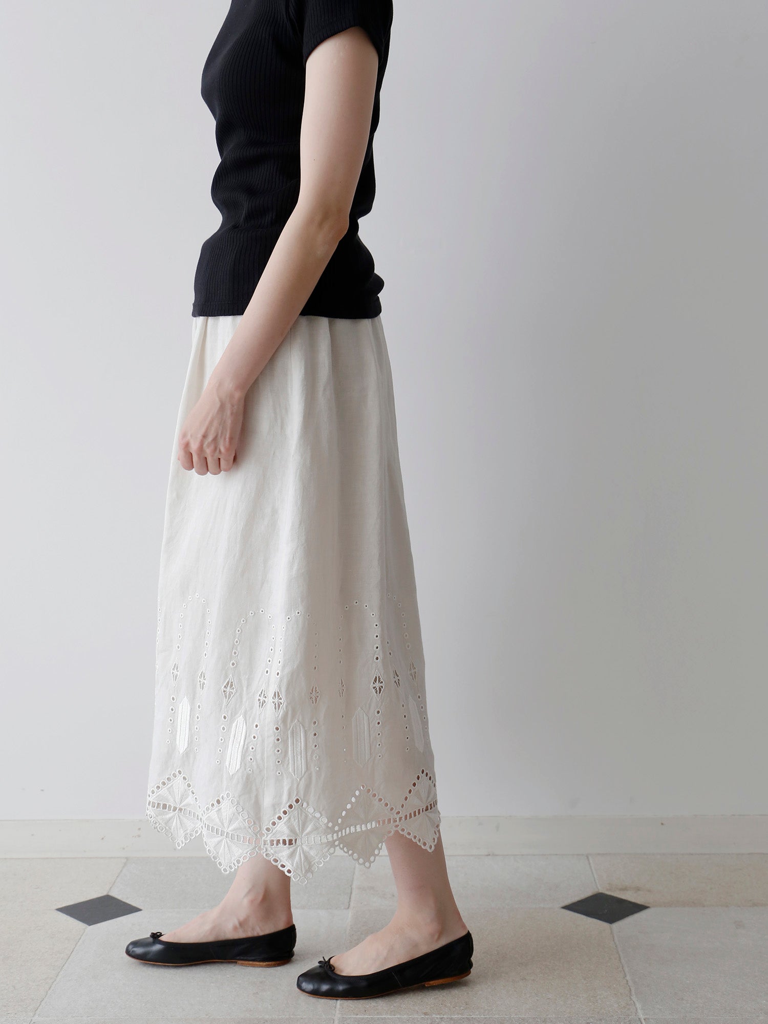 「No.16」では、裾周りにぐるりとハシゴレースがあしらわれ、丸いアイレットがスクエアの輪郭を描くように涼やかに施されています。大小様々な丸柄を組み合わせたアーチに、小窓のようなダイヤ型の刺繍。この部分は、刺繍を施した後に丁寧に穴を開けることで、繊細な図柄を忠実に表現。