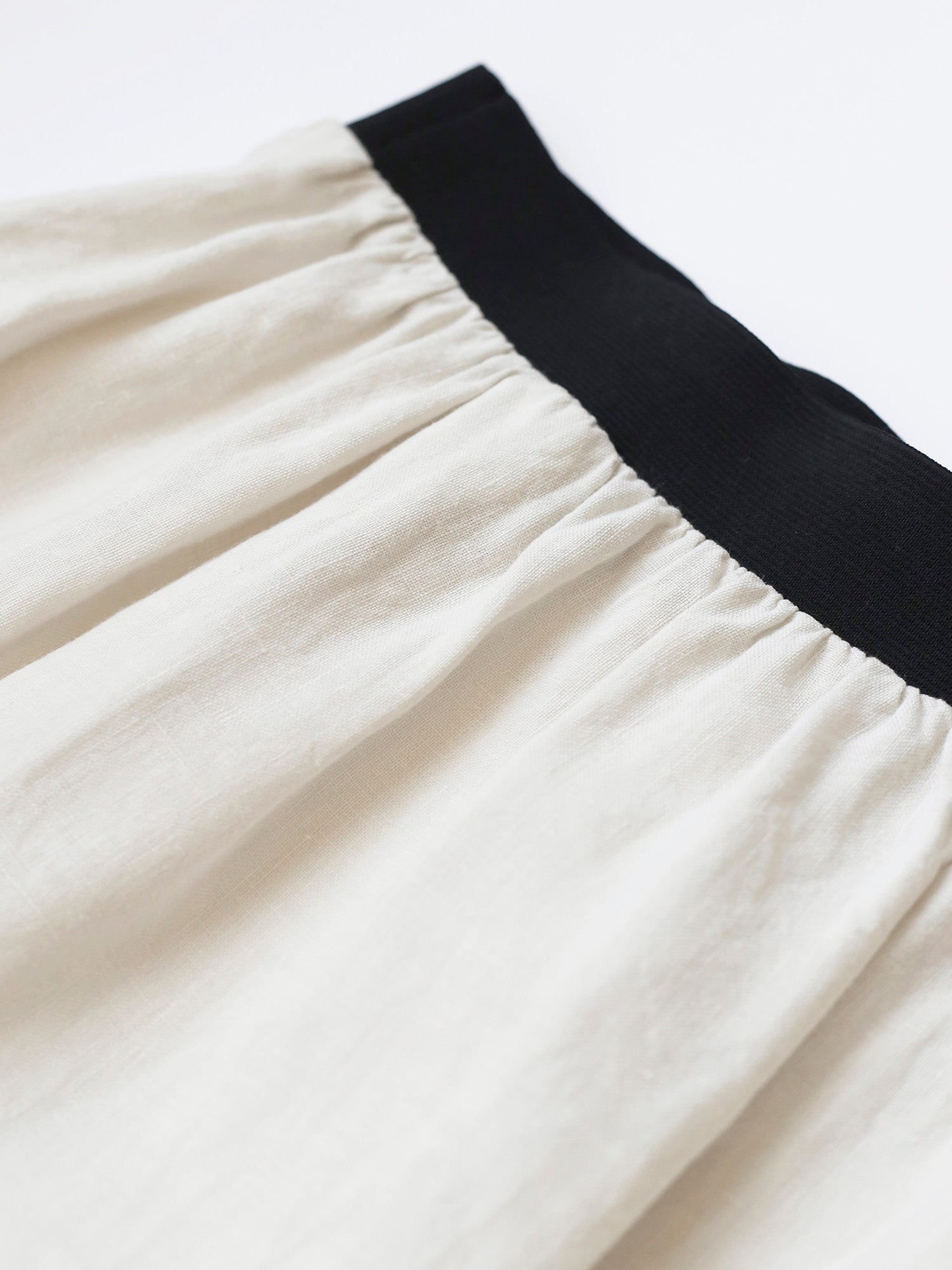 ウエストはゴム仕様なので、快適に着用できます。お好みに合わせて腰履きで丈を調整したり、丈が長すぎる場合はゴム部分をひと折りして長さを調整しても。