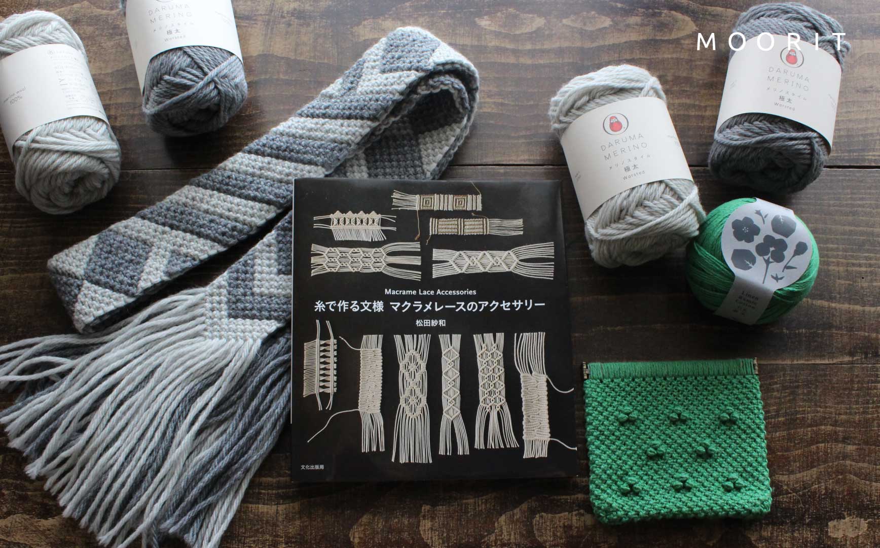 MOORITでは掲載作品のなかから、手編み糸をつかったマクラメレース作品「ポーチ」「タイマフラー」の材料セットをご用意しました