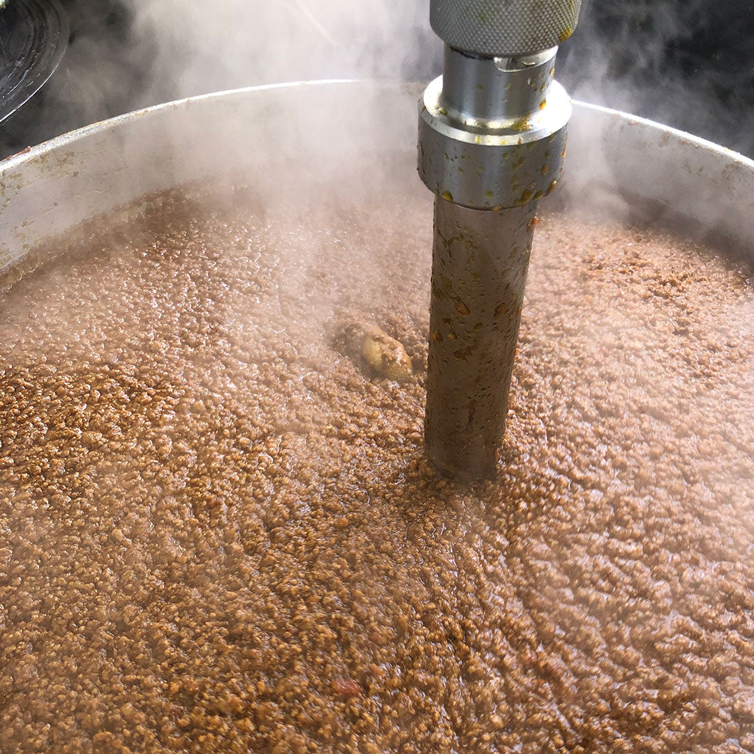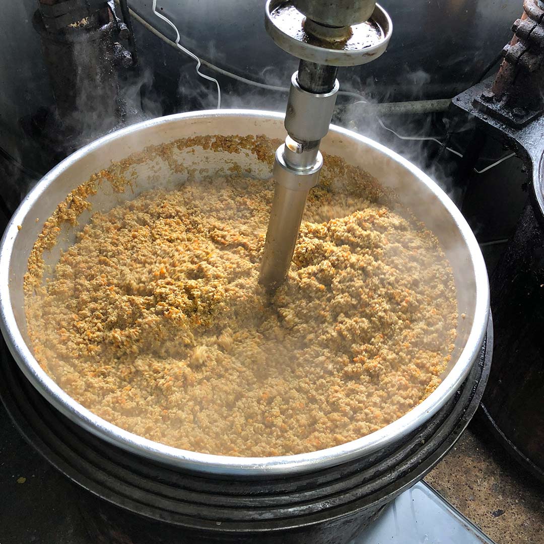 オクシモロンオリジナルの配合で玉ねぎ、人参、ごぼうを蒸気釜を使いソテーし、野菜のうまみや香りをじっくり引き出します。その野菜ミックスソテーに肉やスパイスなどを加えて、カレーに仕上げています。