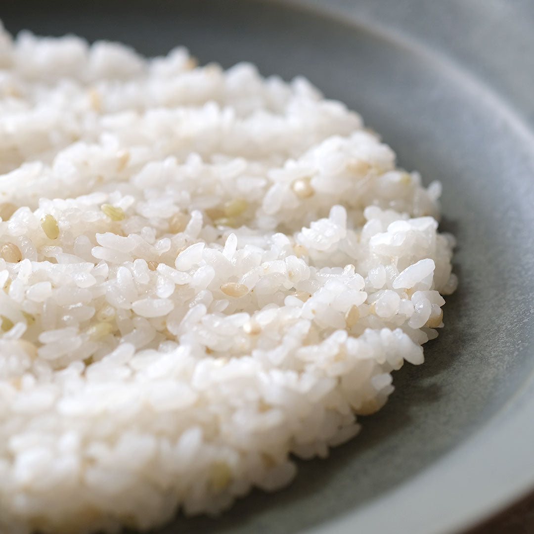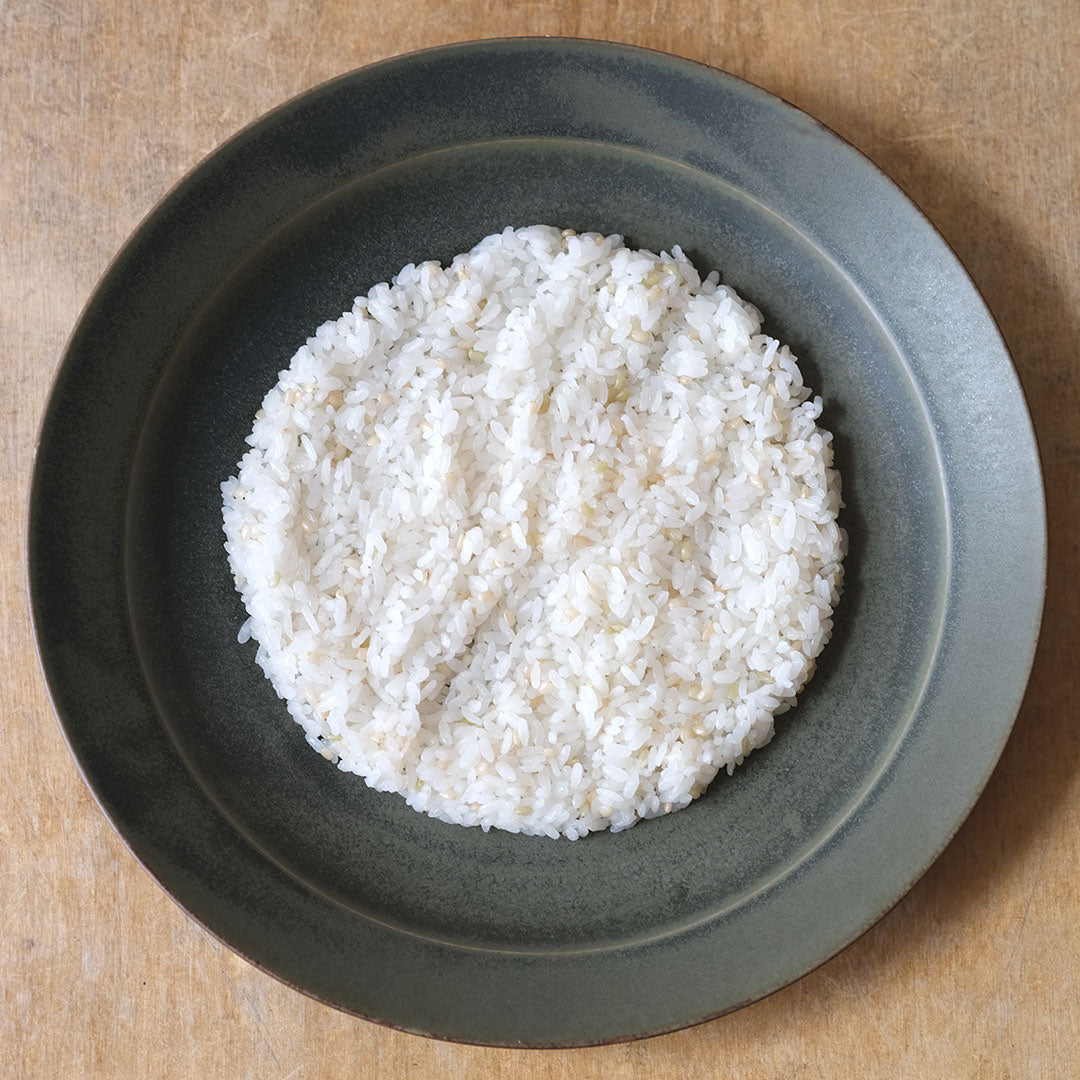 オクシモロンでは、七分づきの白米に緑米を合わせ、みりんを少し加えたものを炊いています。家庭では米2合に対し緑米大さじ2、みりん小さじ2の割合がおすすめ。▲緑米のプチッとした食感がアクセント