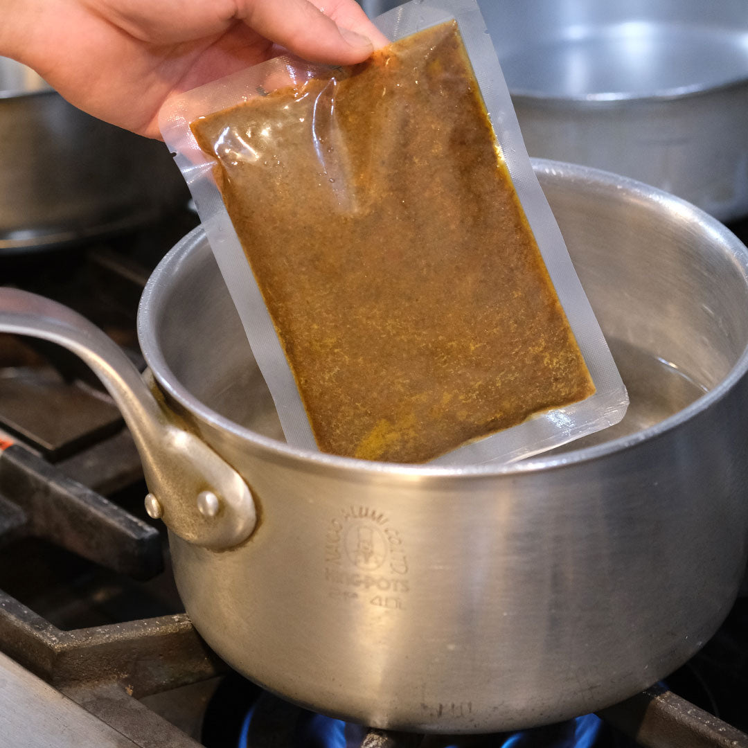 中身は透明なパウチです。3~5分湯煎するか、深めの耐熱容器に移し替えてラップをかけ、500Wの電子レンジで約2~2分30秒加熱します。