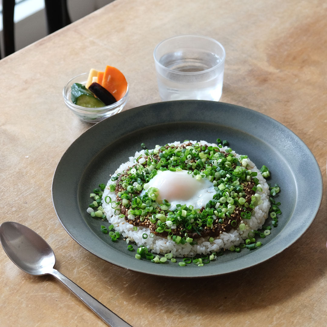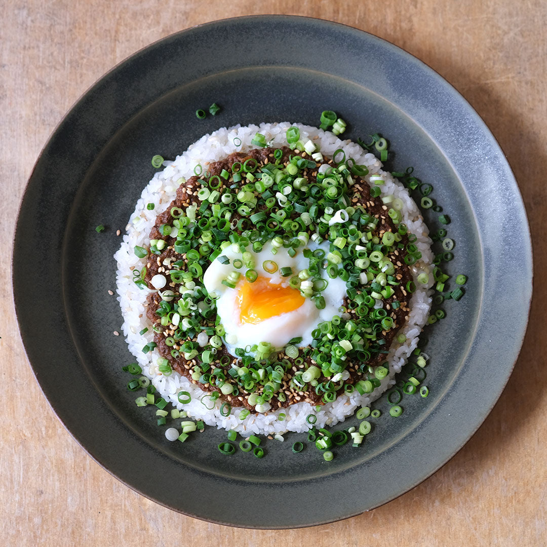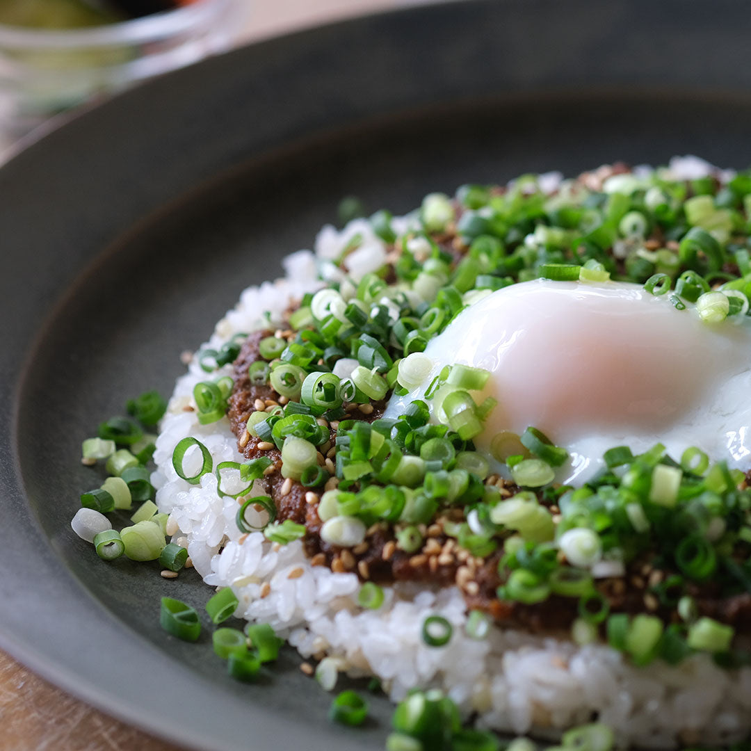 卵が全体をまるく包んでくれ、噛むごとにスパイス、胡麻、フレッシュなネギの香りが広がります。ゆず風味のお漬物を添えるとさらにお店の味に。