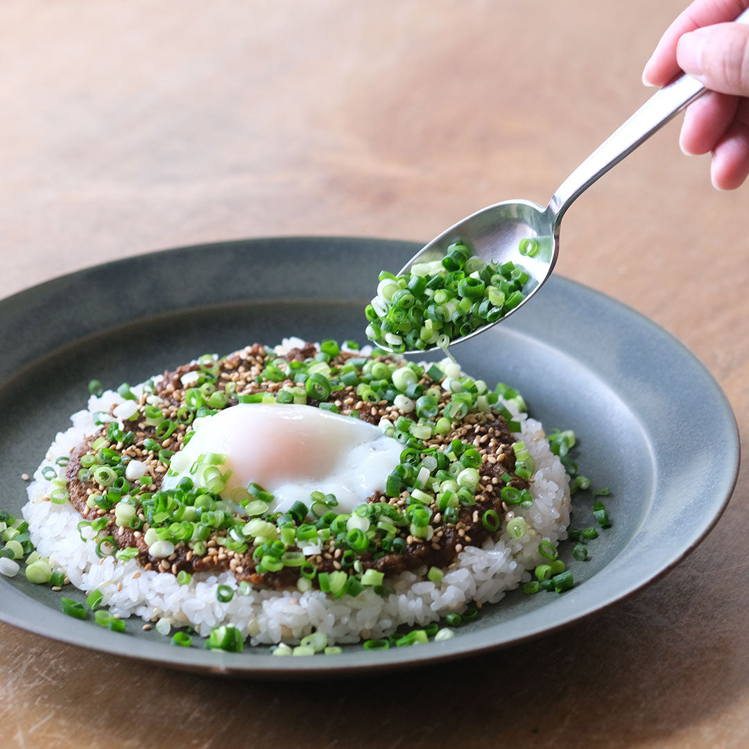 ③中央にくぼみをつくり温泉卵をのせます。ひねり胡麻と小口切りのネギを散らして、いただきます。お好みで温泉卵に少々の醤油をかけても。