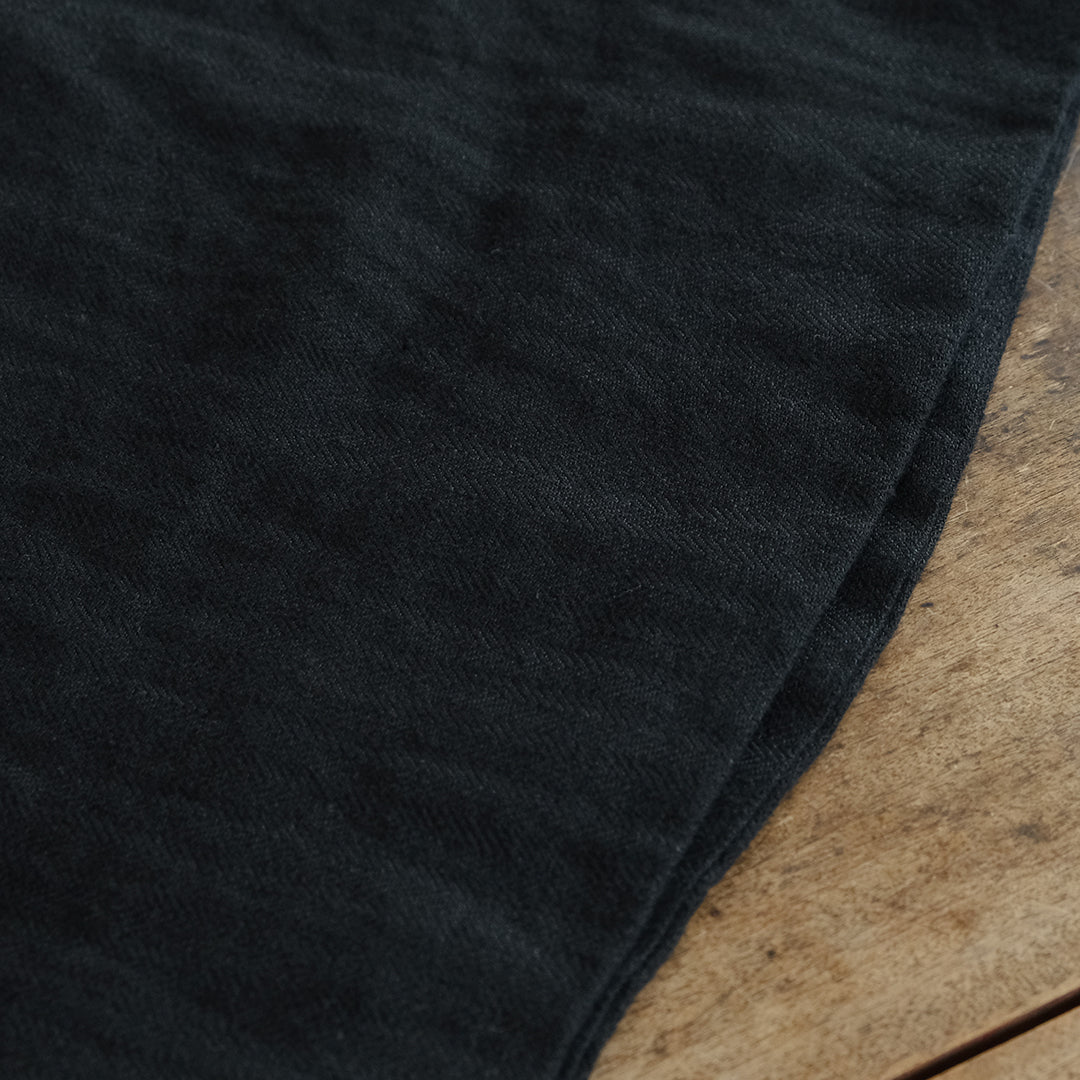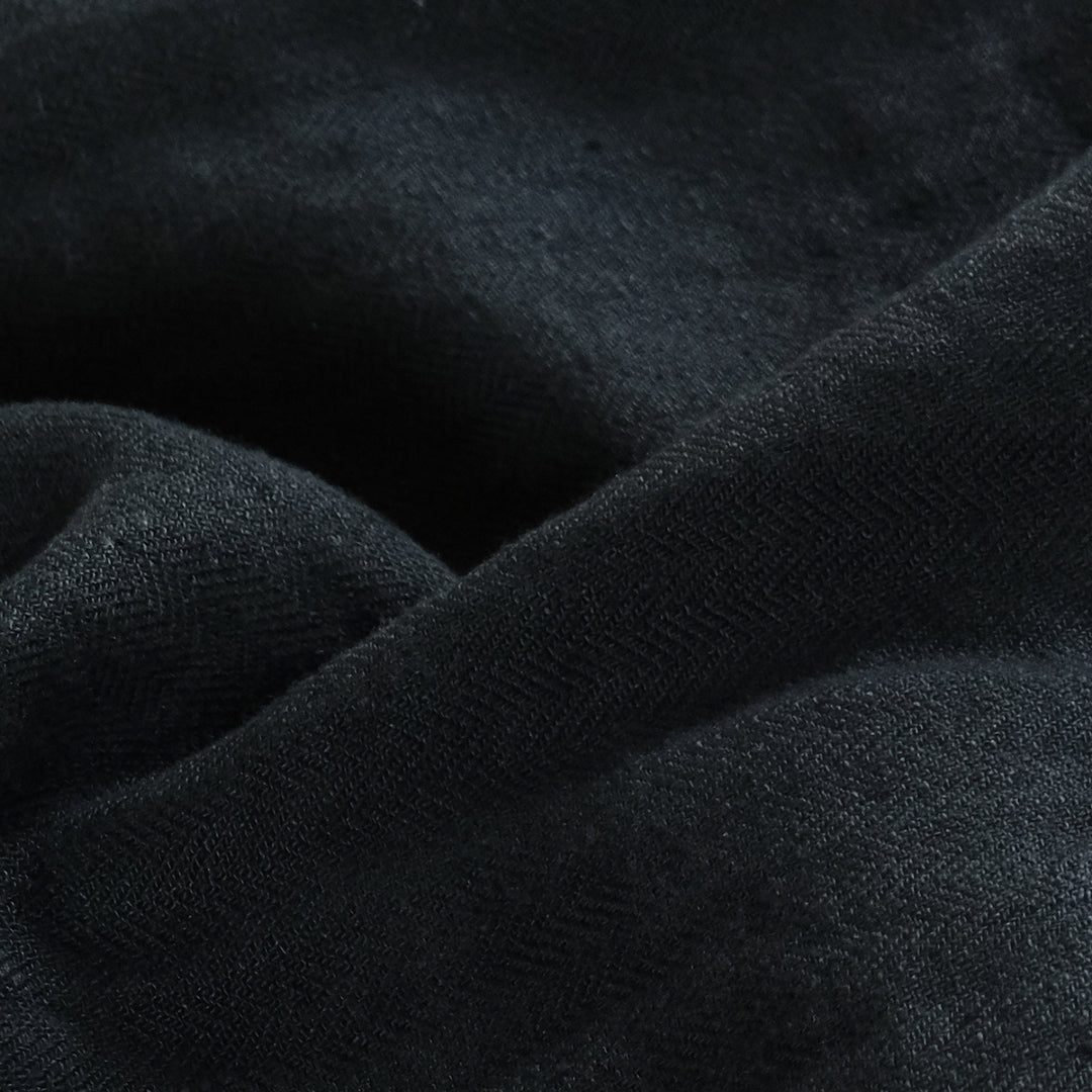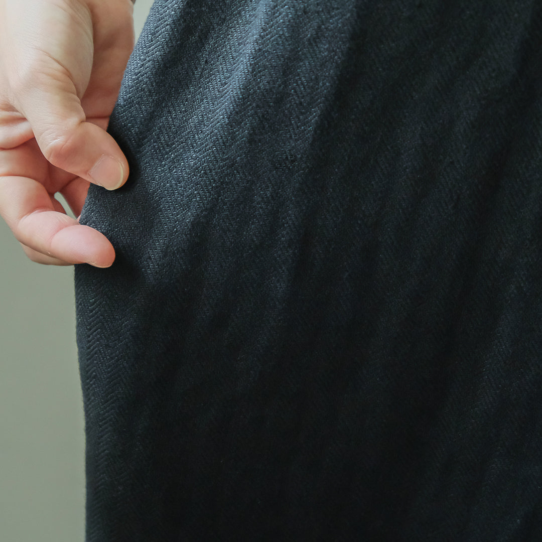 リネンのヘリンボーン生地でフォーマル感を成立させるため、色味にもこだわり、黒に深みが出るように『後染め』で染めています。