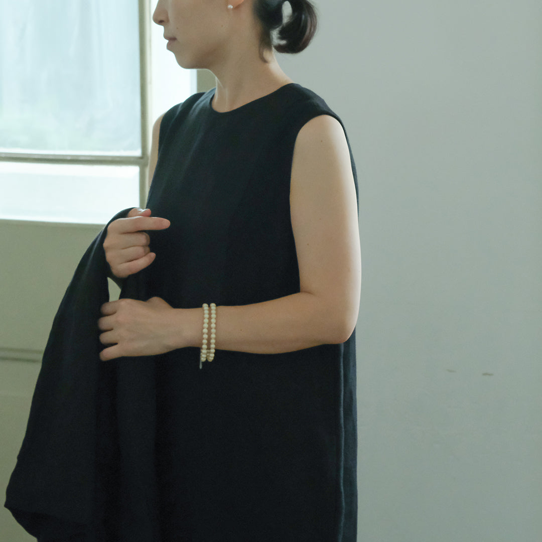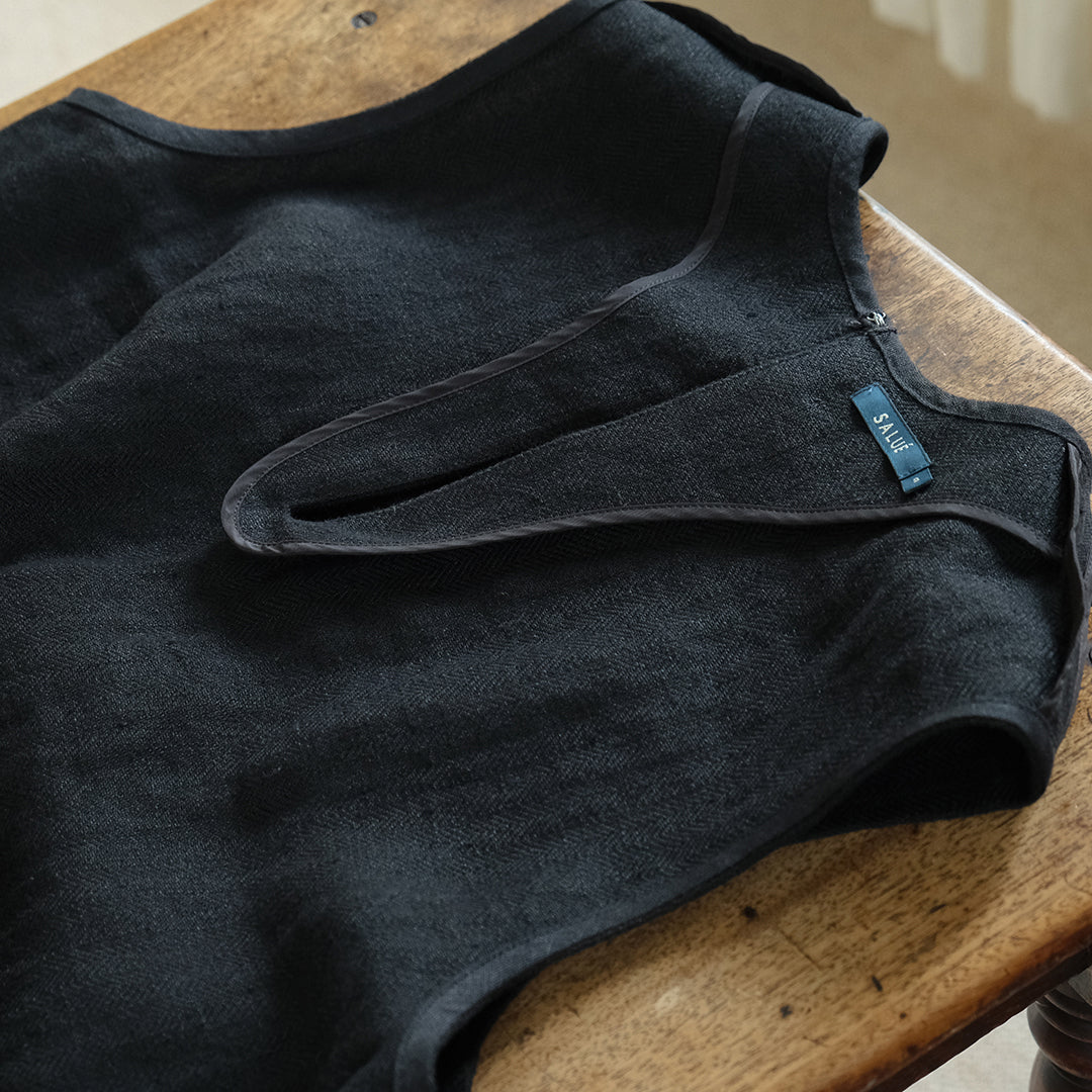 SALUÉが提案するフォーマルラインより、大人のためのシンプルなリネンドレスをご紹介します。特別なシーンはもちろん、普段のお出かけにも使ってほしい、ヘリンボーン生地で仕立てたとっておきの一枚です。数点ですが、すぐのお届けが可能です。