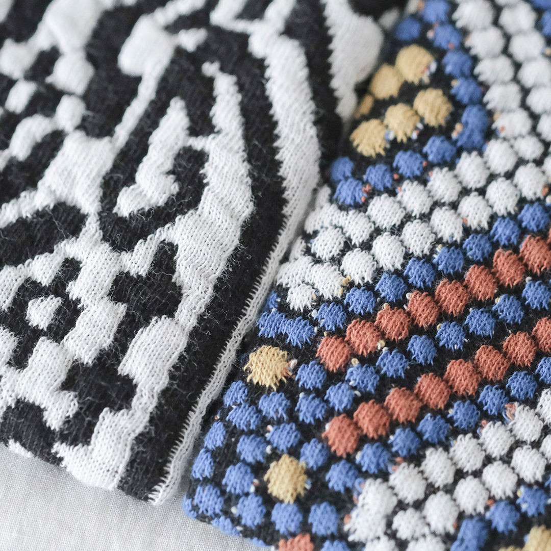 象形文字を組み合わせたような、アンティーク調の幾何学模様。機械編みの綿密な凹凸で柄が表現されています。▲ひとつひとつの模様の揺らぎに愛おしさを感じます