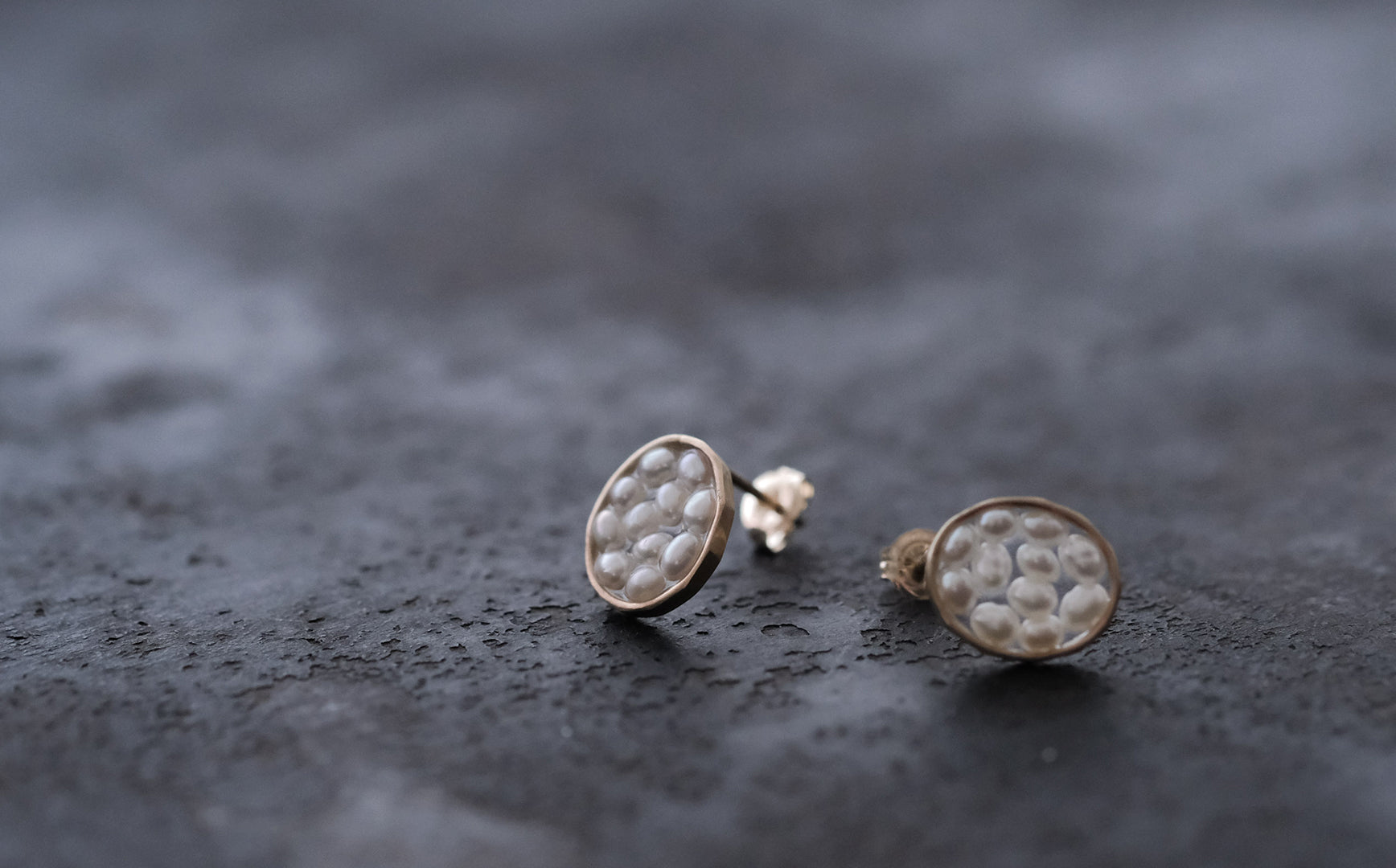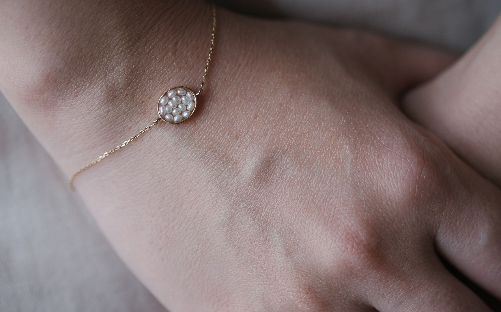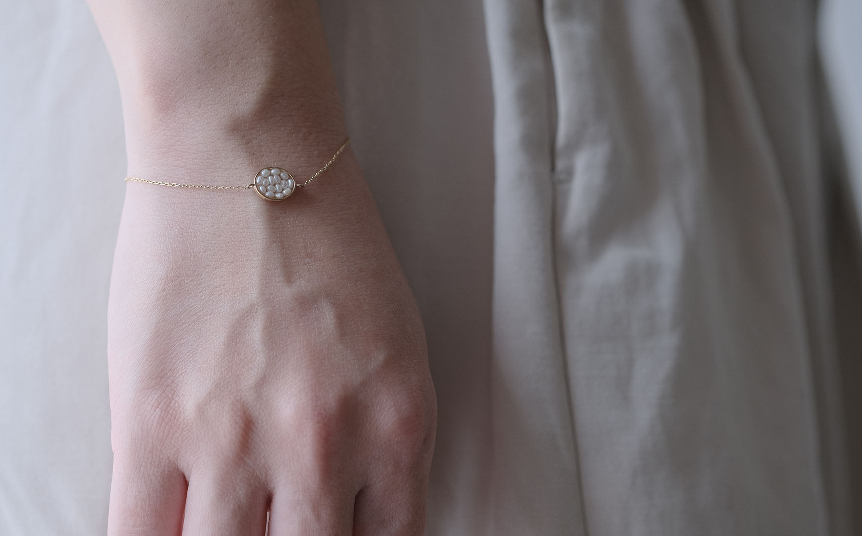 その理由はパール選び。存在感のある一粒ではなく、小さな淡水パールを複数敷き詰めることで可憐な印象に仕上げられています。