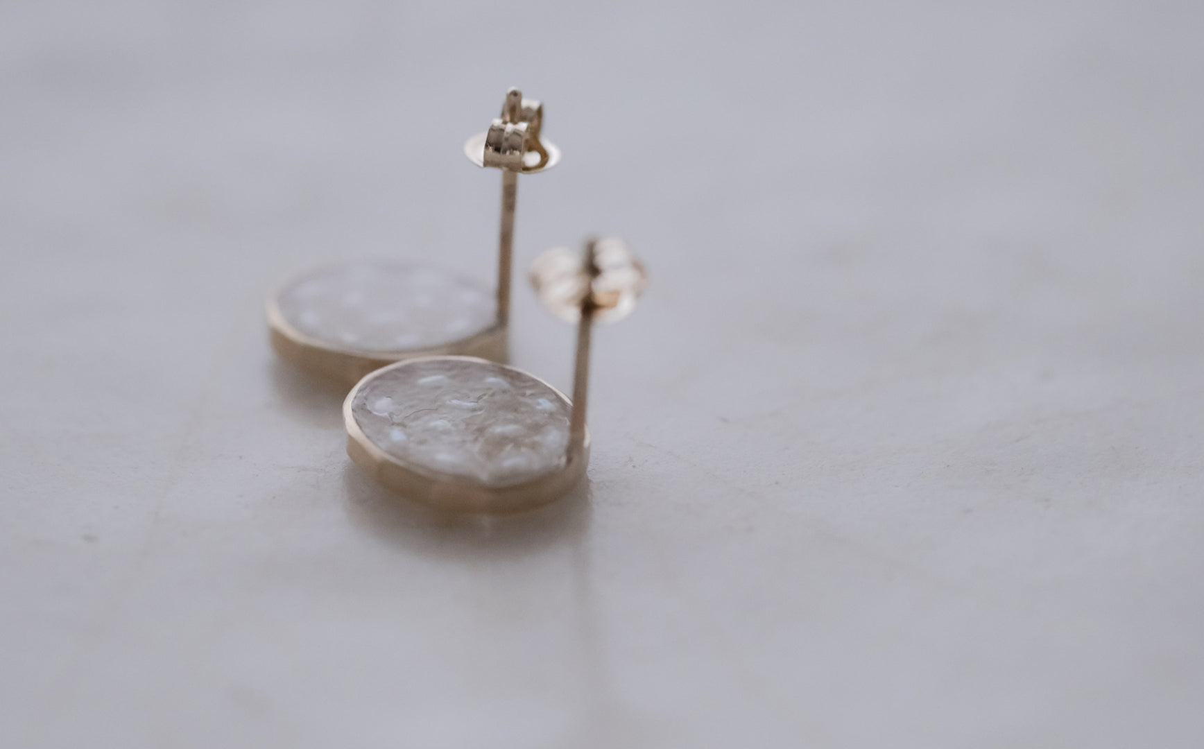 静寂の中、刻々と岩から染み出す雫、そんなシーンをイメージさせるパーツを包み込むのはやわらかなゴールド。どちらもきらびやかすぎず自然な輝きで、そんな雰囲気も普段の装いにフィットします。