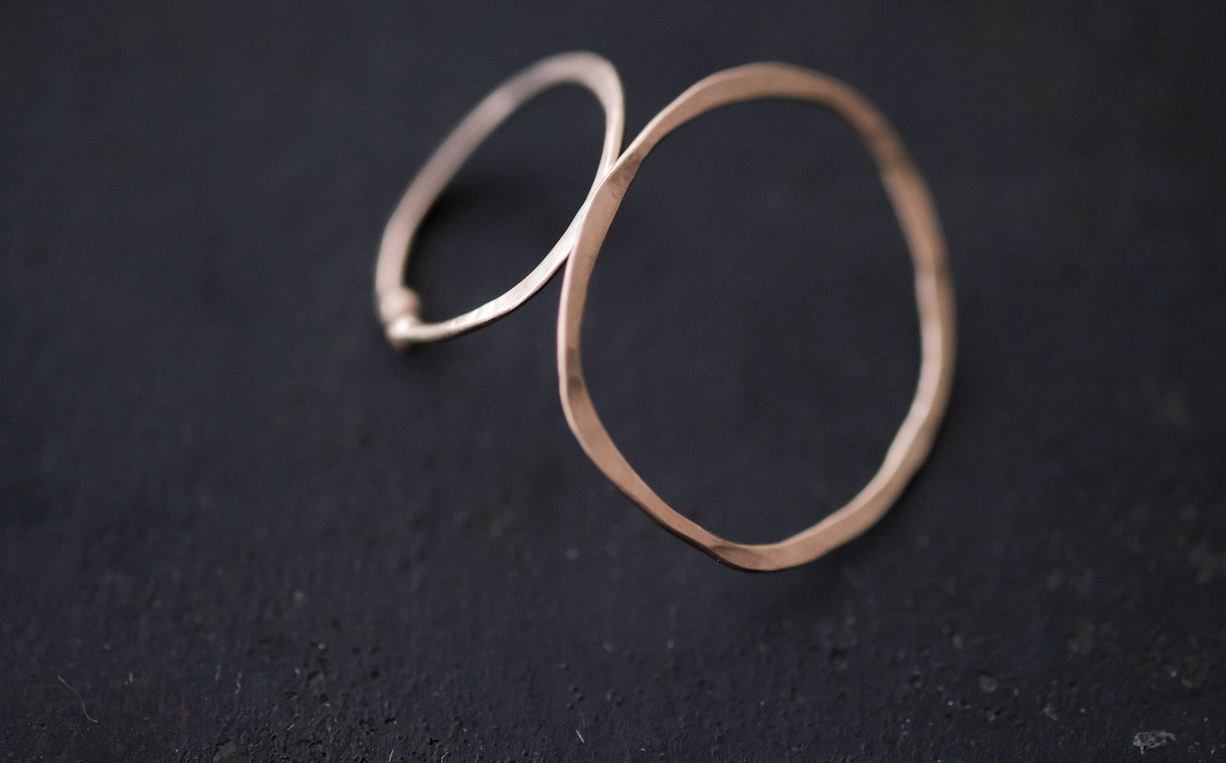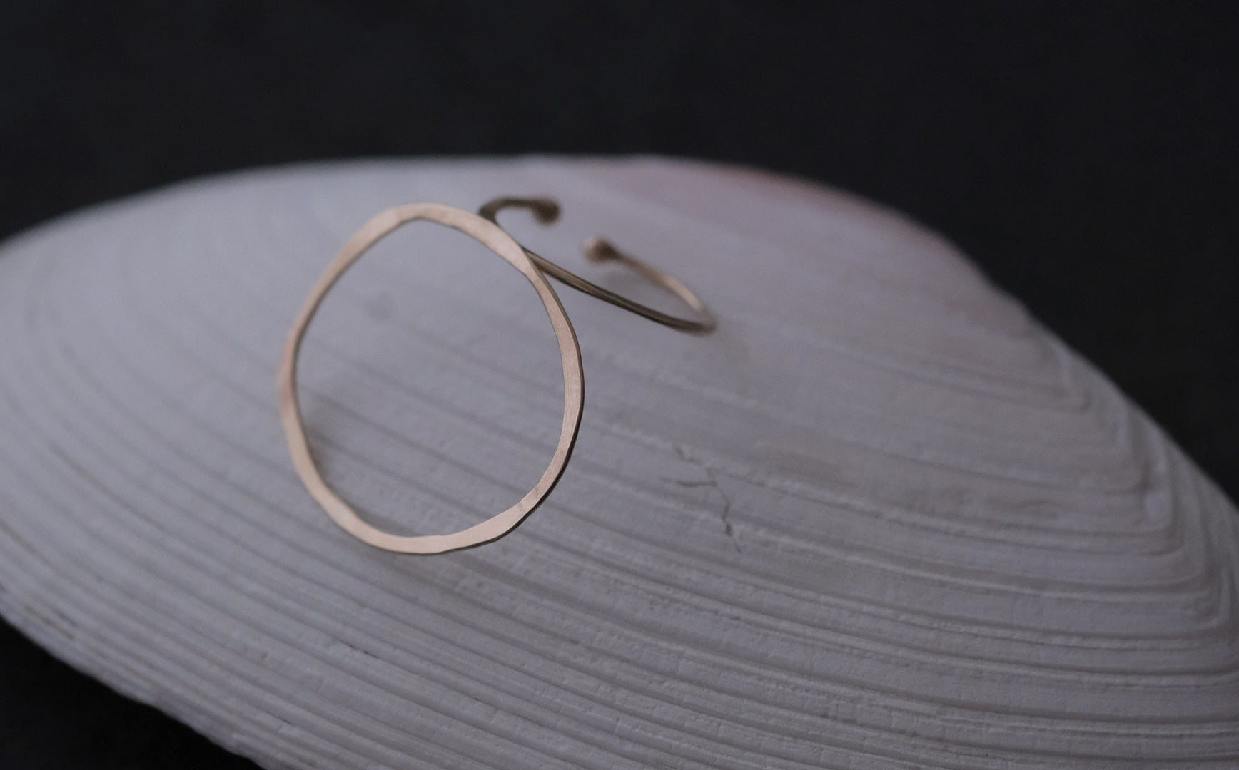 K10を輪にかたちづくり、金槌で槌目をつけながら平たく仕上げられています。