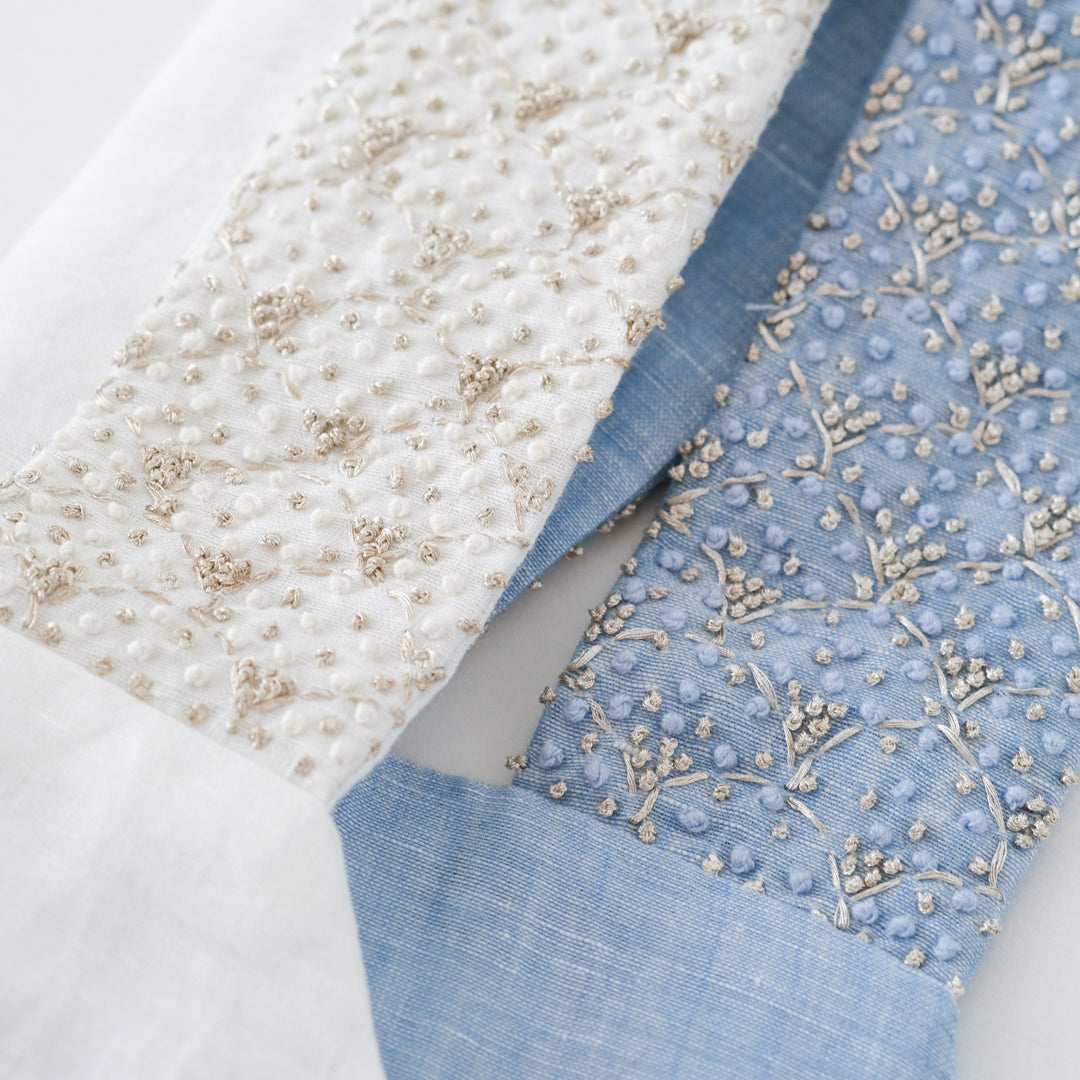 肩紐部分に繊細な手刺繍を施した、ワイドシルエットのオーバーオール。今季はリネンコットンを使った、さわやかなアイスブルーとホワイトの2色が届きました。