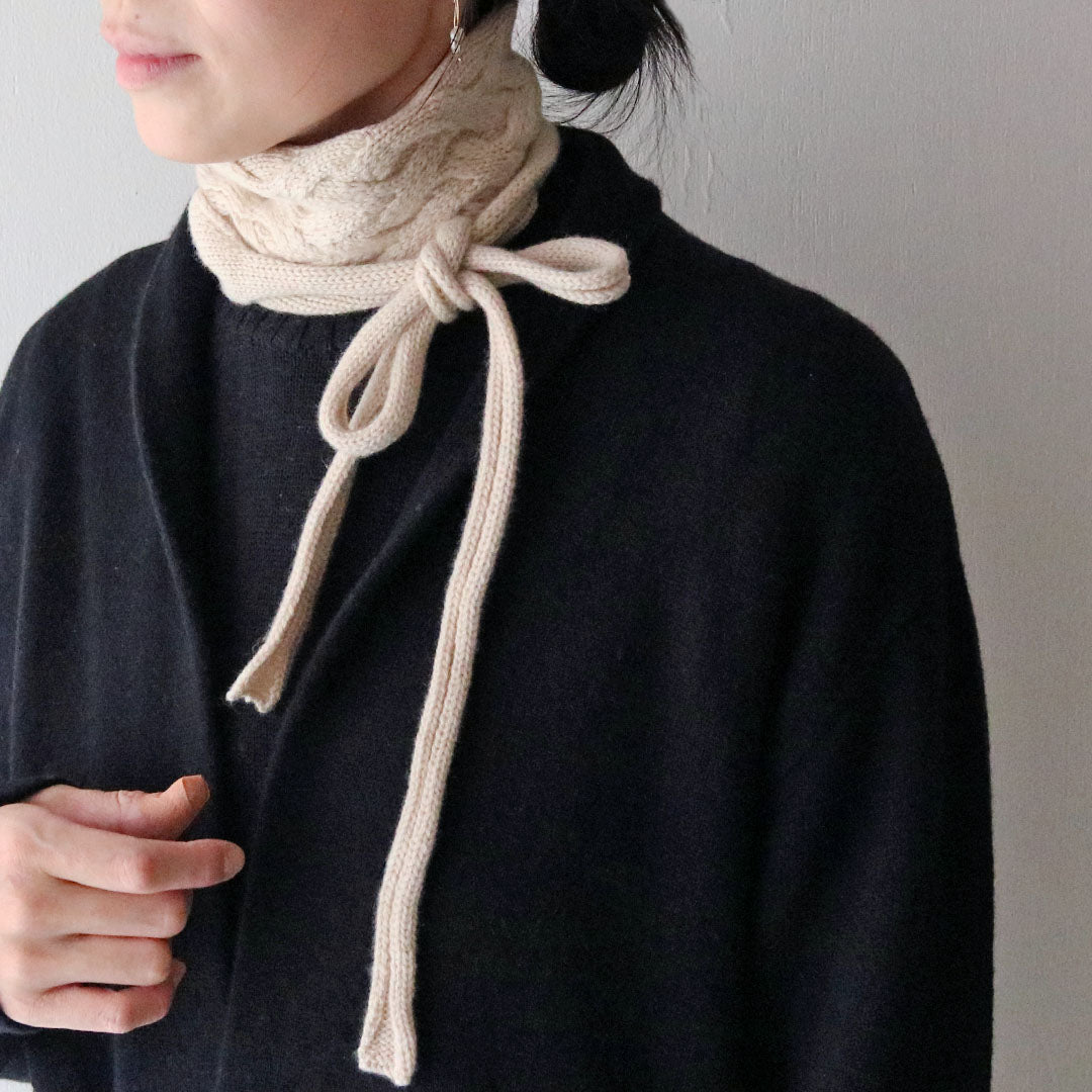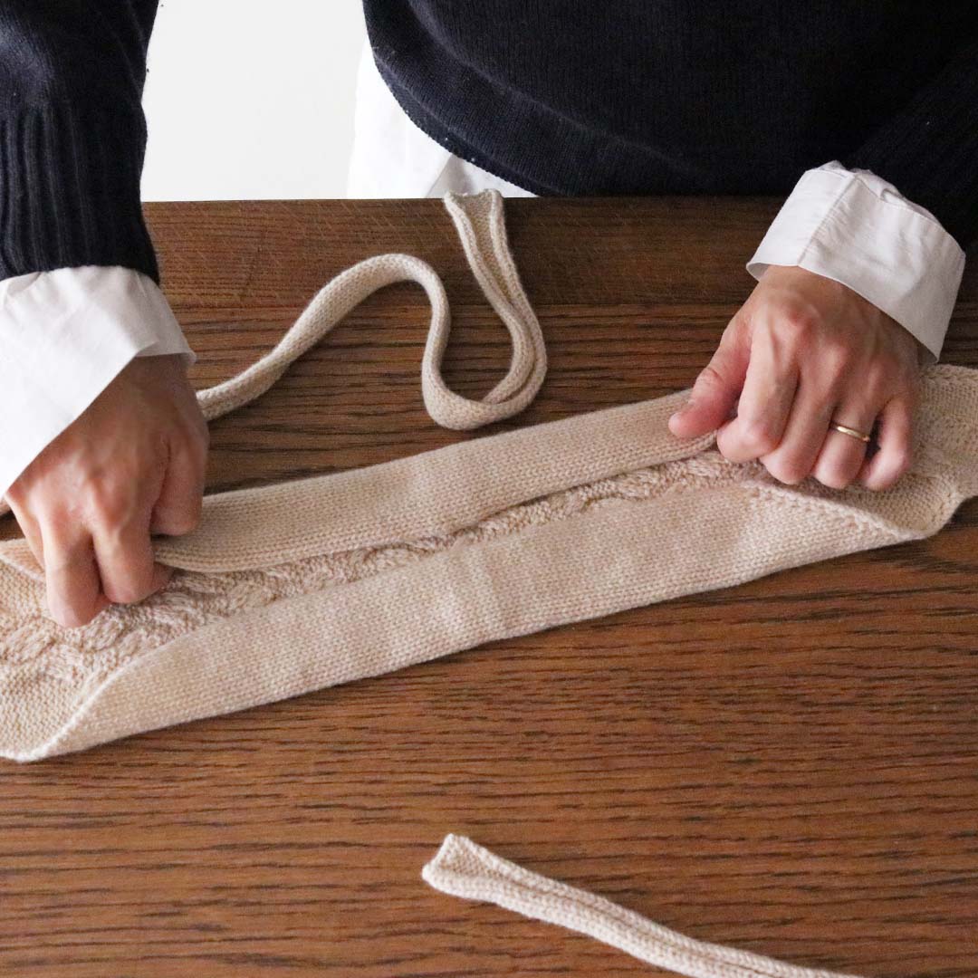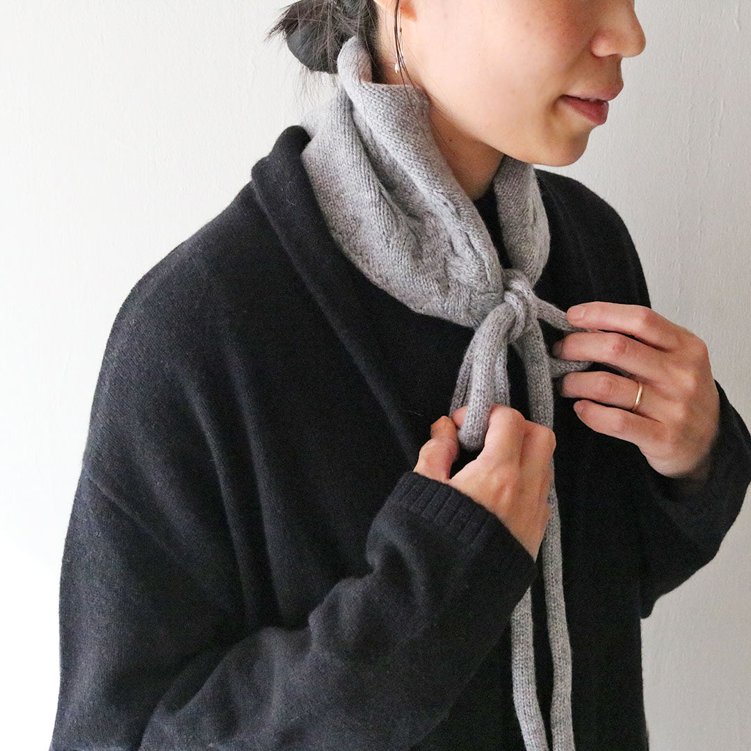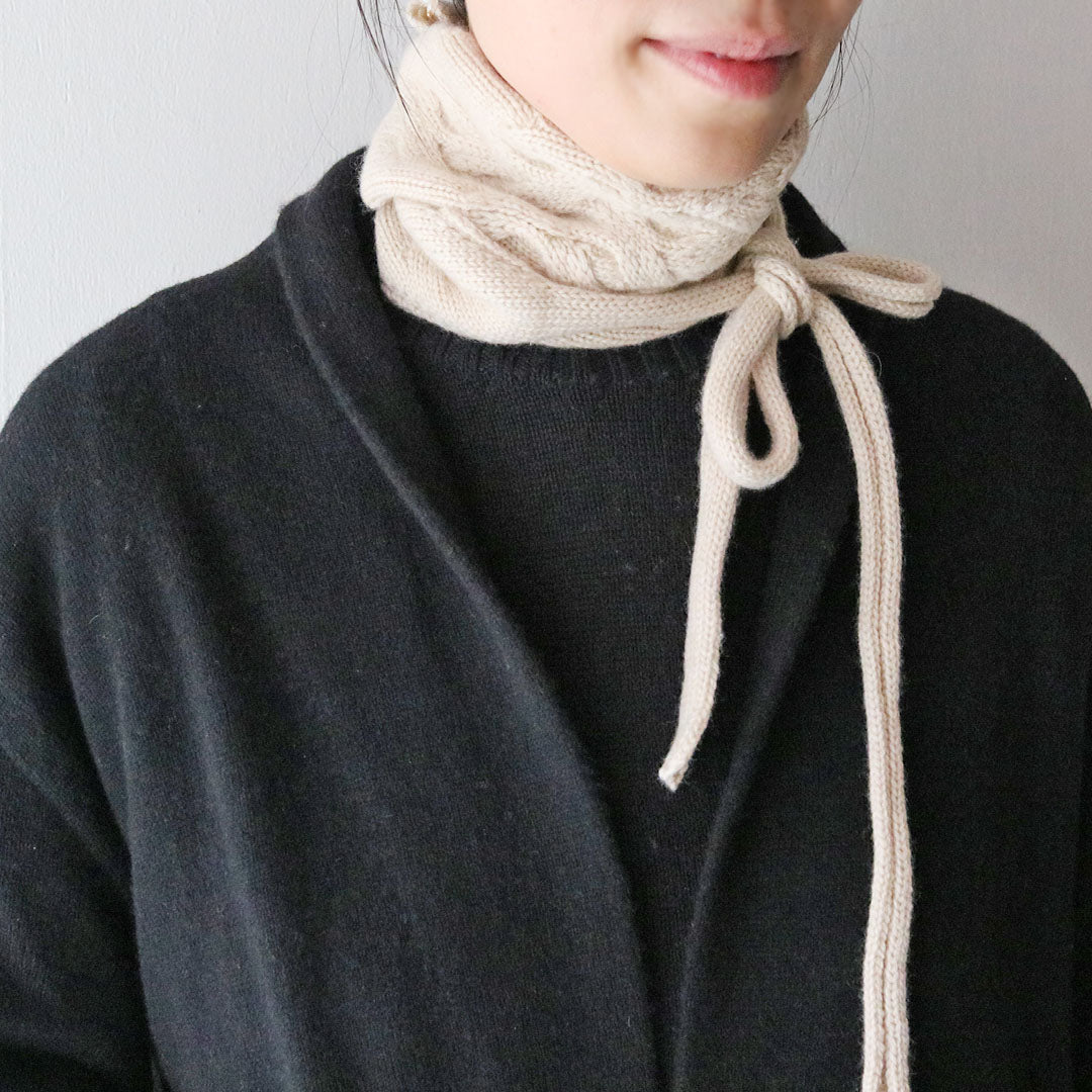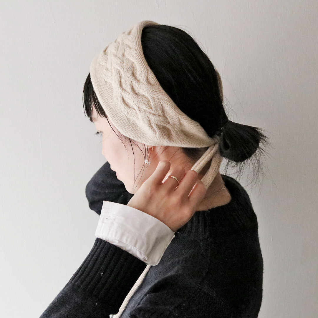 wrapはヘアバンドとしても、ストールとしても使えるアイテム。自分で紐を結ぶスタイルで締め付けがないので、つけ外しをしても跡がつきにくく、帽子よりも気軽にお使いいただけます。中央に配されたケーブル編みと長めのニット紐が特長で、装いに素朴な表情を添えてくれます。両端は三角形の形なので、耳まであたたかく覆ってくれます。