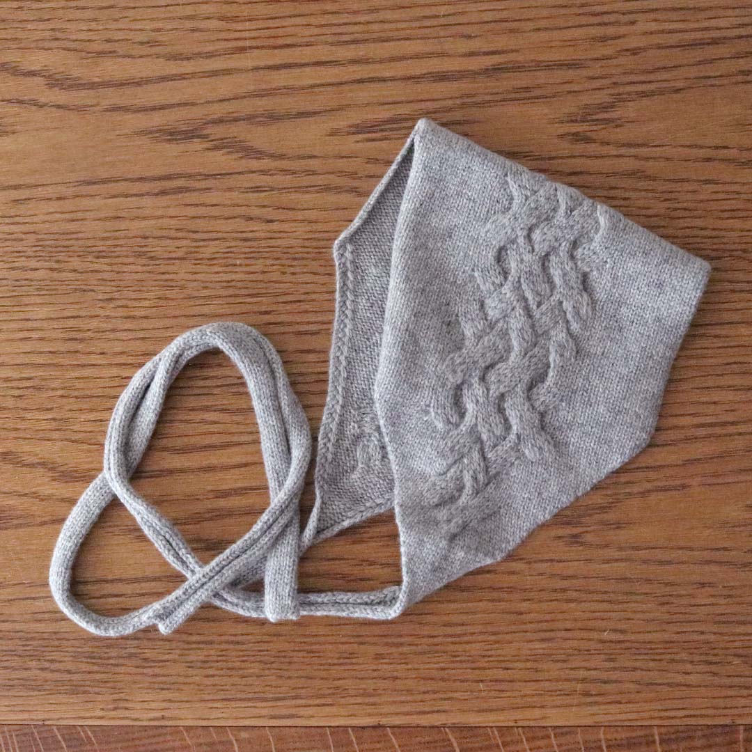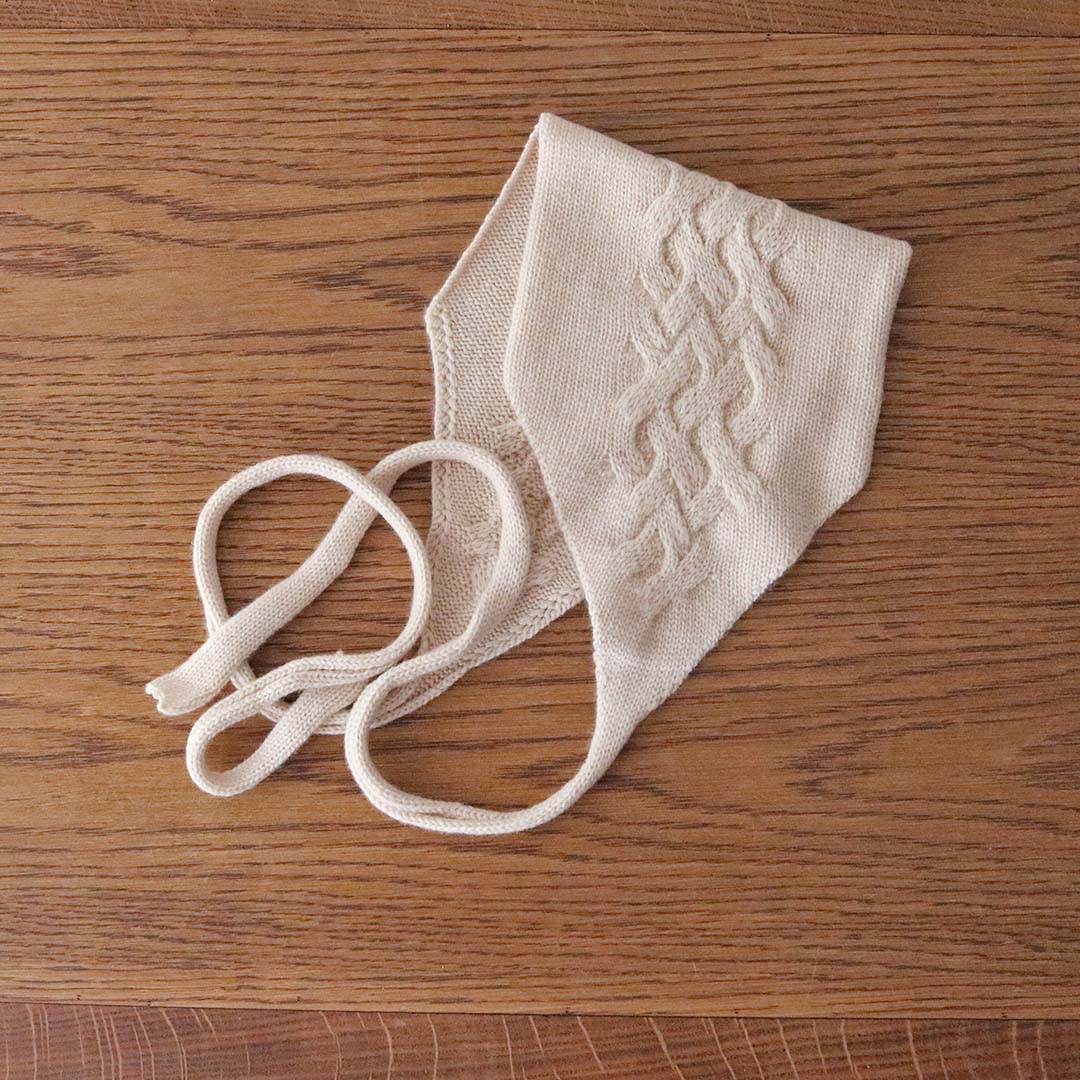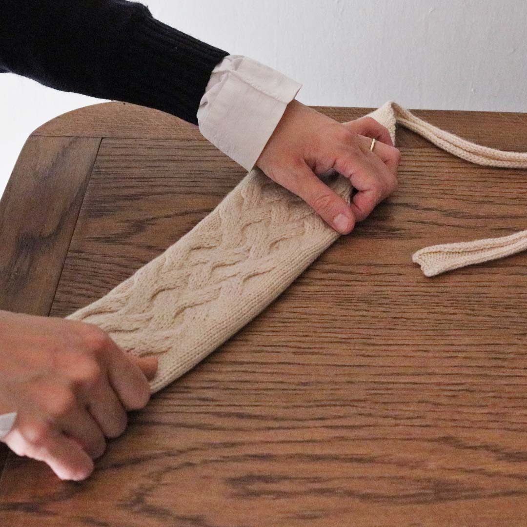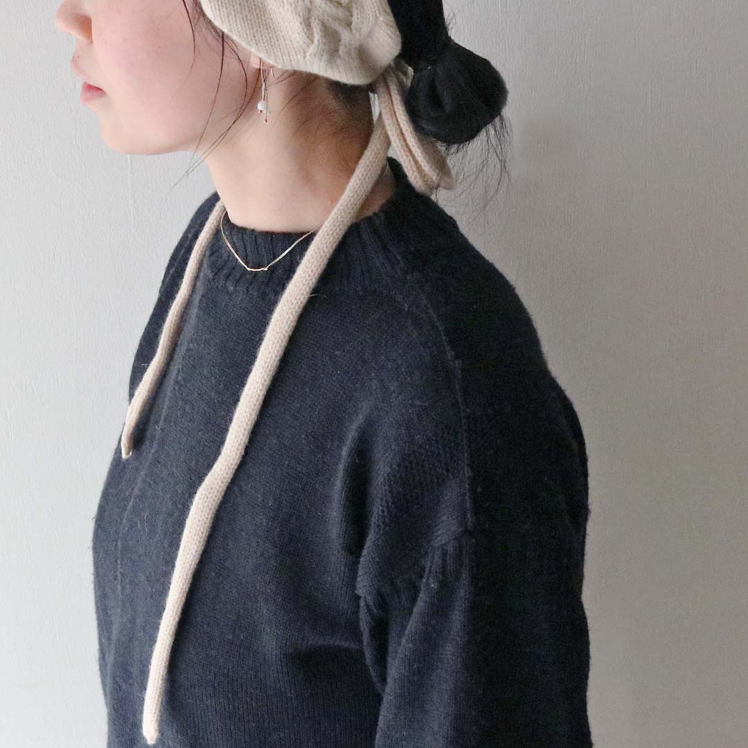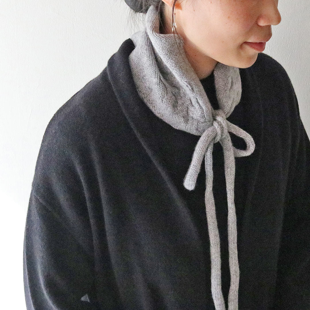 wrapはヘアバンドとしても、ストールとしても使えるアイテム。自分で紐を結ぶスタイルで締め付けがないので、つけ外しをしても跡がつきにくく、帽子よりも気軽にお使いいただけます。中央に配されたケーブル編みと長めのニット紐が特長で、装いに素朴な表情を添えてくれます。両端は三角形の形なので、耳まであたたかく覆ってくれます。