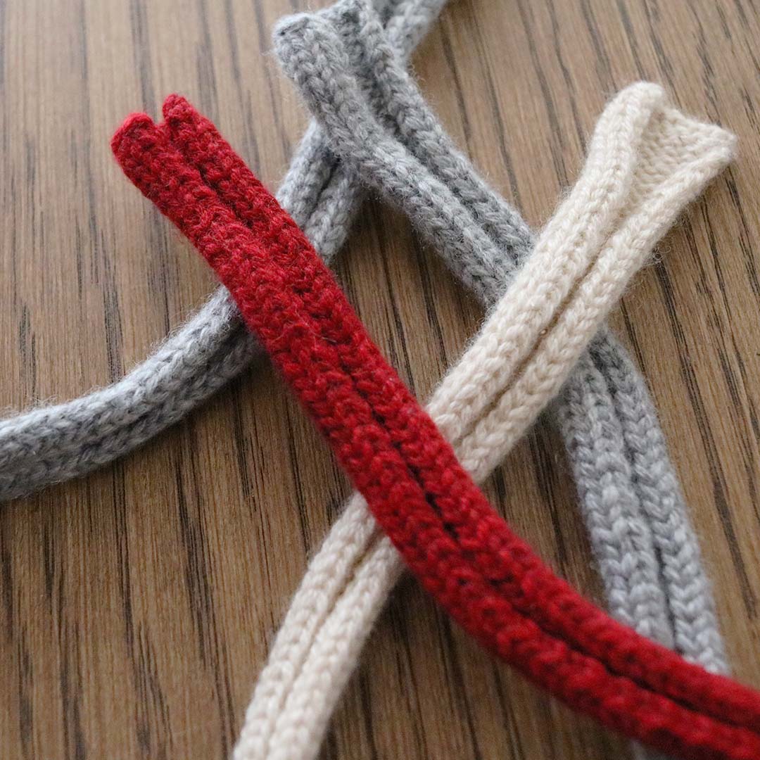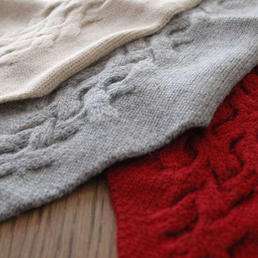 ベージュは漂白せず、染めを施していないカシミヤそのままの色を使用。グレーとレッドは原毛の段階で染め、何色かのわたを混ぜあわせることで表情のある色を表現しています。