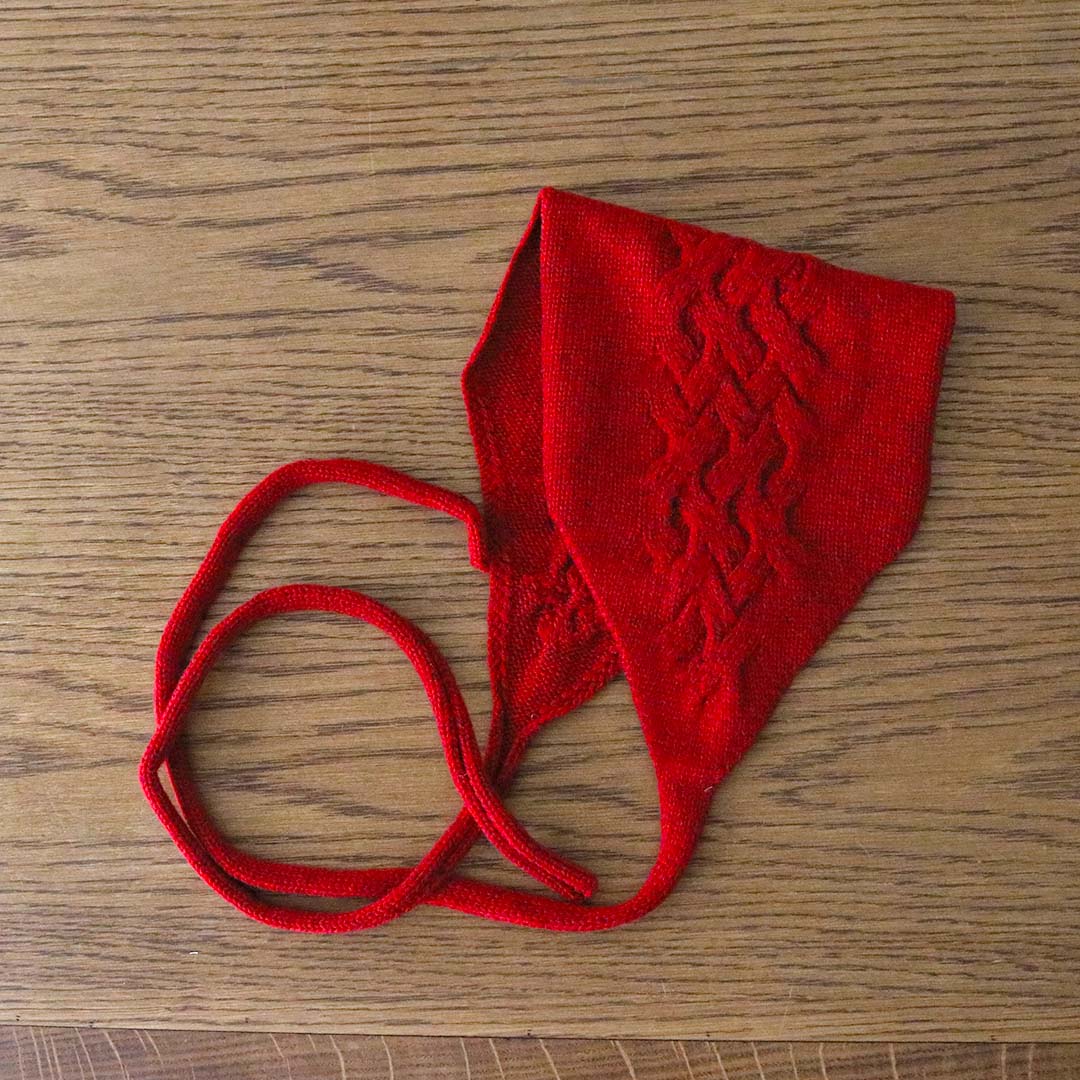 ヘアに使う場合は、そのまま被ったり、両端を少し折りたたんでかぶることで雰囲気が変わります。紐を下で結んだり、ぐるりと回して上で結んだり、長めの紐はアレンジしやすいです。▲両端を折ってヘアバンドとして