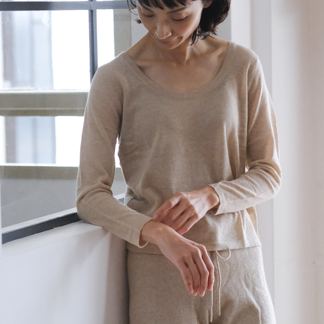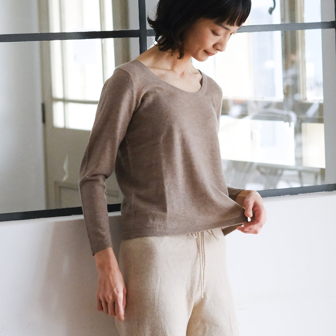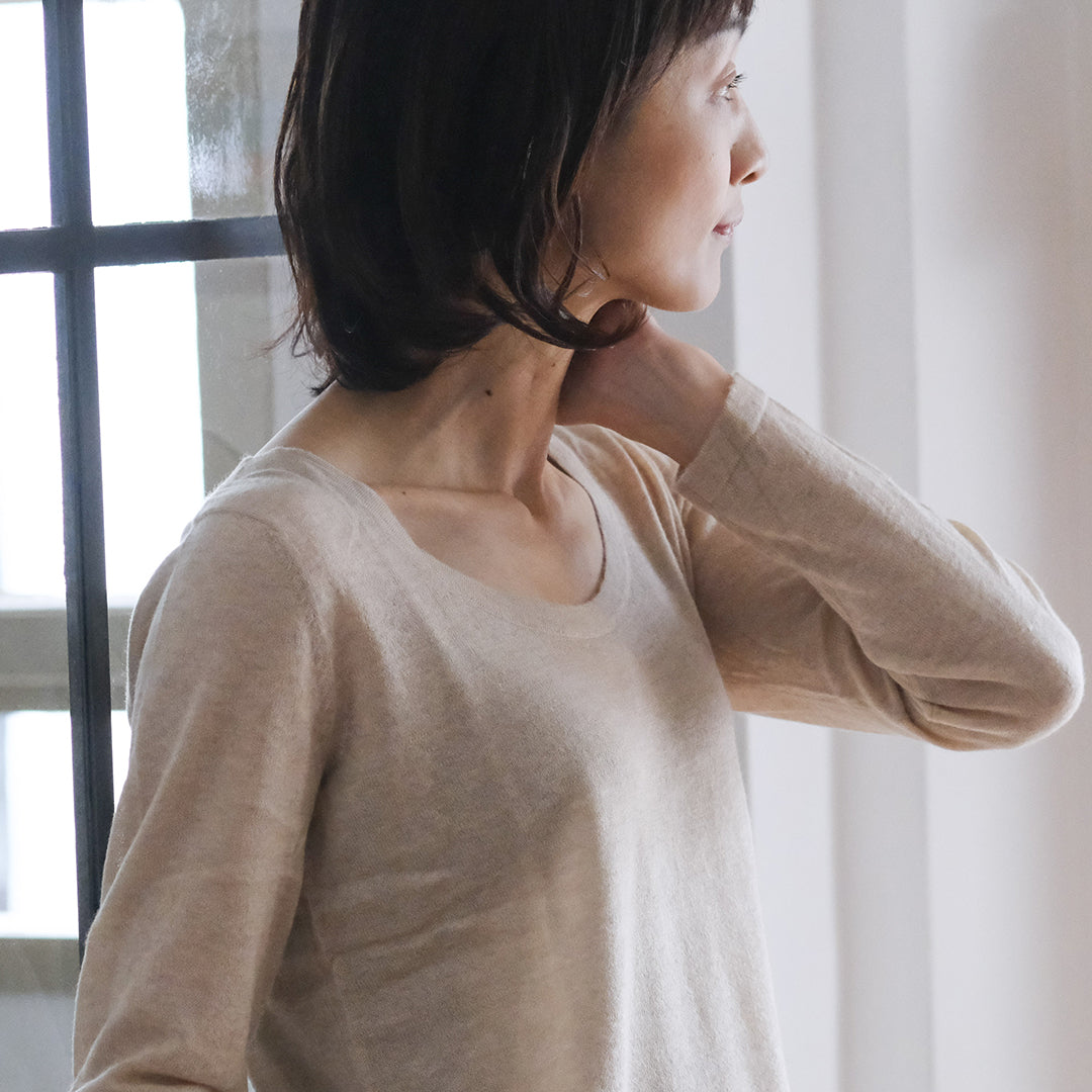 極細のインナー用カシミヤ糸を使い、繊細な編み目とつるりとした着心地を実現しています。