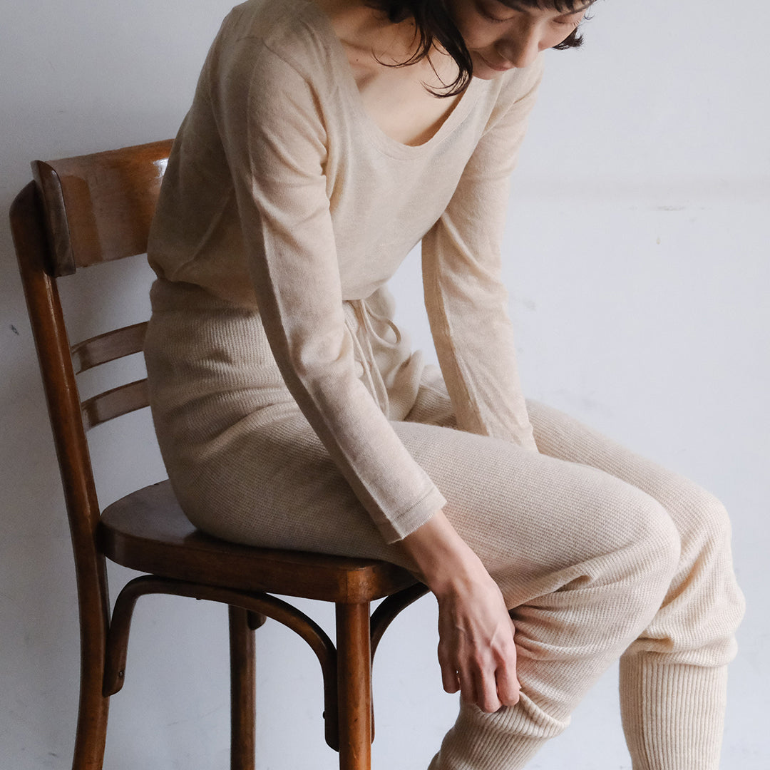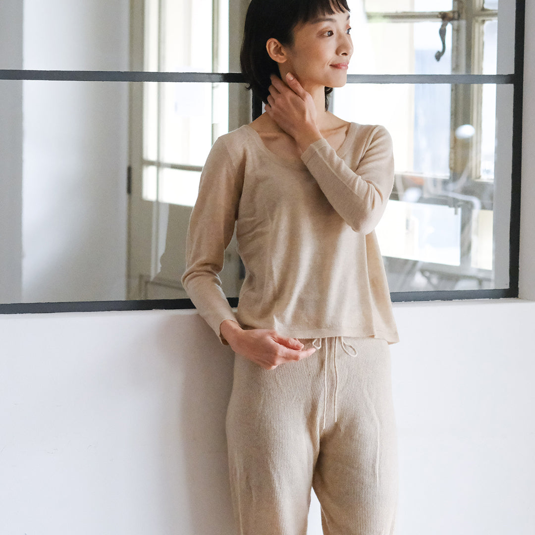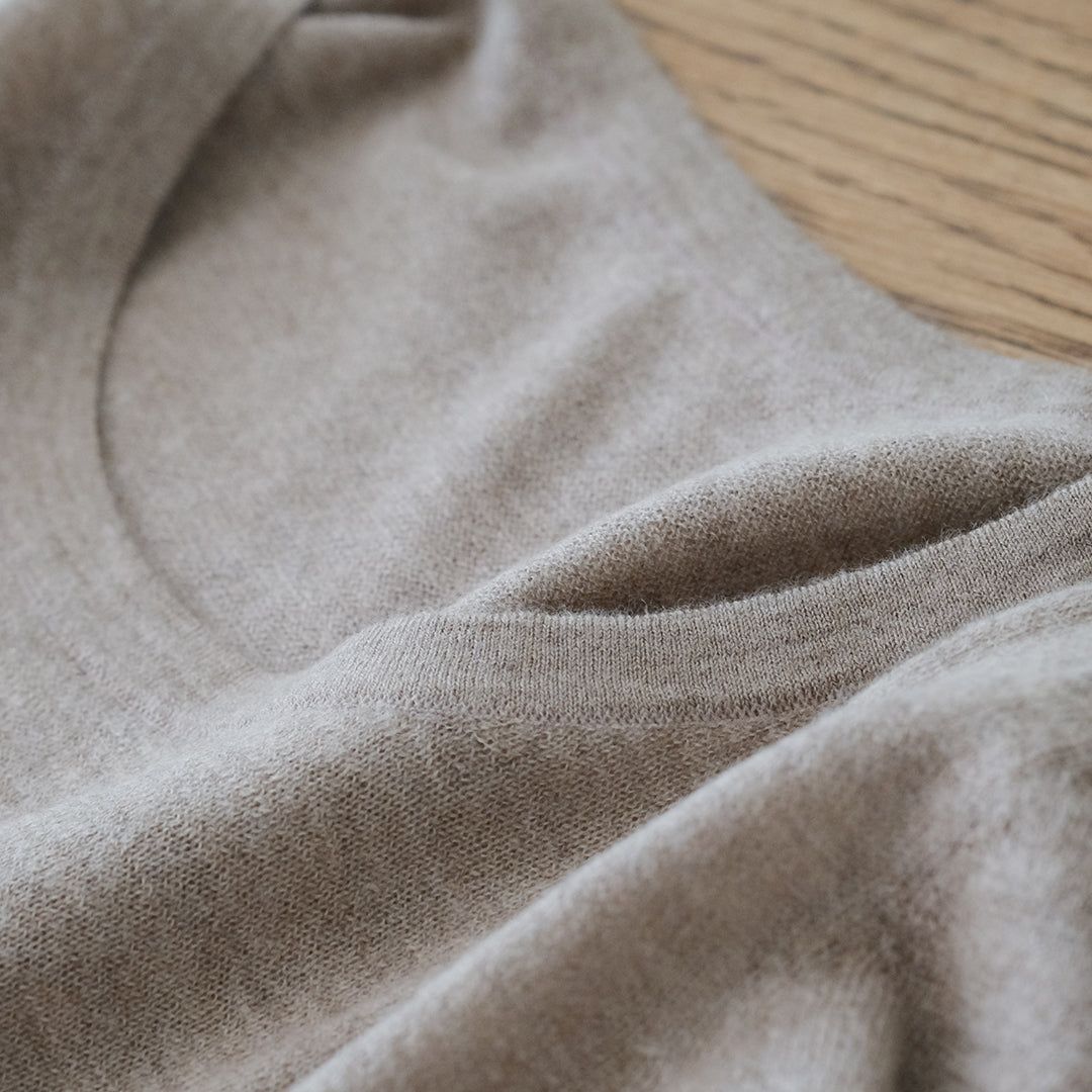 極細のインナー用カシミヤ糸を使い、繊細な編み目とつるりとした着心地を実現しています。