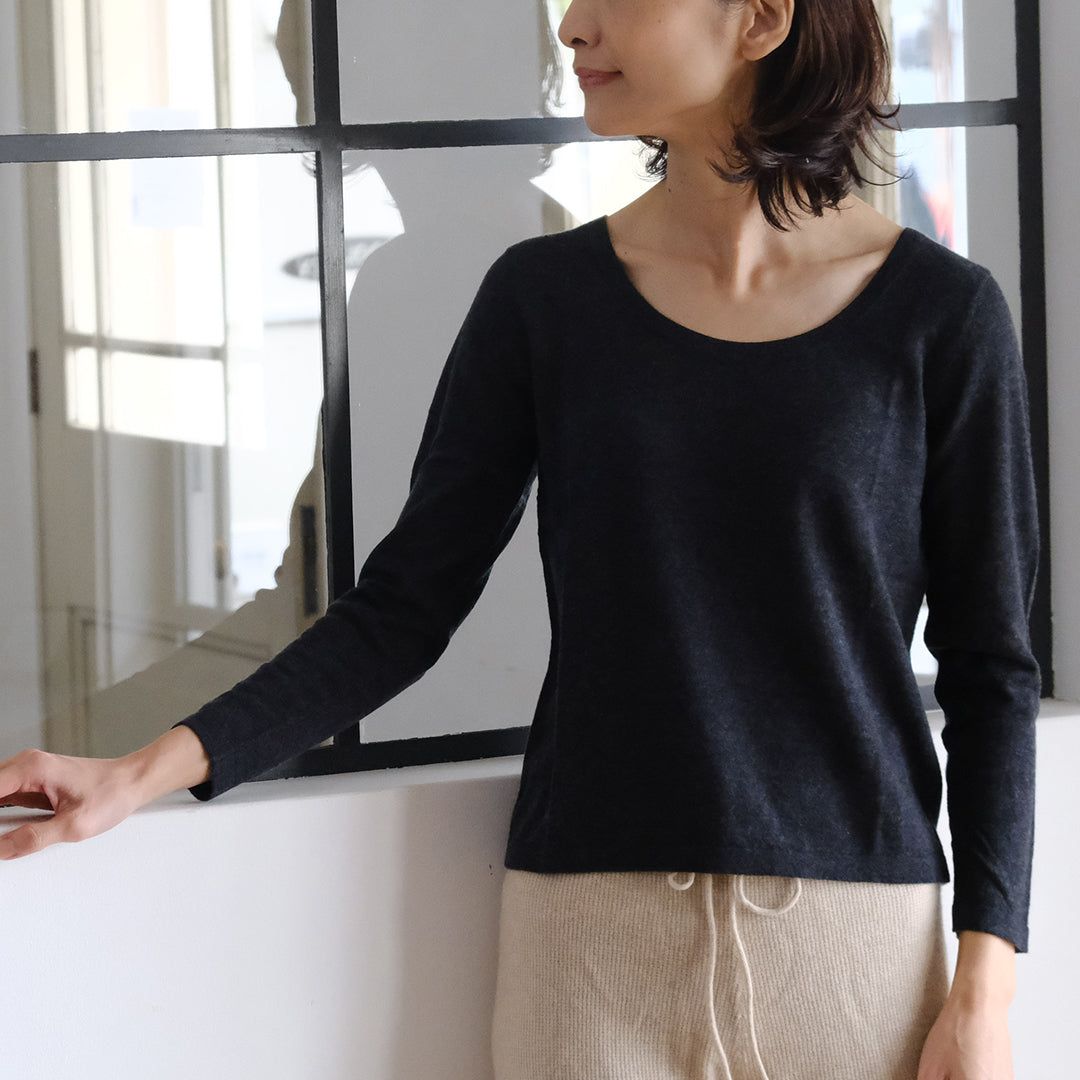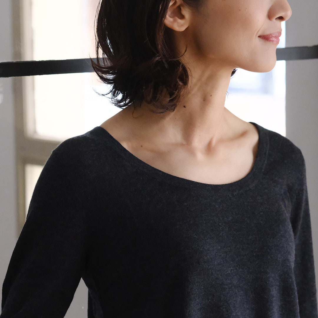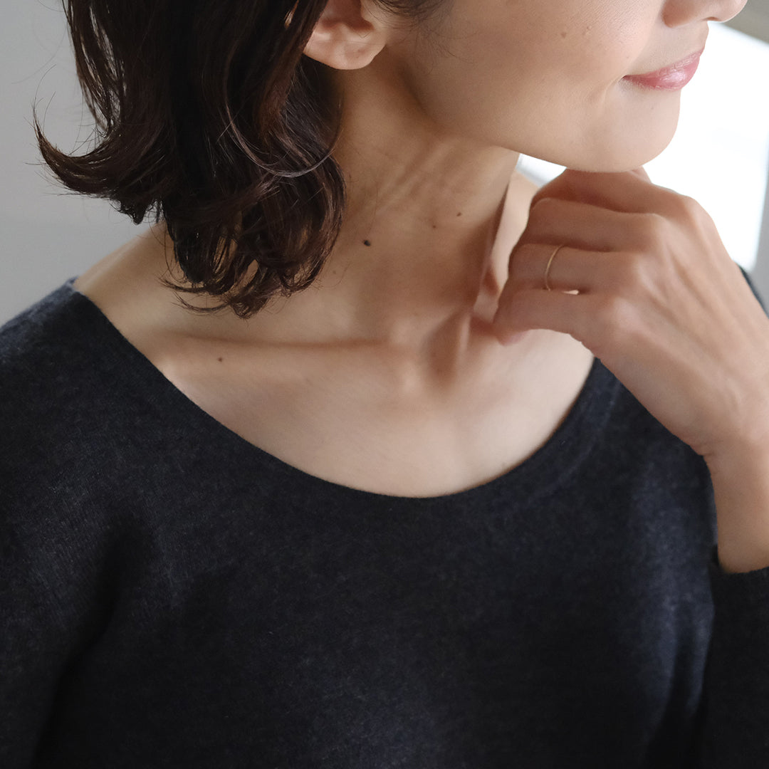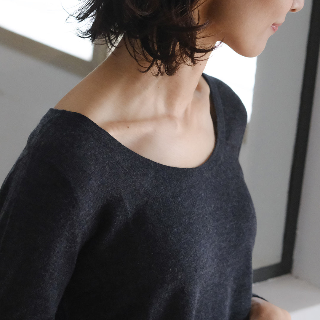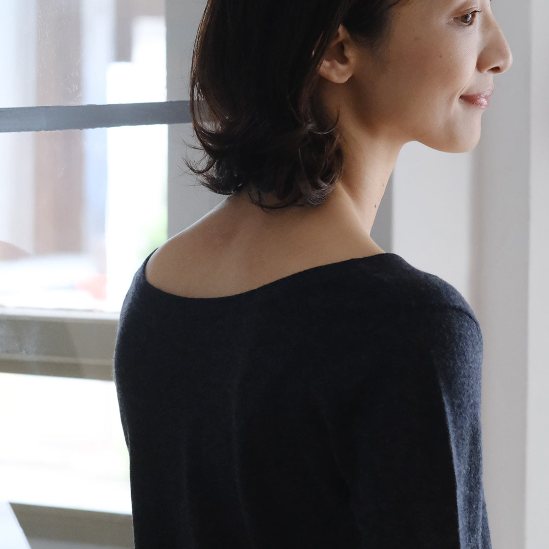 前後共にラウンドした美しいネックラインが特長。インナーとしておつくりしていますが、そのままデニムなどと合わせてラフに着こなすこともできます。