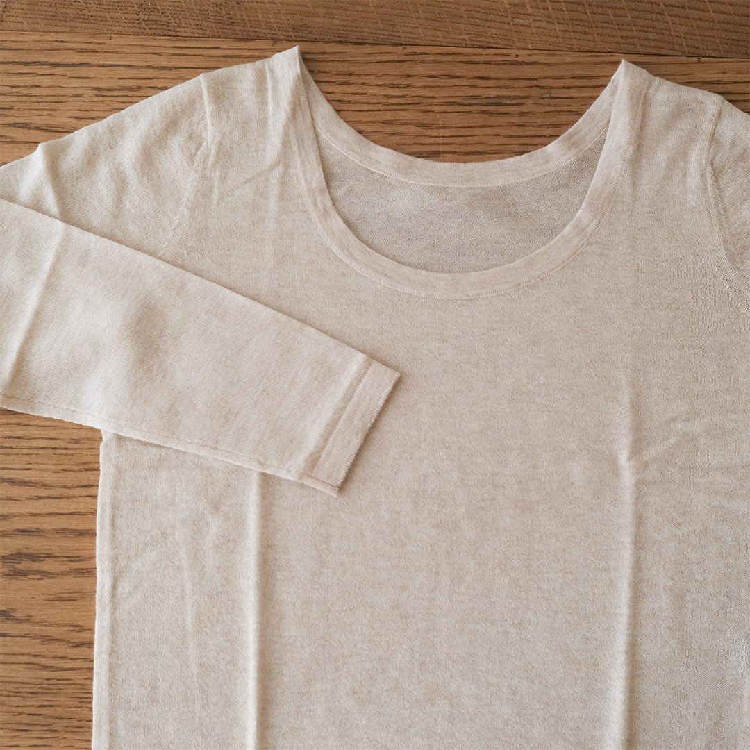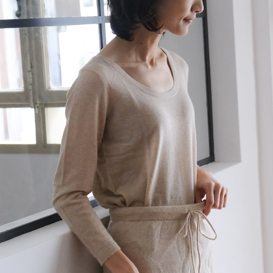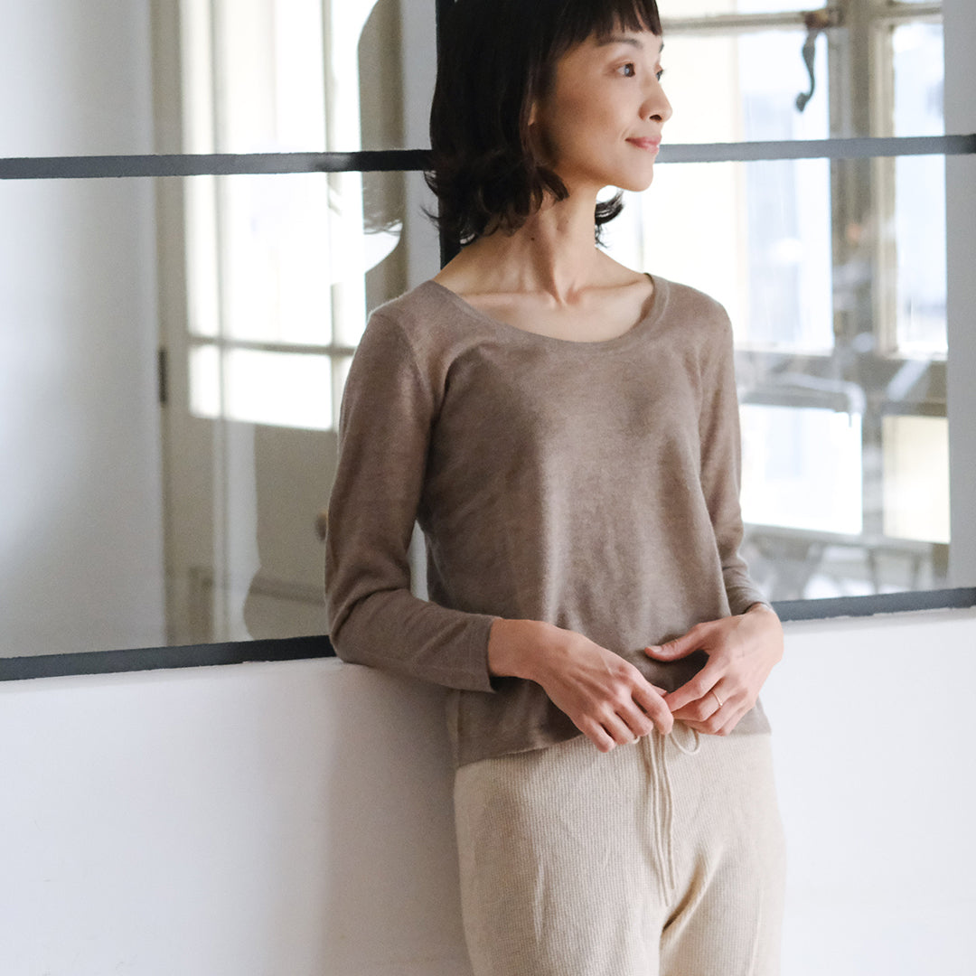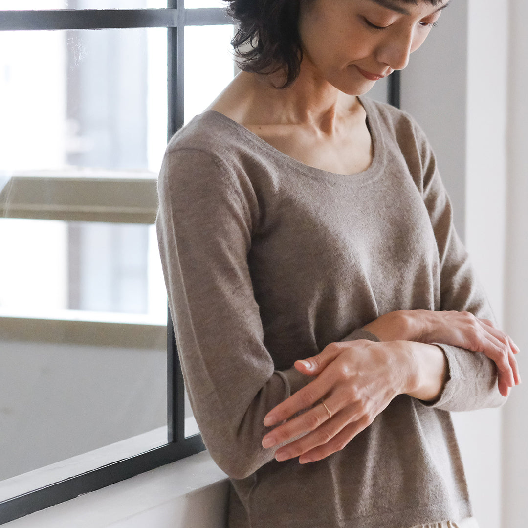 前後共にラウンドした美しいネックラインが特長。インナーとしておつくりしていますが、そのままデニムなどと合わせてラフに着こなすこともできます。