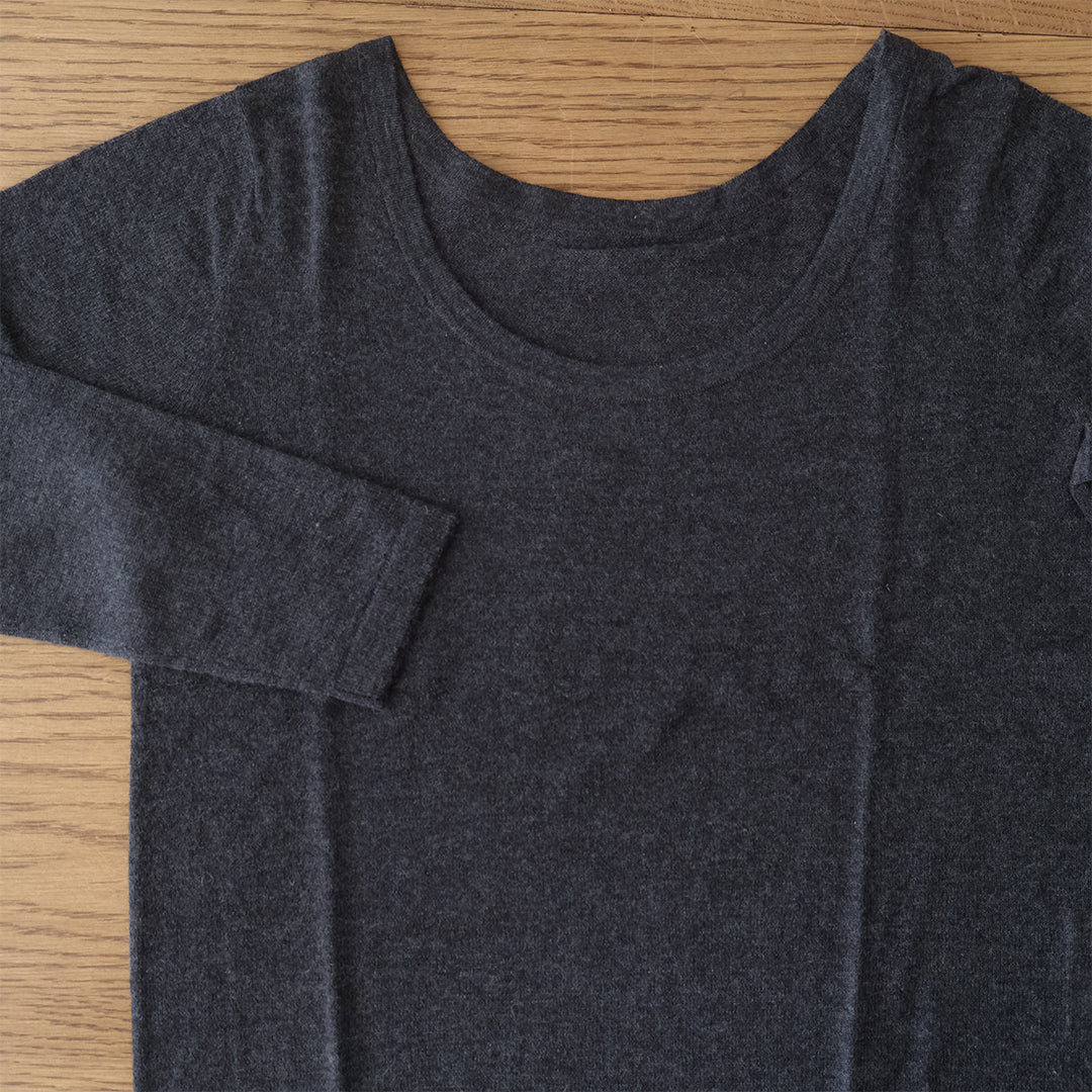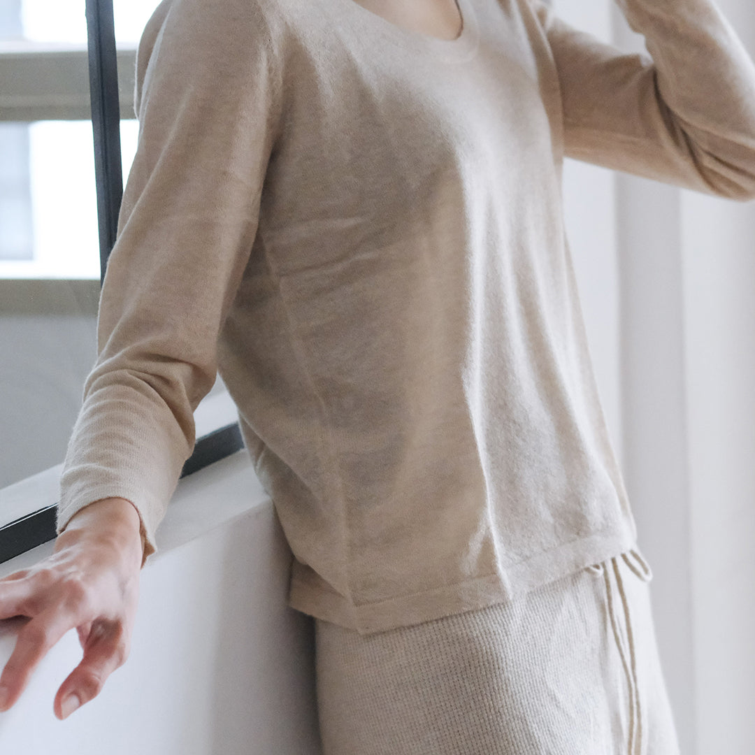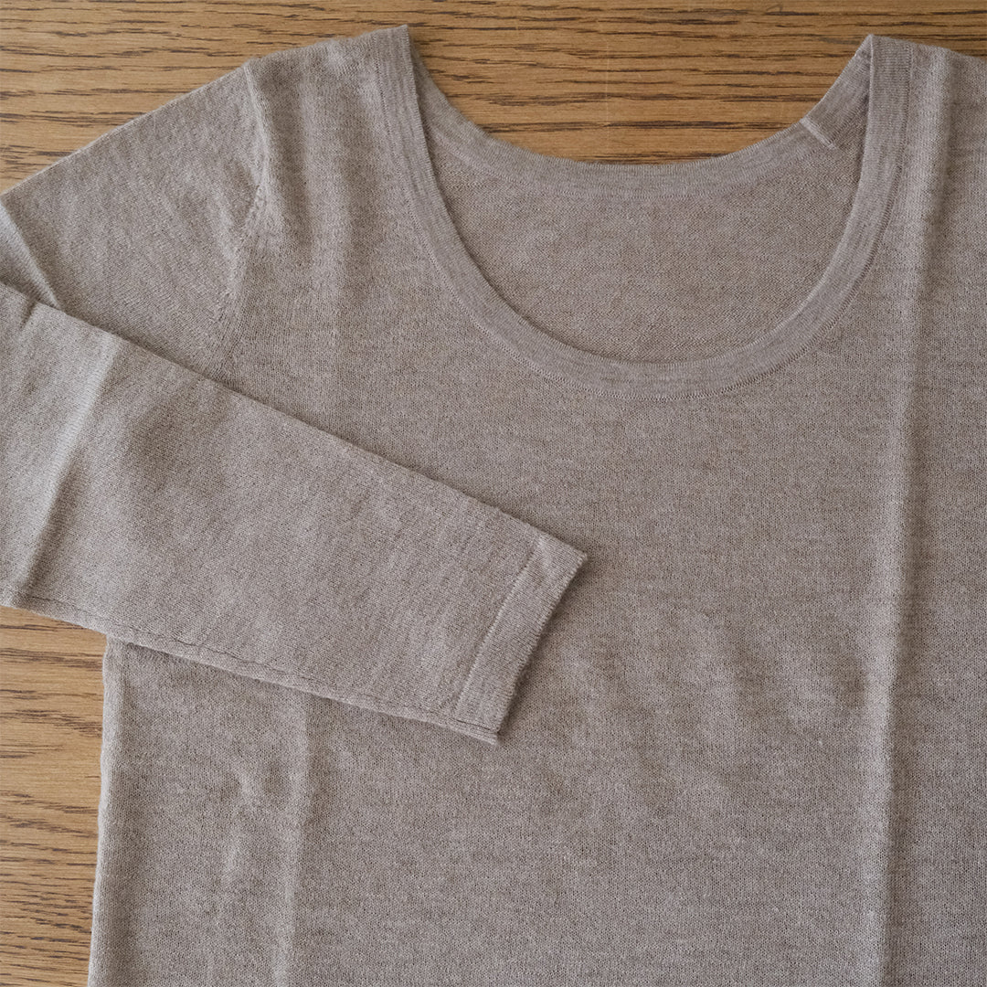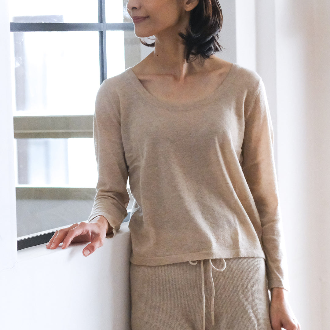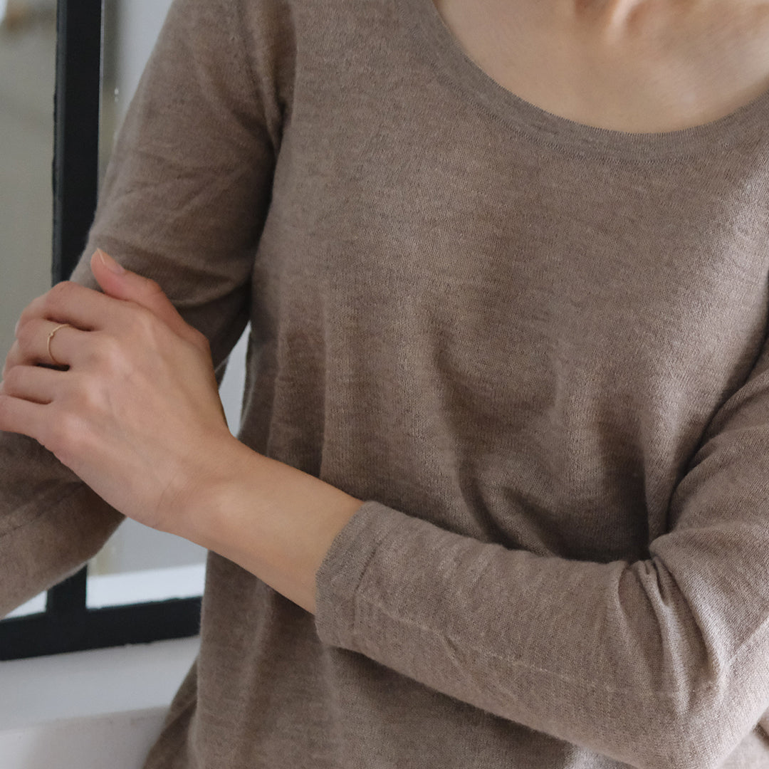 前後共にラウンドした美しいネックラインが特長。インナーとしておつくりしていますが、そのままデニムなどと合わせてラフに着こなすこともできます。