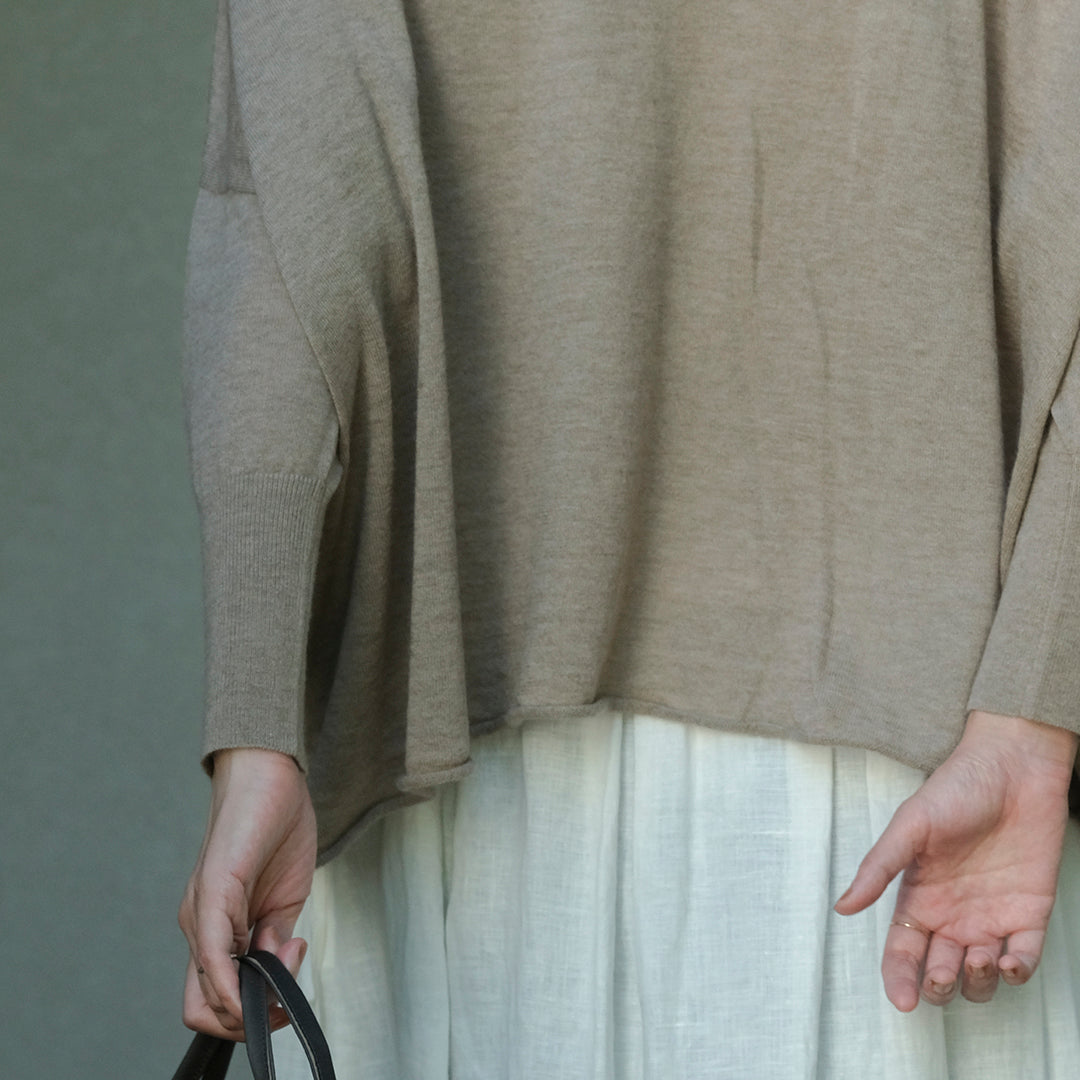 上品なリラックス感のあるドロップショルダーに、ゆったりと身体の線を拾いにくい身幅のあるデザイン。動きのある自然なドレープが大人の雰囲気です。