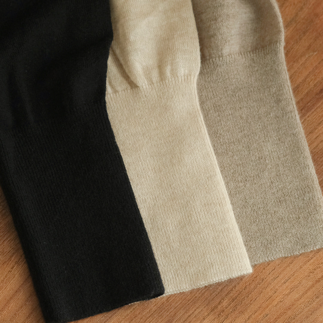 ブラックは原毛の段階で染めています。そうすることで、カシミヤへの負担が最小限に抑えられなめらかな手触りそのままに。