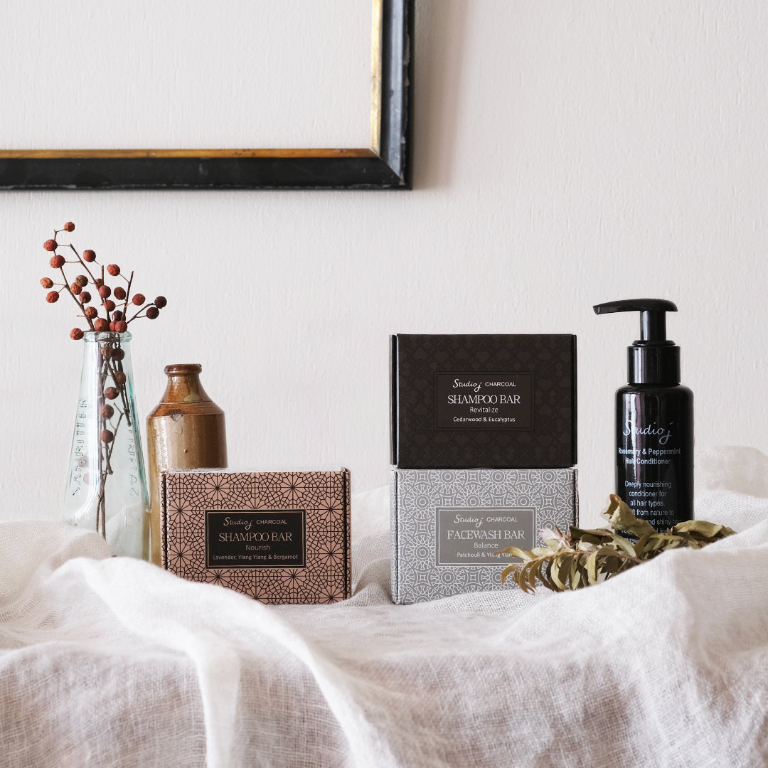 ケミカルな成分は一切使わず、活性炭と植物由来の天然精油でつくられたStudio jのシャンプーバー。シャンプーバー&ヘアコンディショナー、洗顔石けんをセットにした、お得なコンプリートセットのご紹介です。