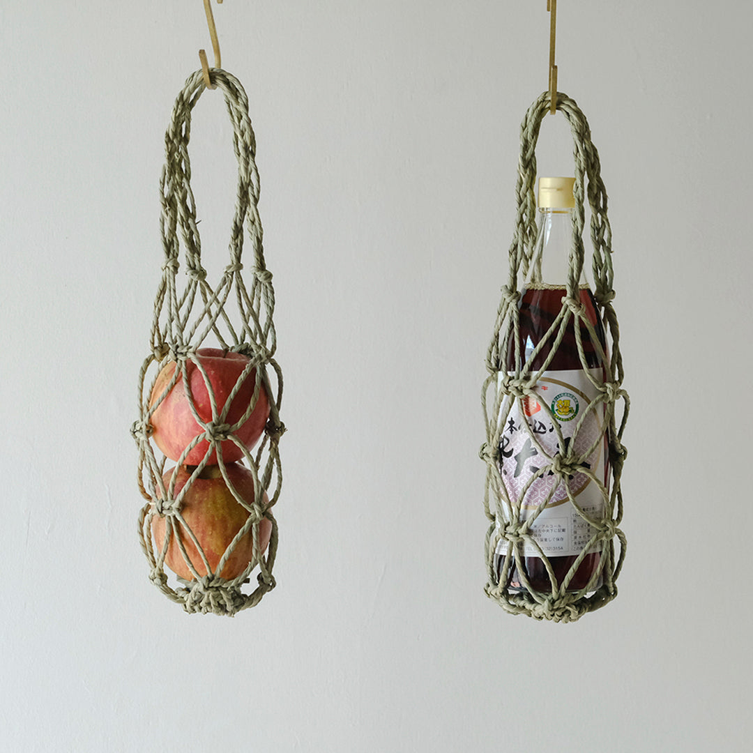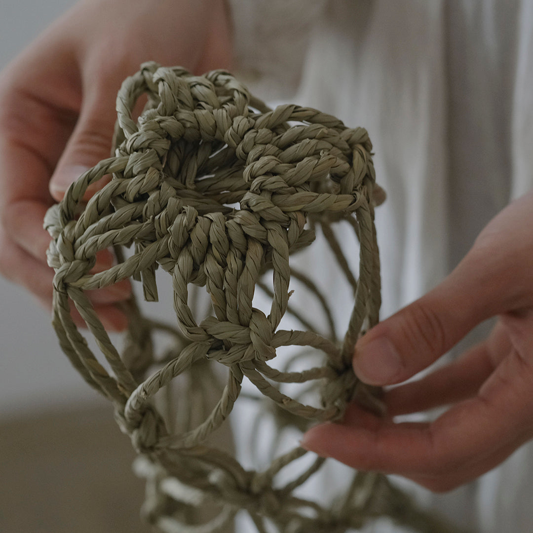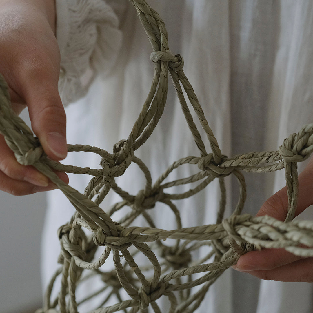 ネット状のかごは、職人である須浪隆貴さんがひとつひとつ編んだもの。まるで植物と会話するように、私たちが知らなかったいぐさの新しい表情をさらりと引き出します。