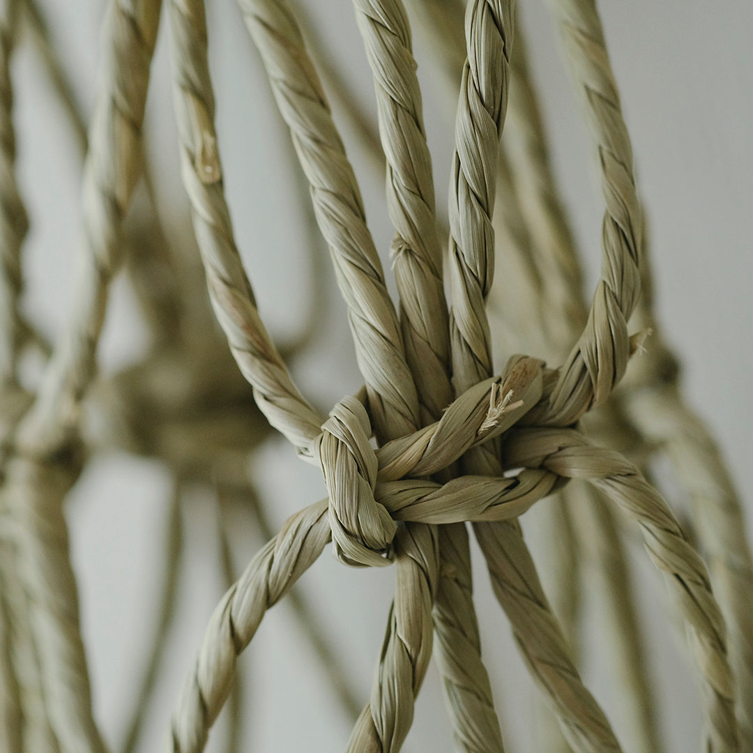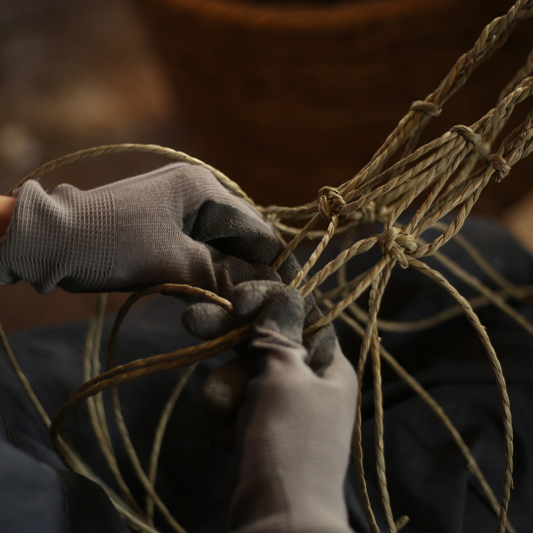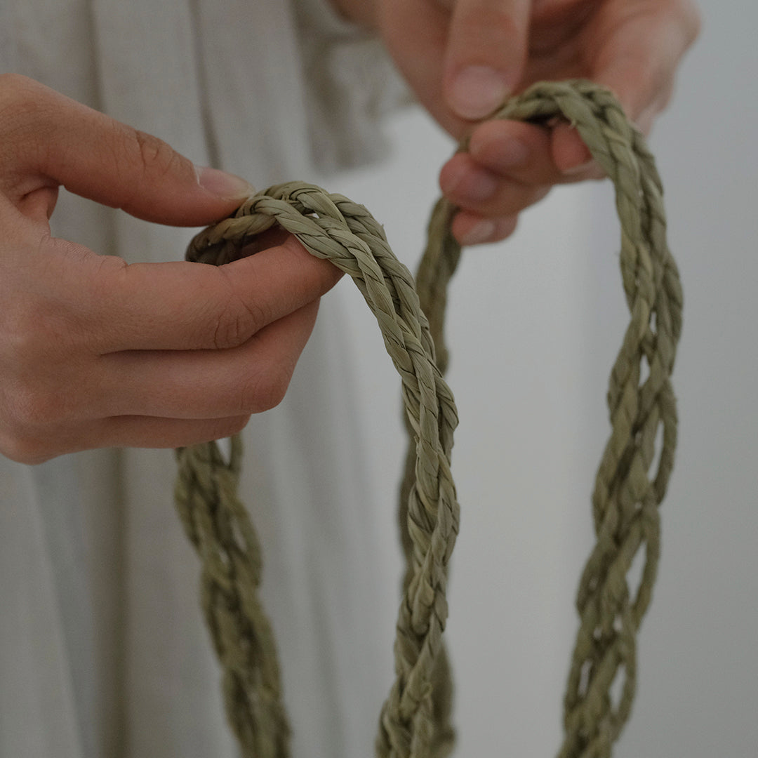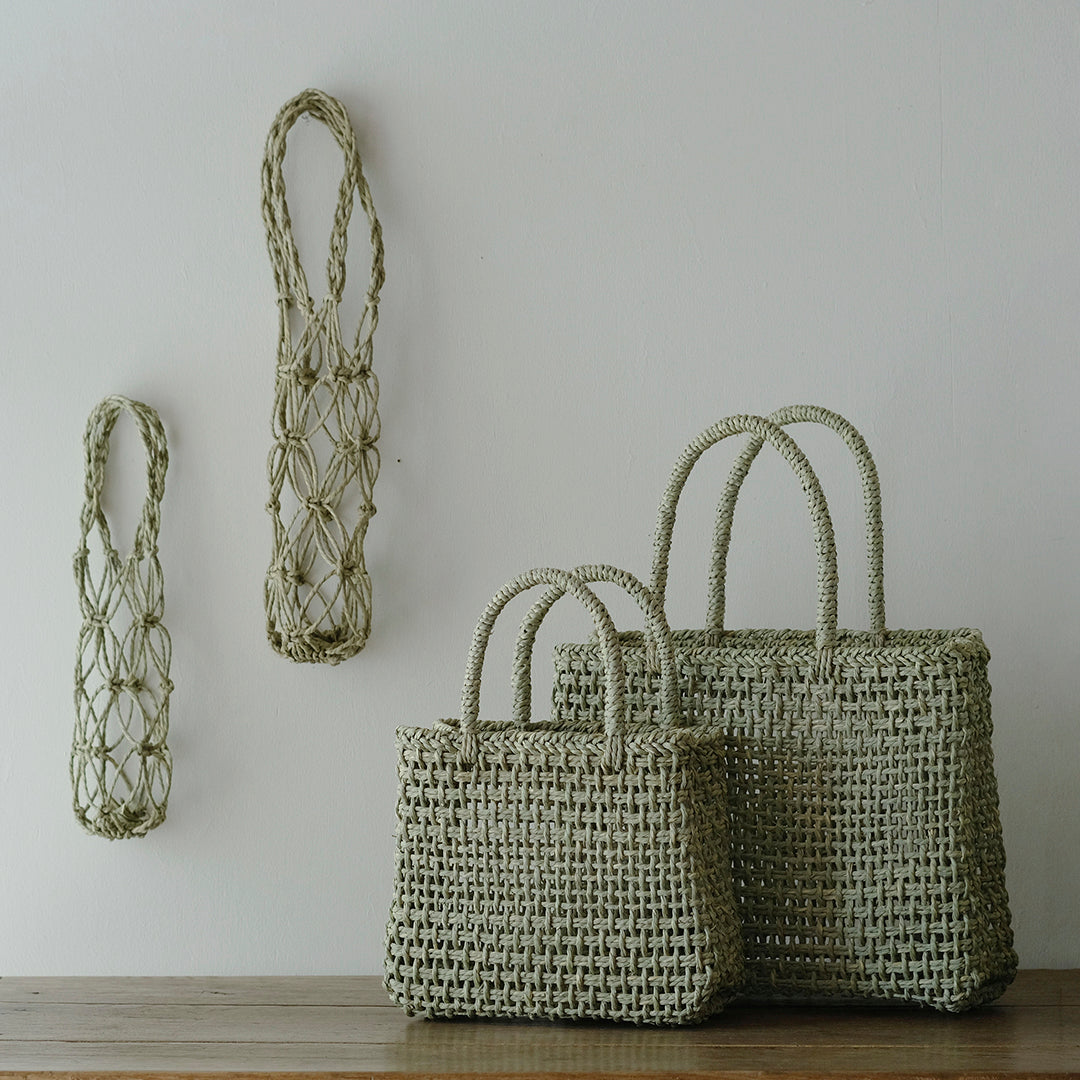 ネット状のかごは、職人である須浪隆貴さんがひとつひとつ編んだもの。まるで植物と会話するように、私たちが知らなかったいぐさの新しい表情をさらりと引き出します。