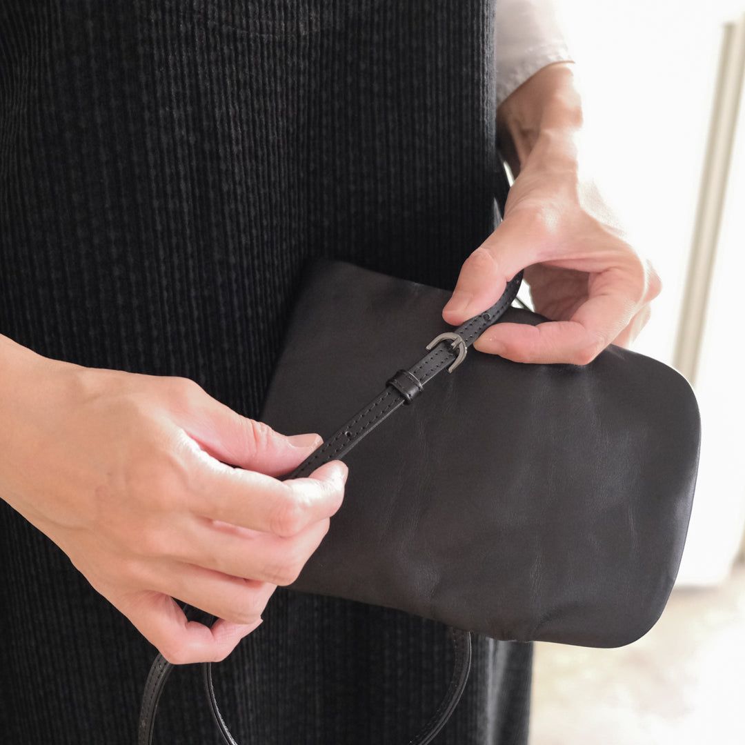 よく使うものを身につけることで、ものを探す手間がなくなり所作がスマートに。大切なものの居場所を決めておけば、とっさのお出かけにも安心です。▲ショルダーの調整部分が現在の仕様と異なります