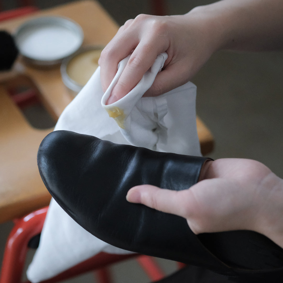 (3)よく馴染んだら円を描くように柔らかく(歯磨きより優しく)靴の内側かかとのほうから磨いてください。塗ったあとに手でマッサージするようとさらに効果的です。