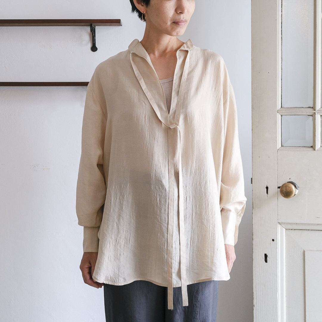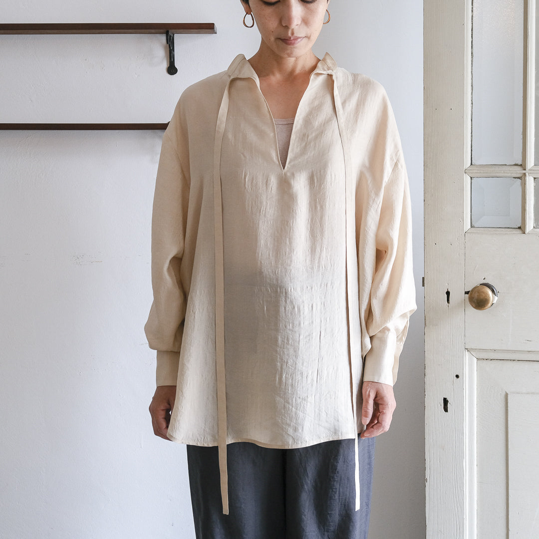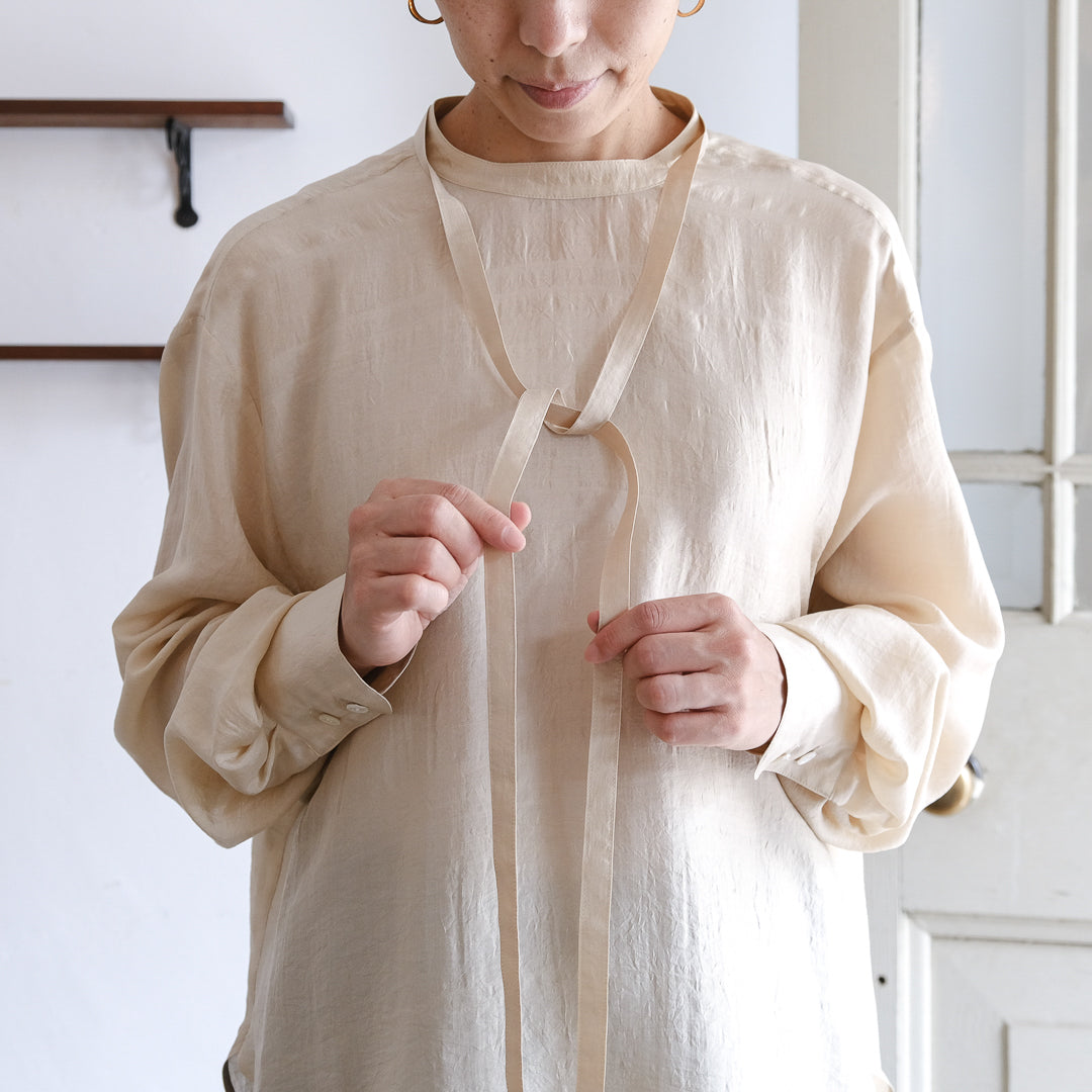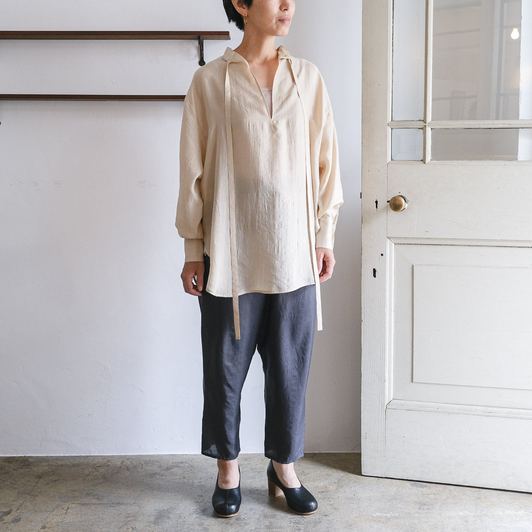 身頃も身体のラインを拾わないたっぷりとした身幅で、ストレスフリーに。前後差のついた裾、ラウンドカットのヘムラインは横から見ても表情豊かです。一見シンプルなかたちですが、ゆとりのとり方やディテールに大人が着たくなる工夫があるボウタイブラウス。いろいろな着こなしを楽しんでください。