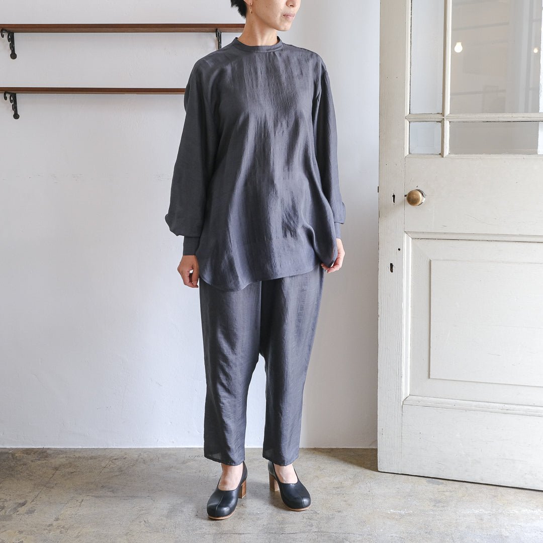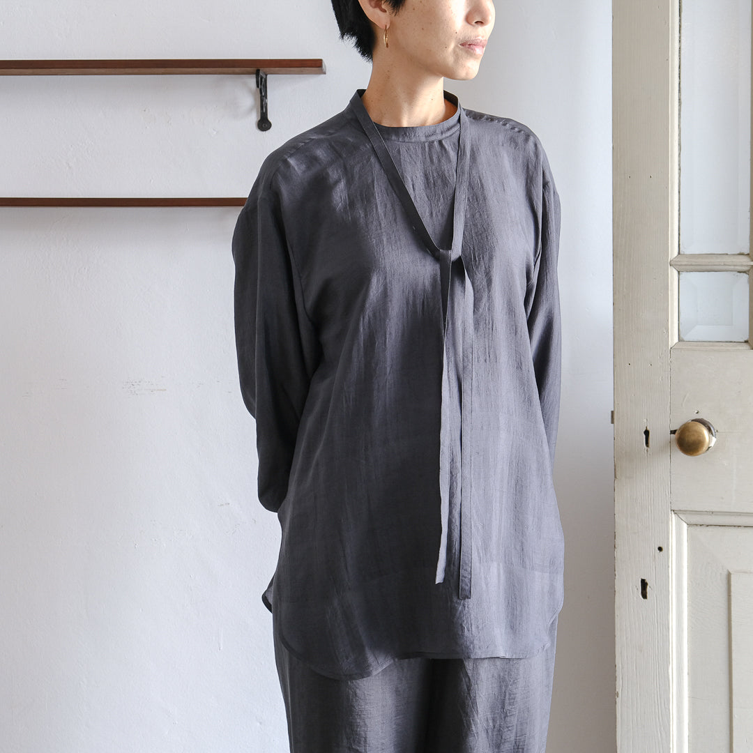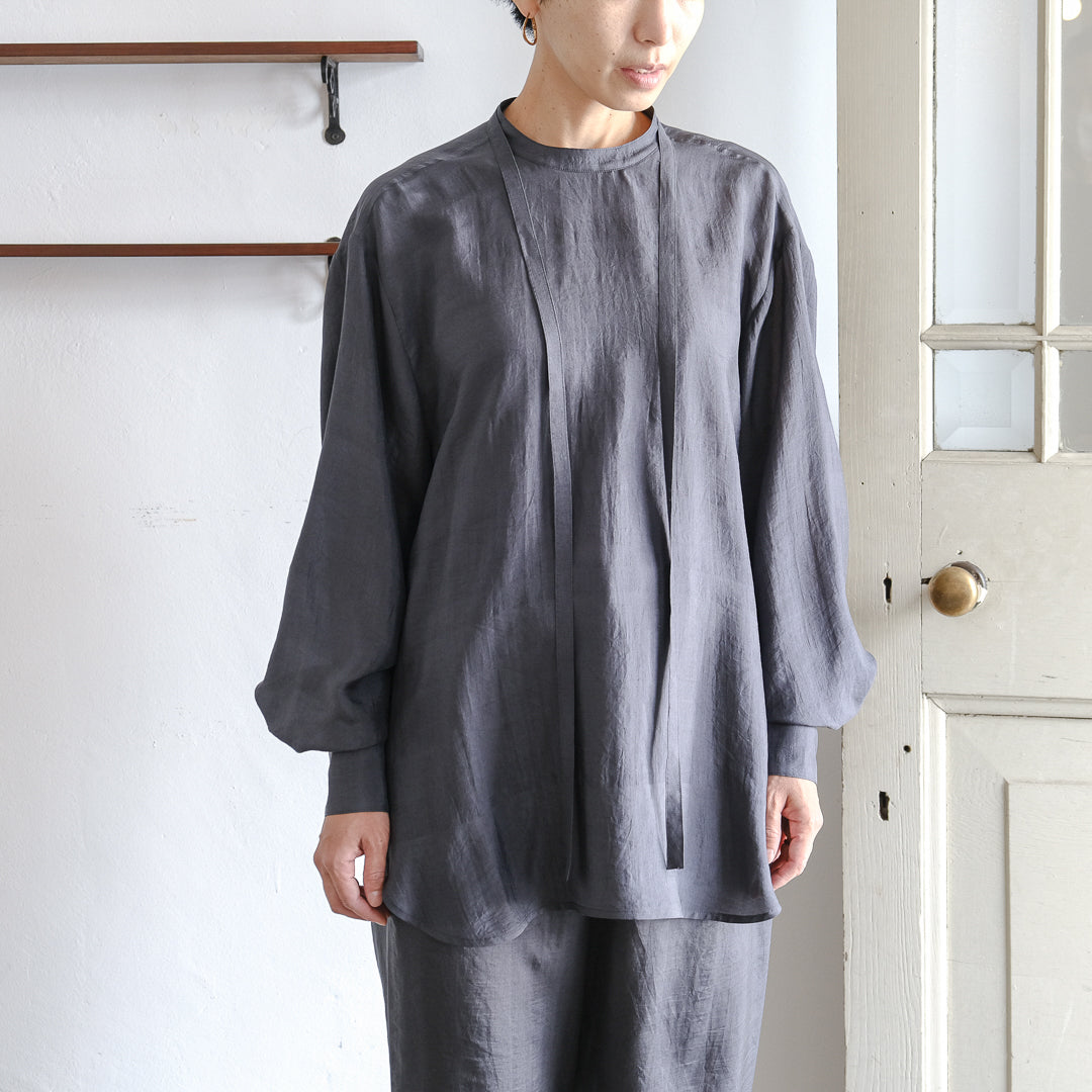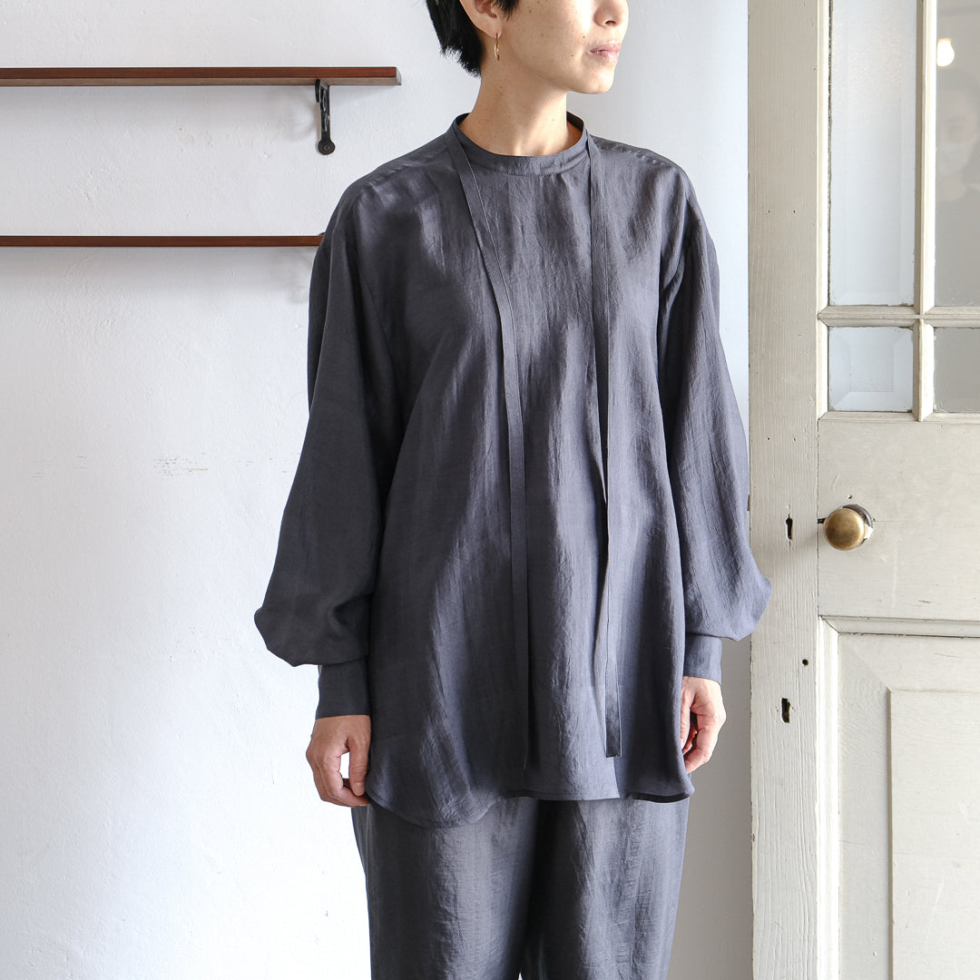 身頃も身体のラインを拾わないたっぷりとした身幅で、ストレスフリーに。前後差のついた裾、ラウンドカットのヘムラインは横から見ても表情豊かです。一見シンプルなかたちですが、ゆとりのとり方やディテールに大人が着たくなる工夫があるボウタイブラウス。いろいろな着こなしを楽しんでください。