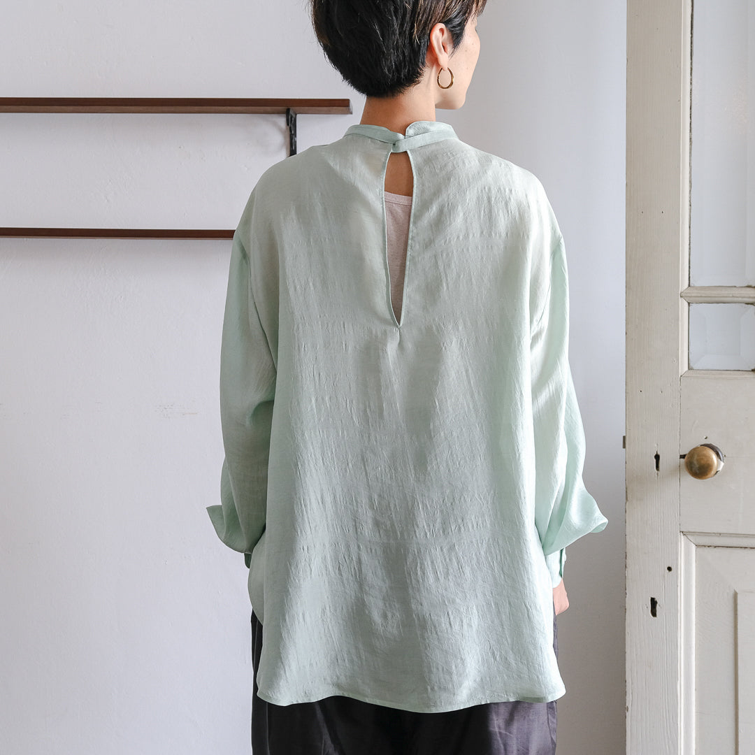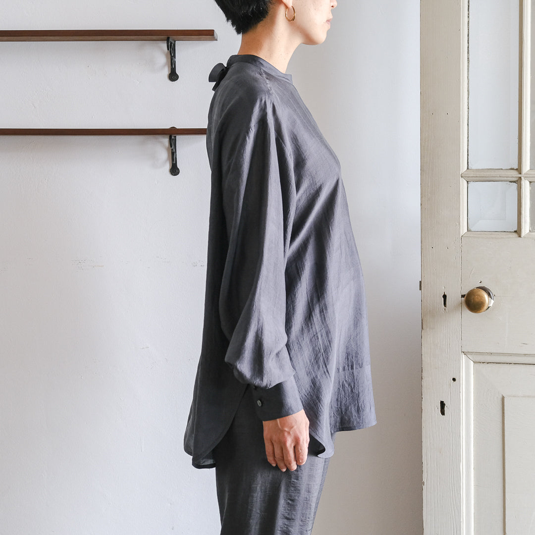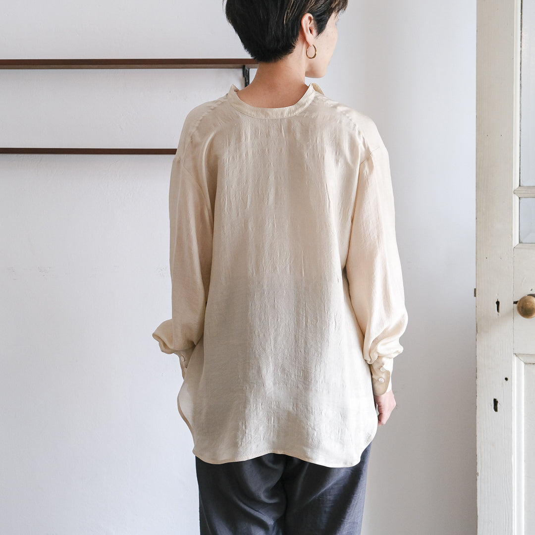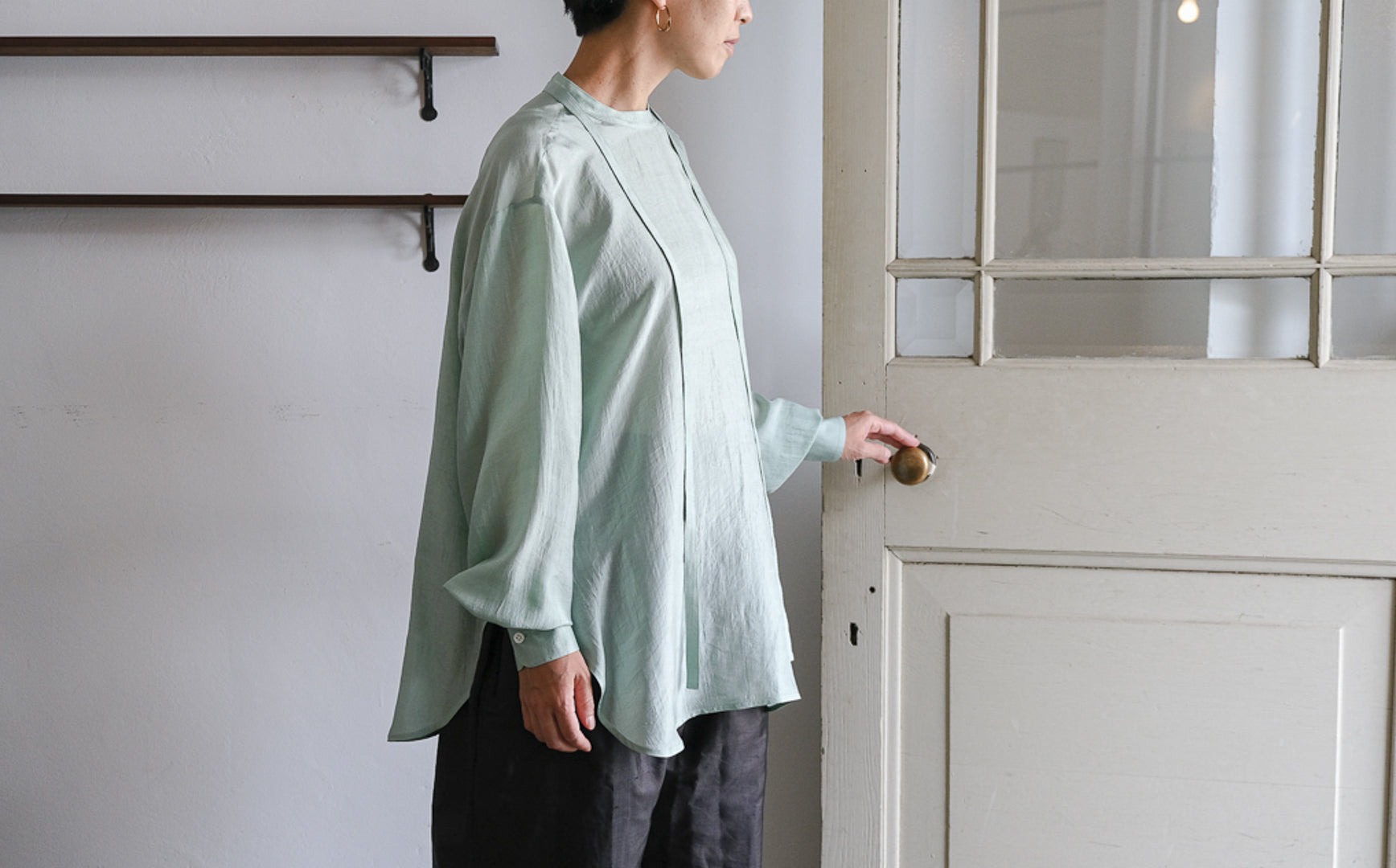 手織りならではの表情あるシルク生地。装いに品のよさとつやを添えてくれます。 前後どちらでも着ることができるので、気分に合わせて着こなしに変化をつけることができます。開きを前にすれば深いVネック開きが印象的なブラウスに、開きを後ろにすればハイネックブラウスのよう。