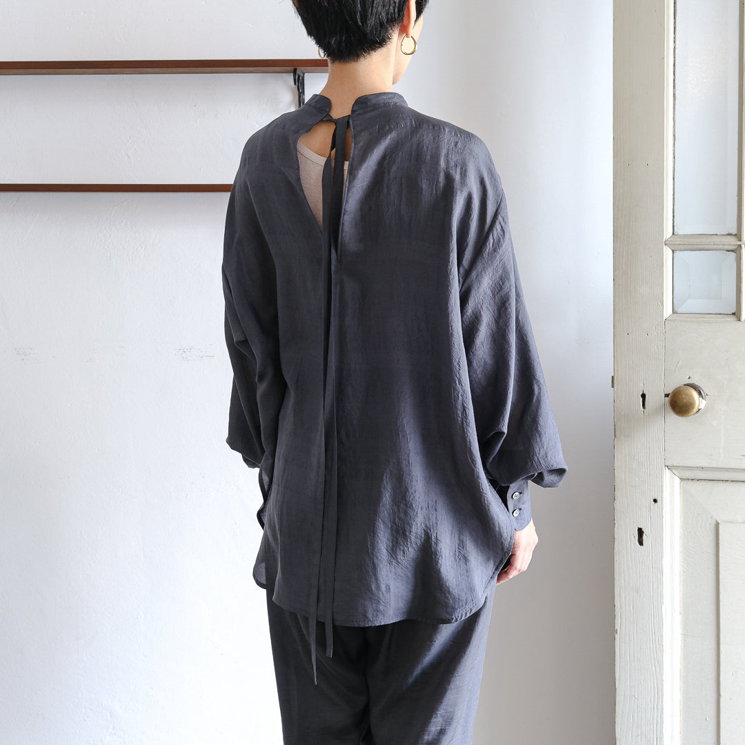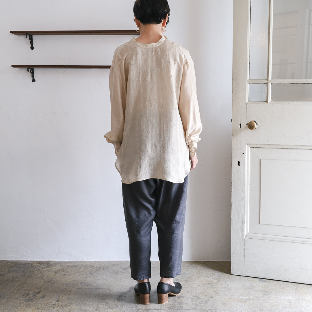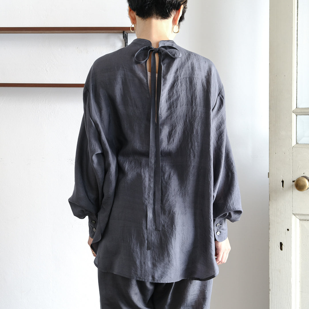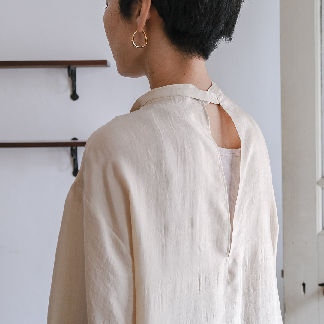 手織りならではの表情あるシルク生地。装いに品のよさとつやを添えてくれます。 前後どちらでも着ることができるので、気分に合わせて着こなしに変化をつけることができます。開きを前にすれば深いVネック開きが印象的なブラウスに、開きを後ろにすればハイネックブラウスのよう。