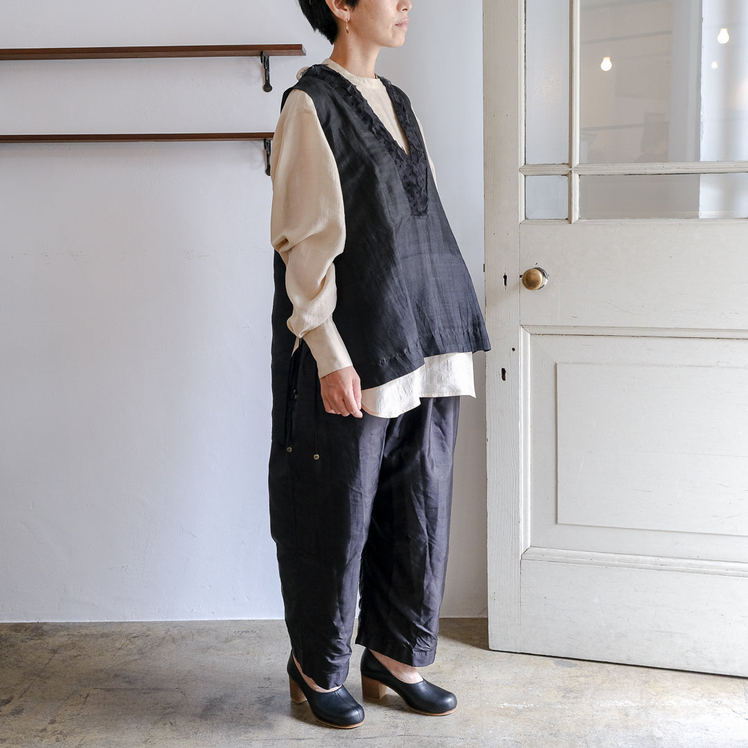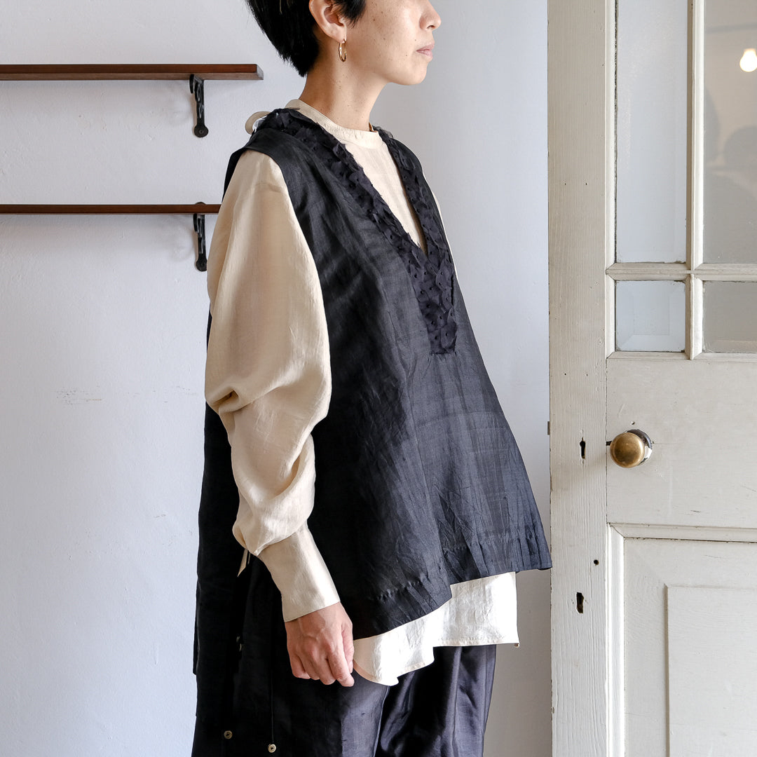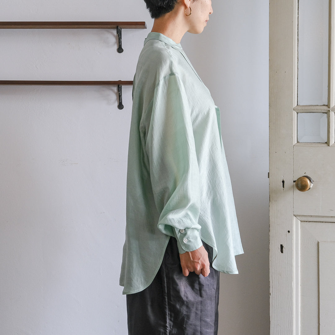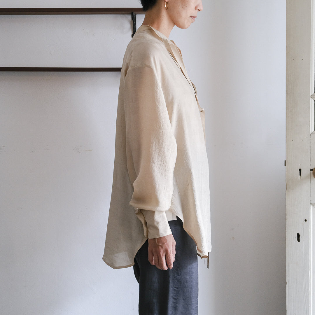 手織りならではの表情あるシルク生地。装いに品のよさとつやを添えてくれます。 前後どちらでも着ることができるので、気分に合わせて着こなしに変化をつけることができます。開きを前にすれば深いVネック開きが印象的なブラウスに、開きを後ろにすればハイネックブラウスのよう。