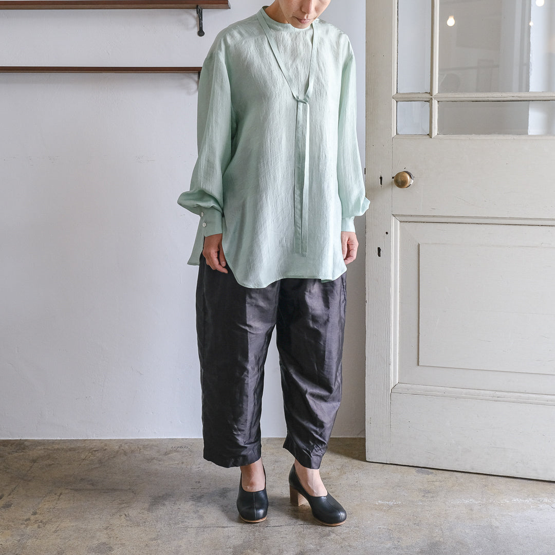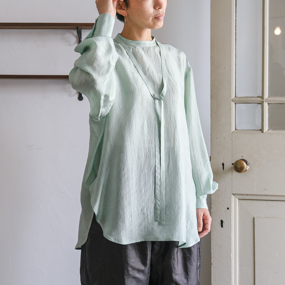 手織りのよさを感じるシルクを使ったボウタイブラウス。上品な印象でありながら、普段着にもなじむ、よそいきすぎない絶妙なバランスが魅力です。▲ミント