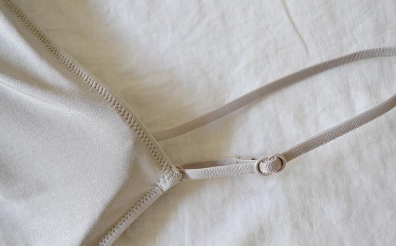 アンダーバストは伸びのよい細ゴムで、機能を保ちながら締めつけ感を抑えました。