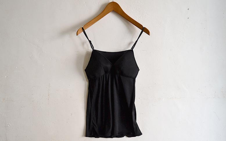 COCOONA SKINWEARの、ブラジャーとキャミソールが一体となったパデッドキャミソール。触ってみれば生地の柔らかなとろみと、空気のような軽さにきっと驚くはず。