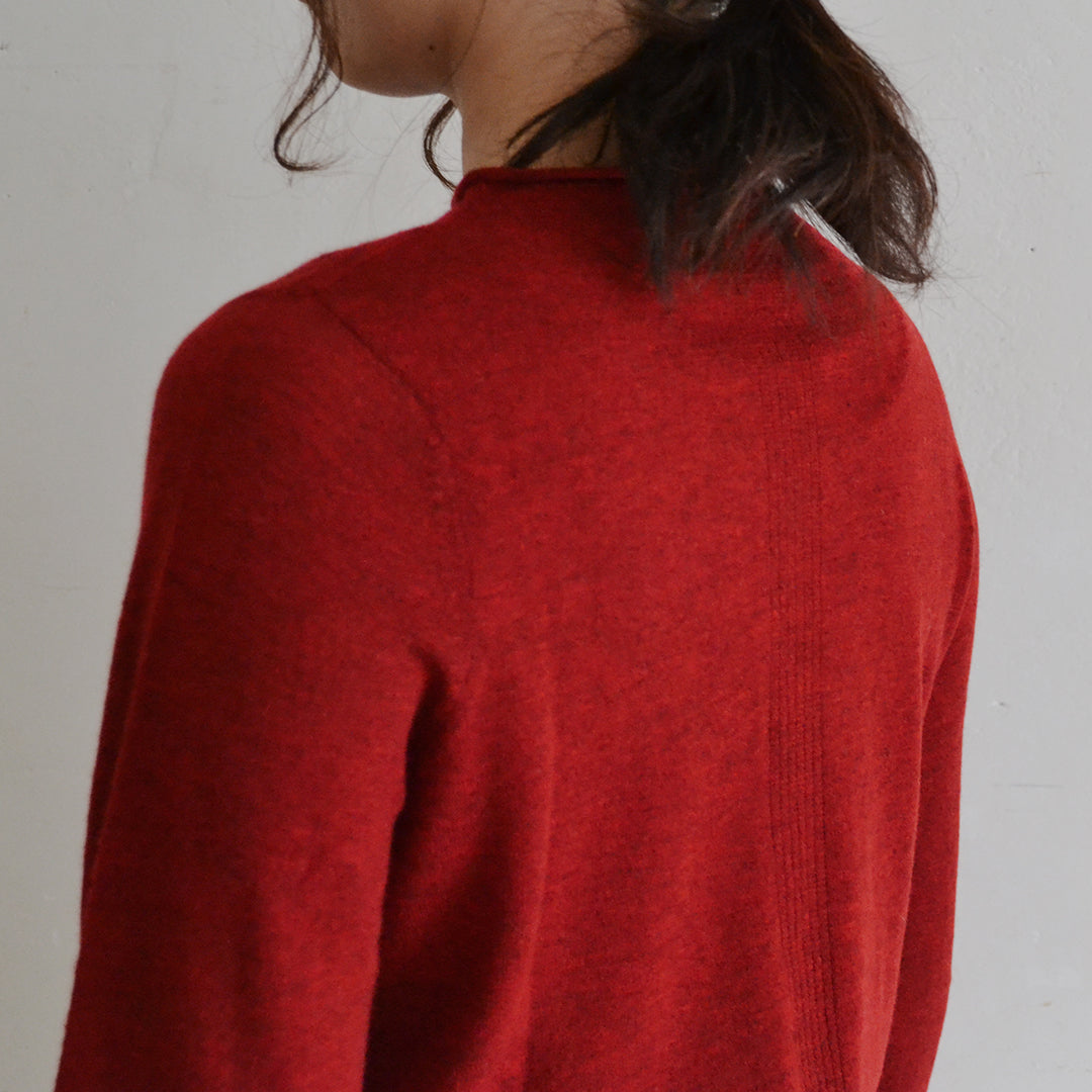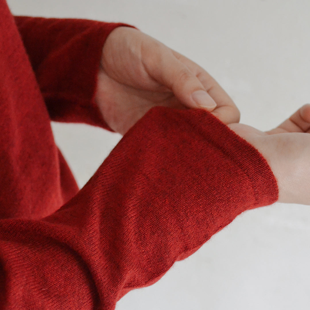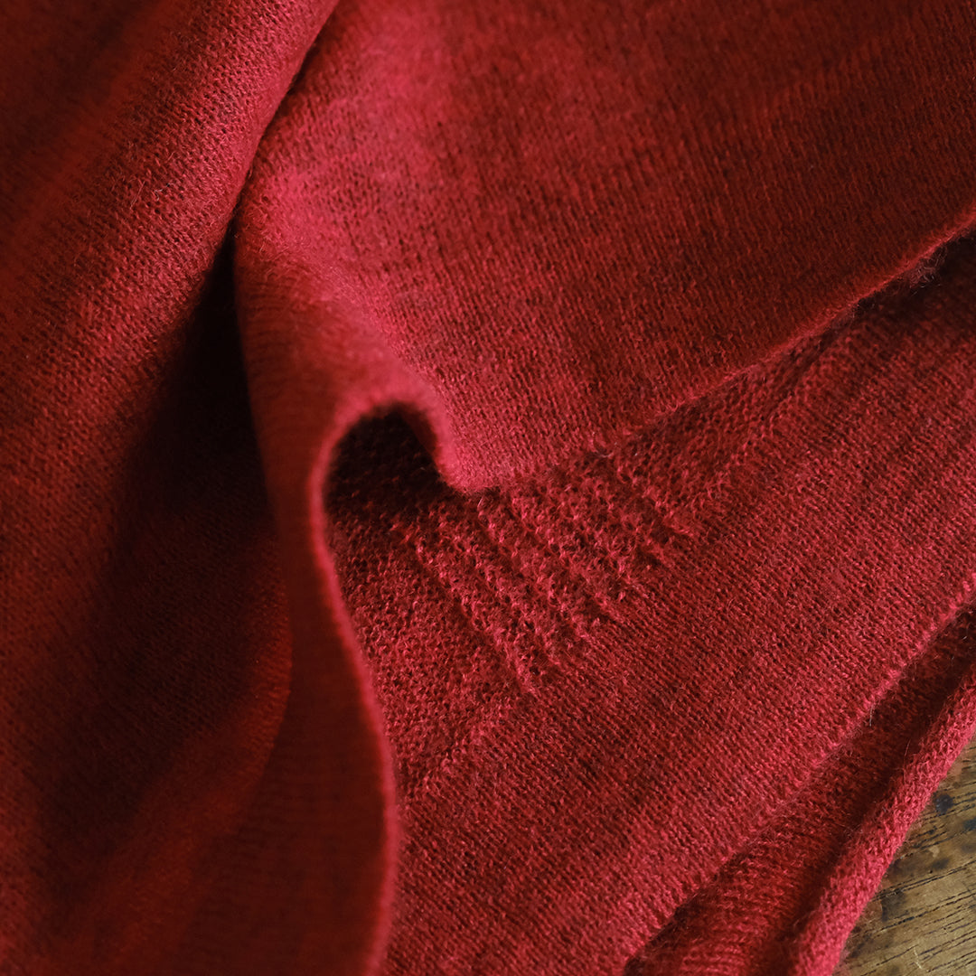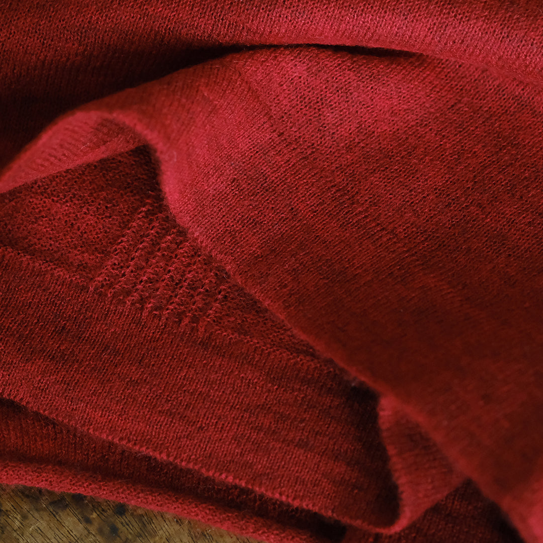 単色ではないカシミヤの赤は、肌写りもよくとても印象深い色味です。