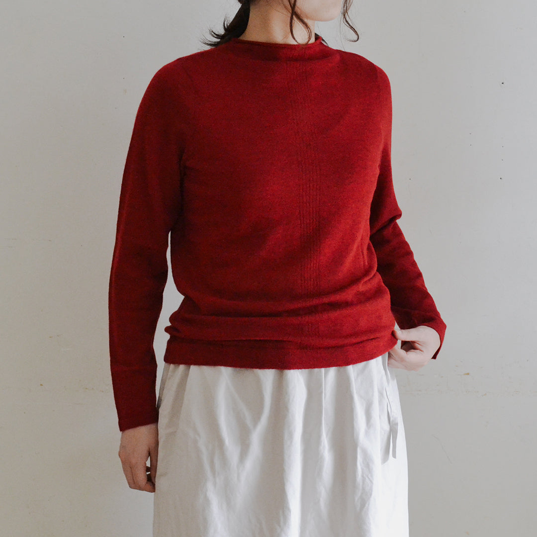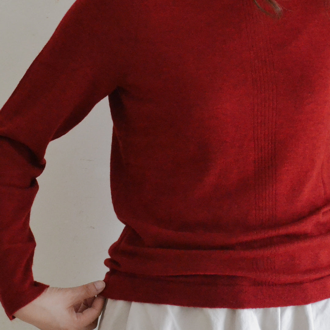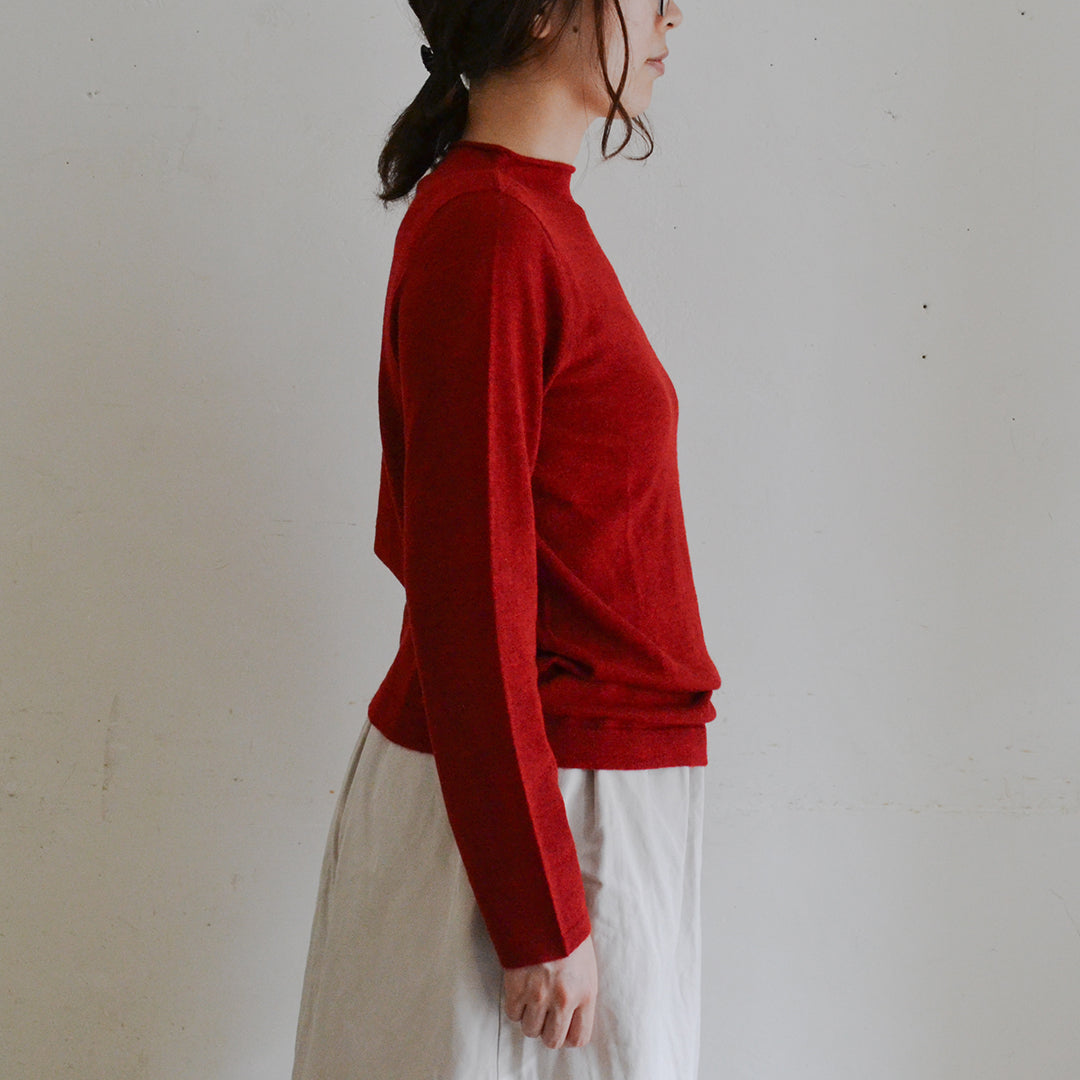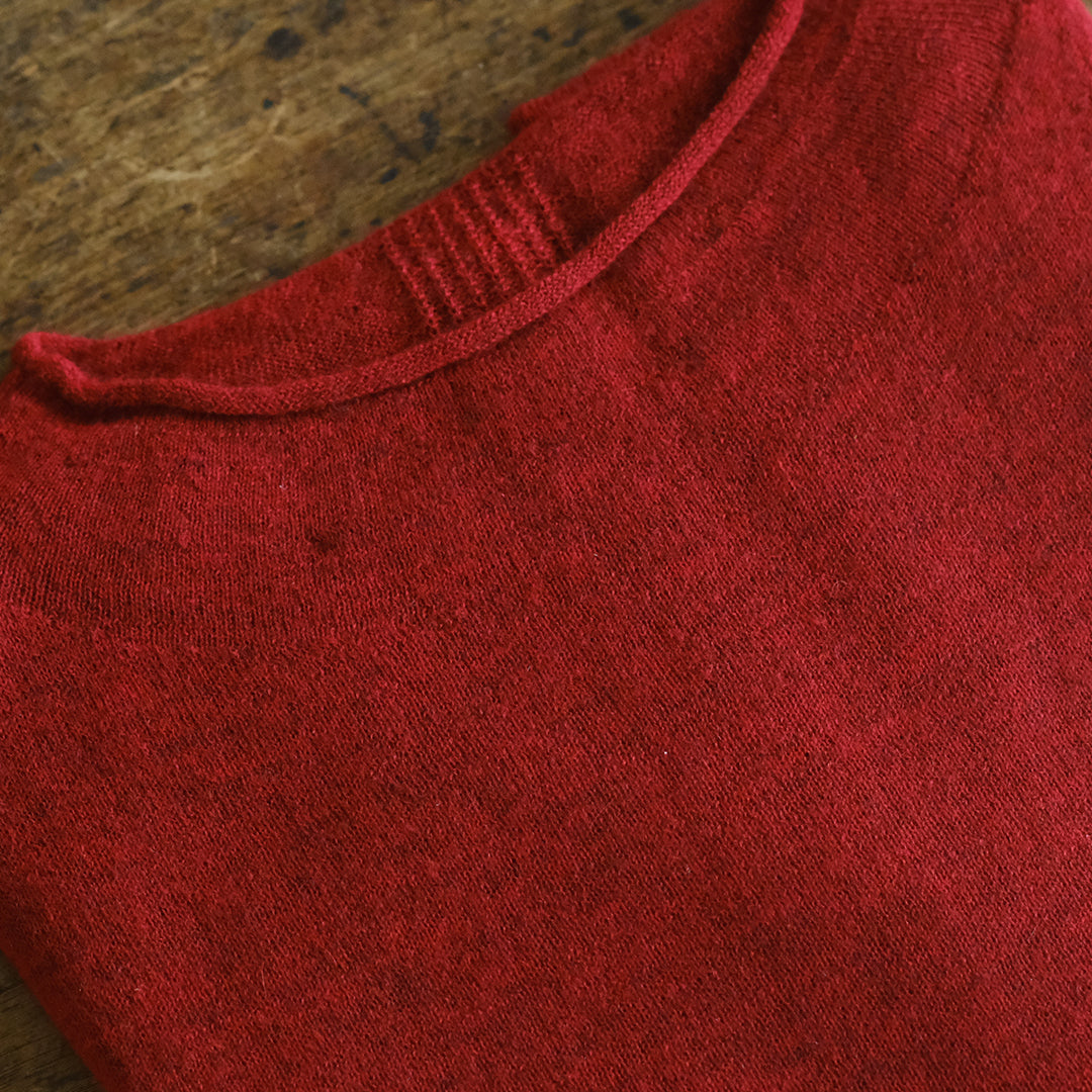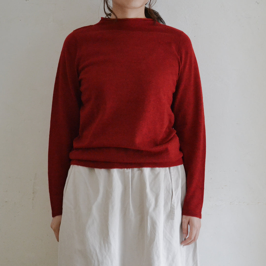 単色ではないカシミヤの赤は、肌写りもよくとても印象深い色味です。