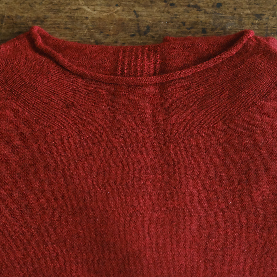 インナーとして使いやすいよう、袖や裾口は袋編みですっきりと身体に沿うように。