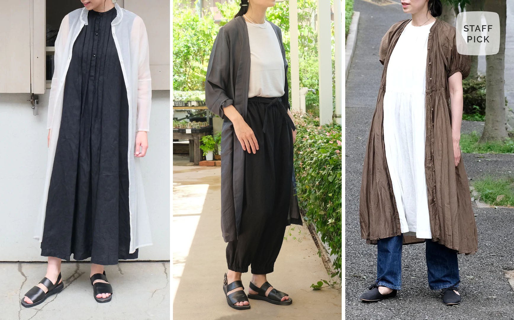 優しいヴェールのようなオーガンジーダイワンピースは、さらりとしたコットンシルク素材。長袖ですが、透け感と軽い生地感が涼しげで、夏の羽織に最適です。 ▲[SALUÉ]ピンタックノースリーブドレス/ミッドウェイトリネンの上に着て ワンピースの雰囲気を壊すことなく、よりやわらかな印象に