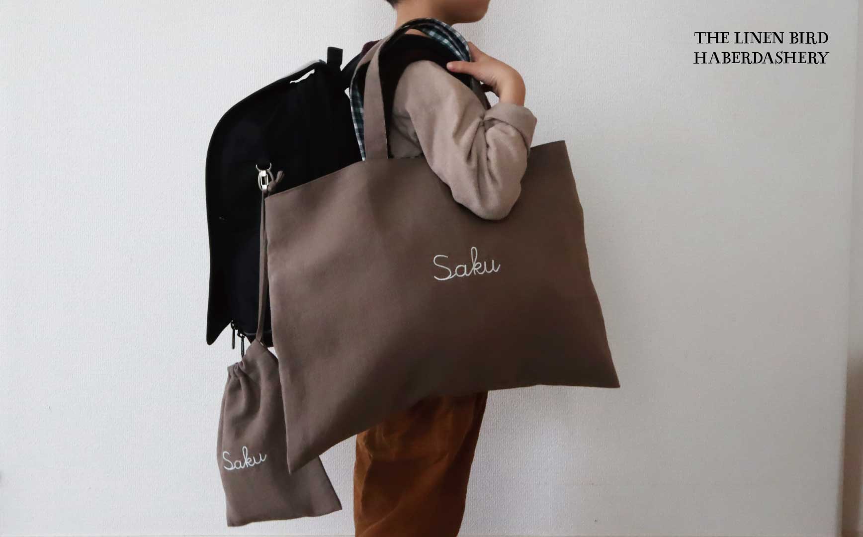 THE LINENBIRD HABERDASHERYが提案するトートバッグ、巾着袋(大)、巾着袋(小)の3点セットの入園・入学グッズ。